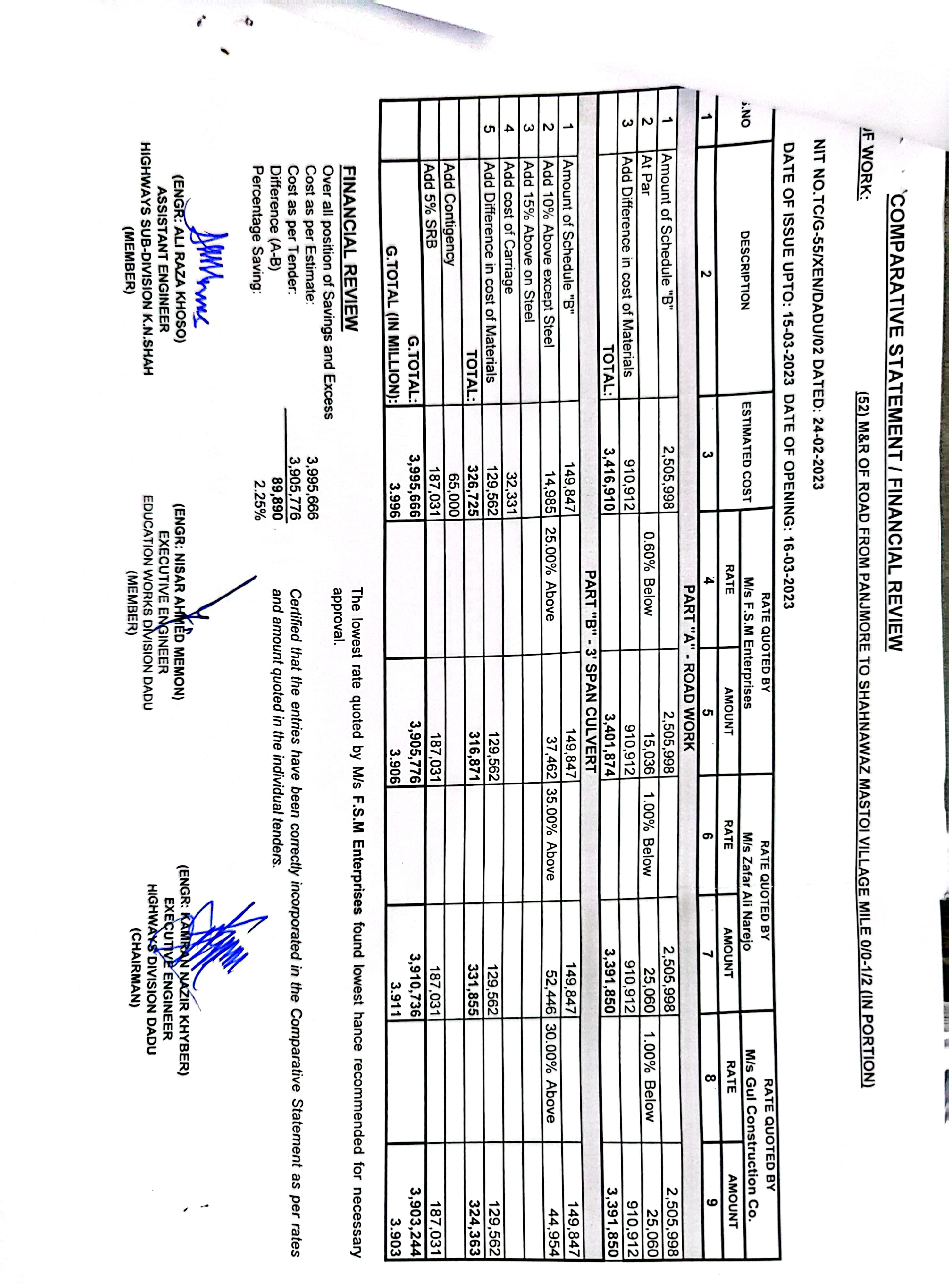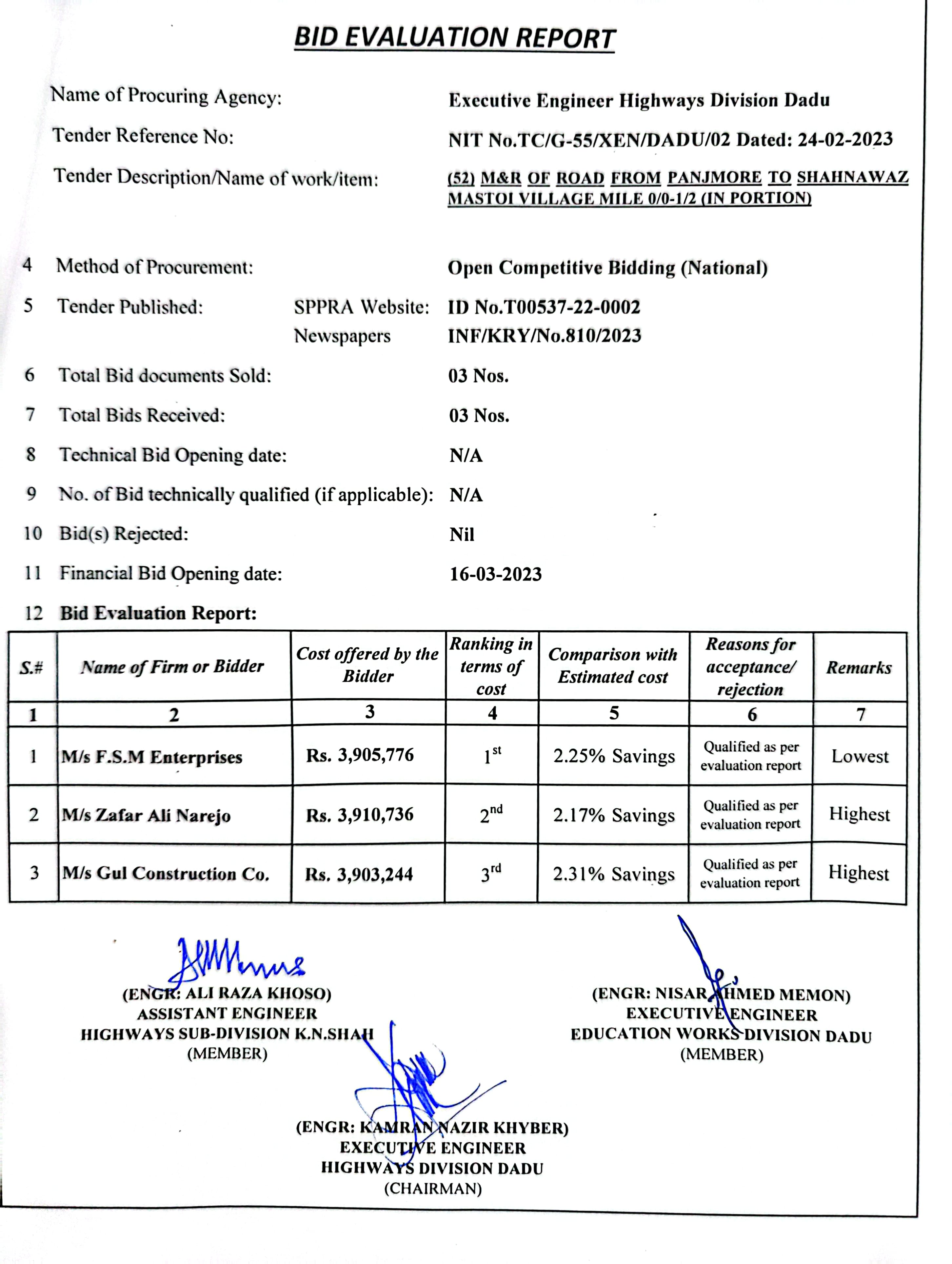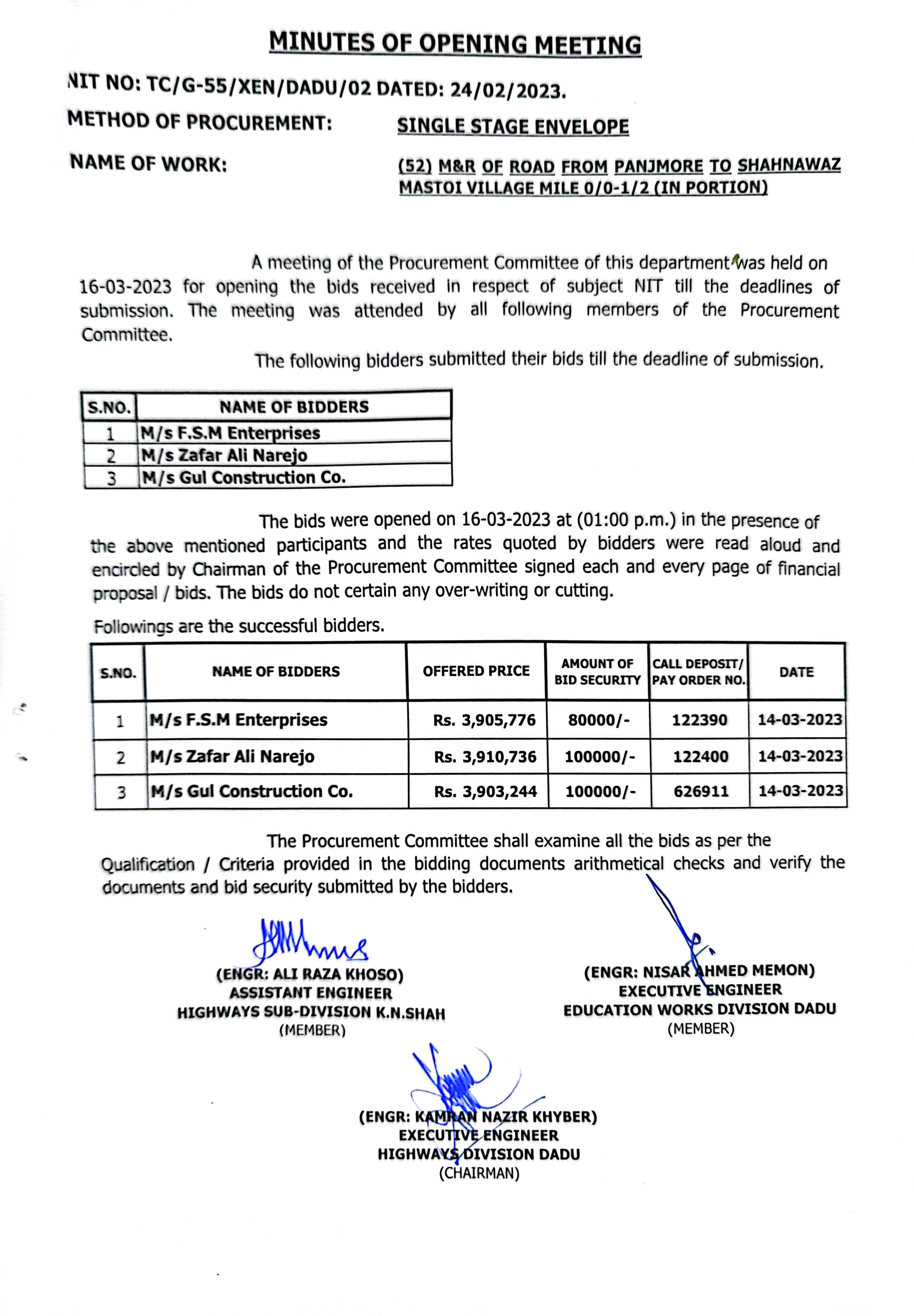 | T00537-22-0002 | BE00537-22-0002-52 | M&R of road from Panimore to Shahnawaz Mastoi village mile 0/0- 4 1/2 (in portion) | Executive Engineer Highway Division Dadu (51-Works and Services Department) | 06-04-2023 | Dadu | Active |