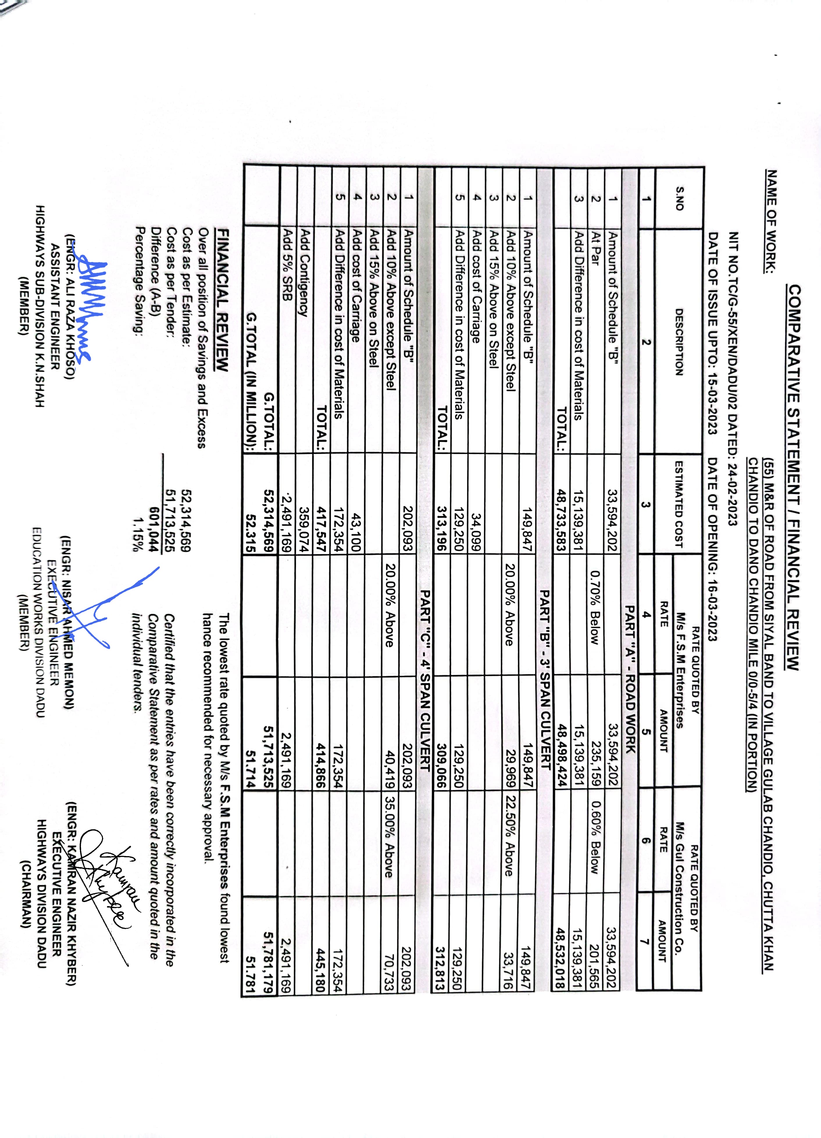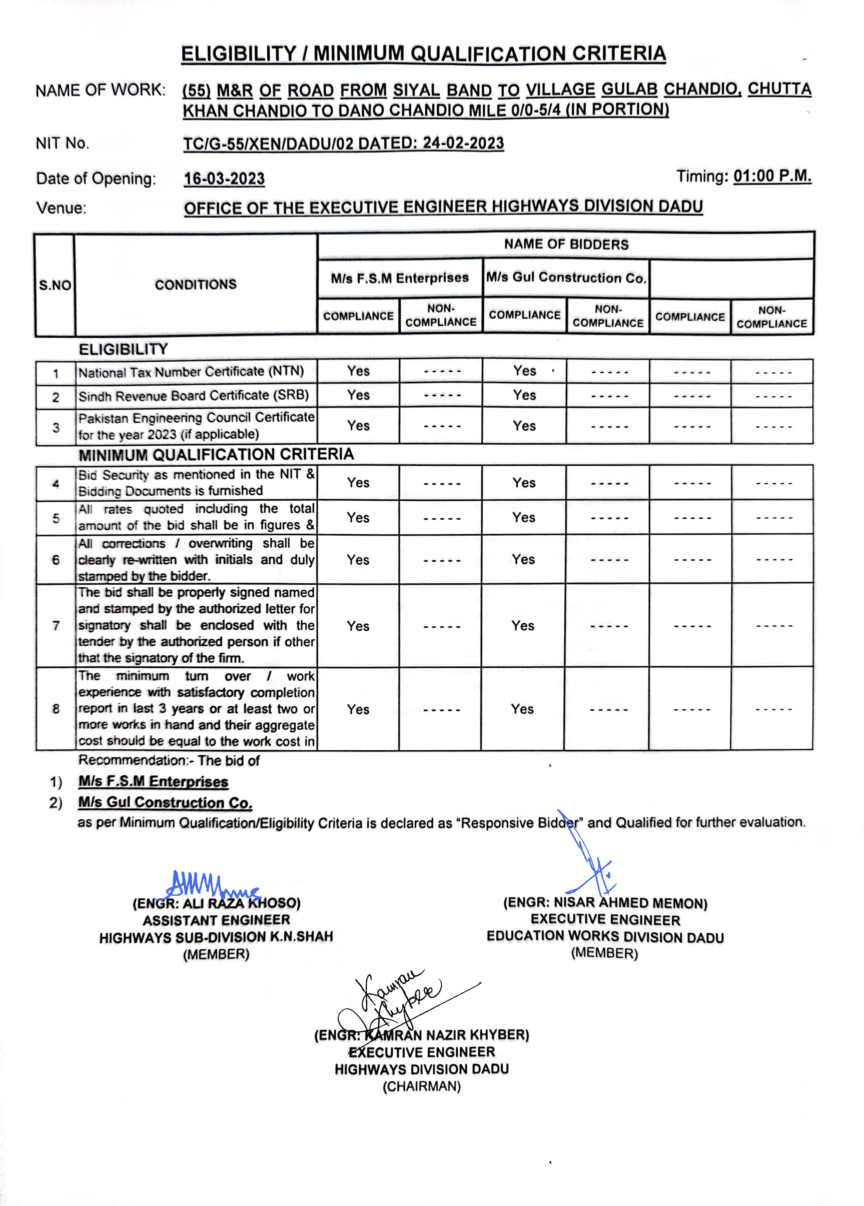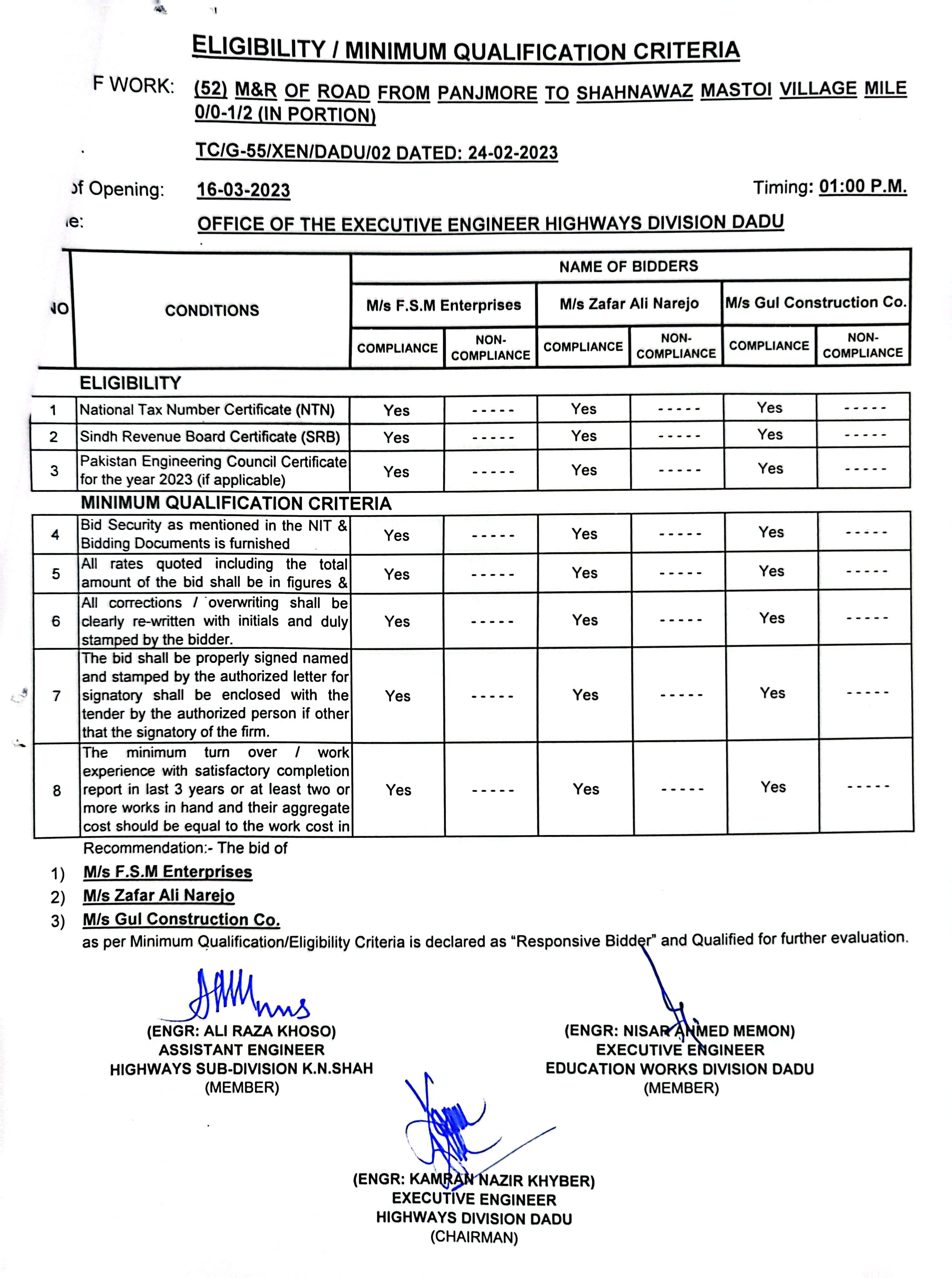 | T00537-22-0002 | BE00537-22-0002-52 | M&R of road from Panimore to Shahnawaz Mastoi village mile 0/0- 4 1/2 (in portion) | Executive Engineer Highway Division Dadu (51-Works and Services Department) | 06-04-2023 | Dadu | Active |