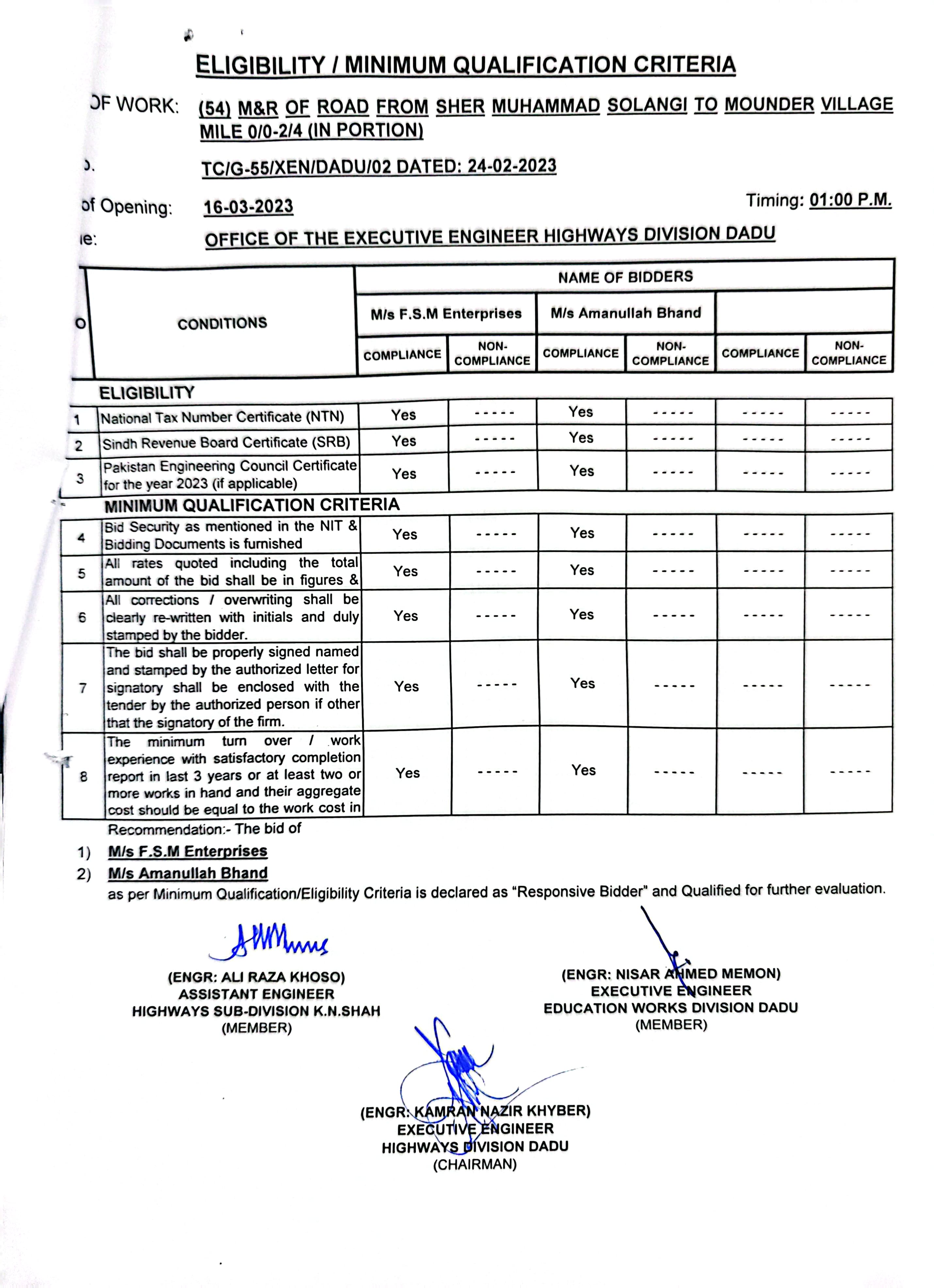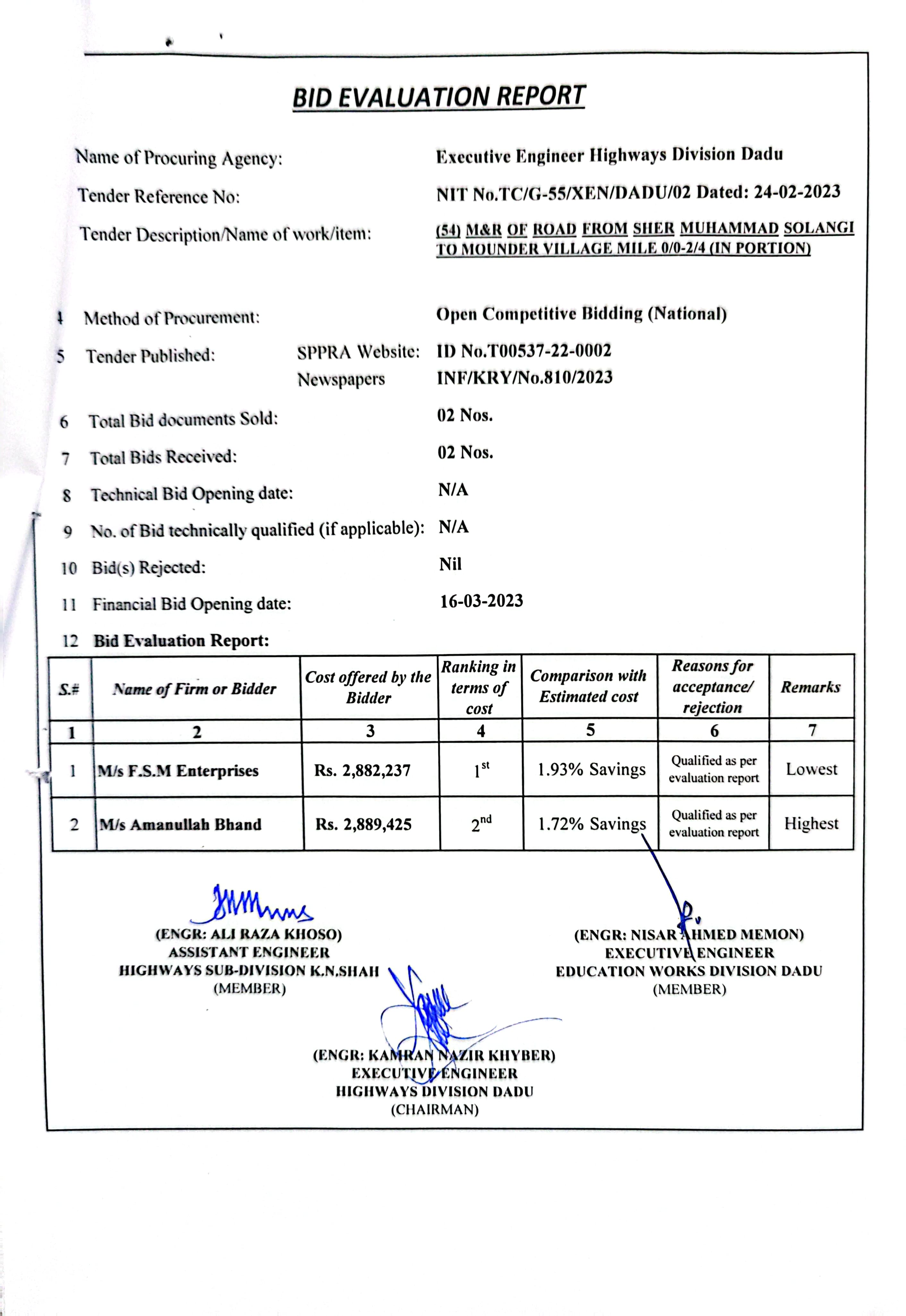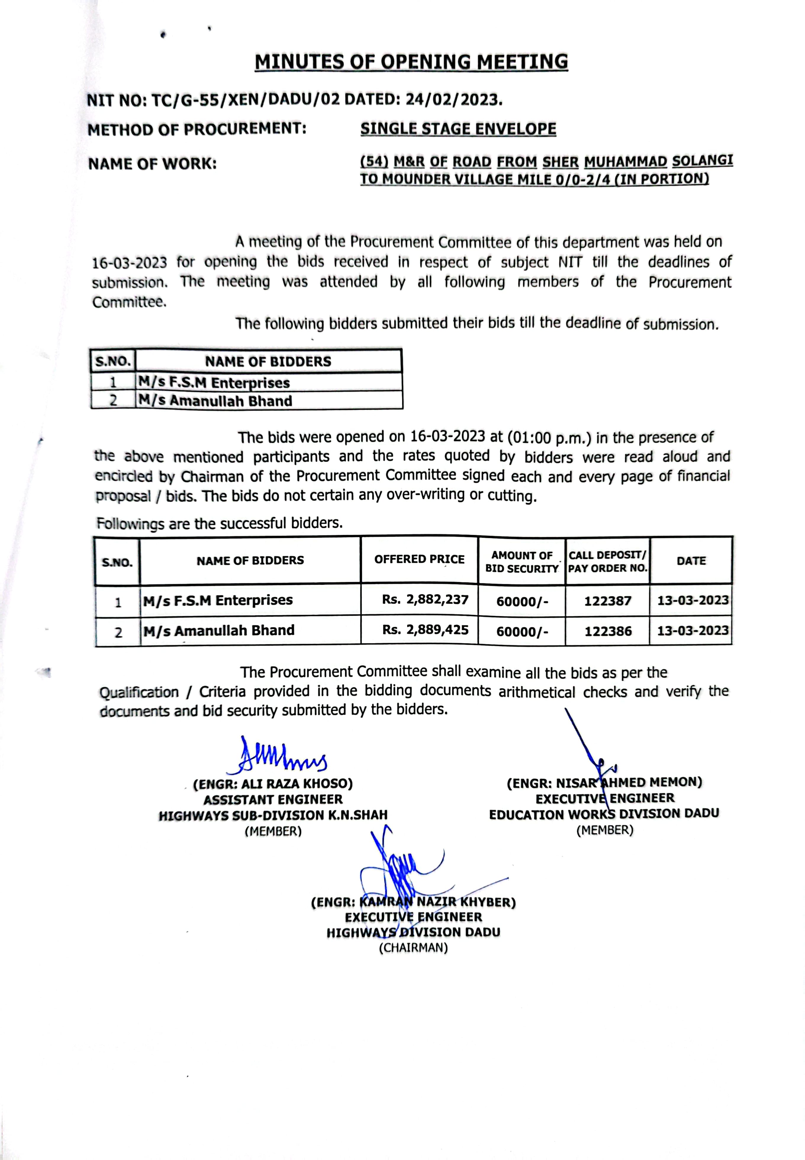 | T00537-22-0002 | BE00537-22-0002-54 | M&R of road from Sher Muhammad Solangi to Mounder village mile 2. 0/0-2/4 (in portion) | Executive Engineer Highway Division Dadu (51-Works and Services Department) | 06-04-2023 | Dadu | Active |