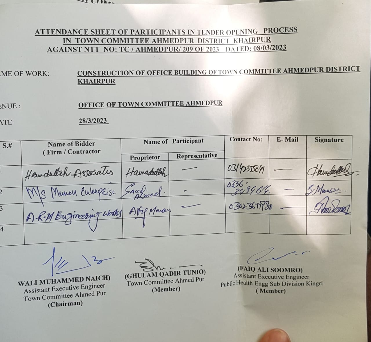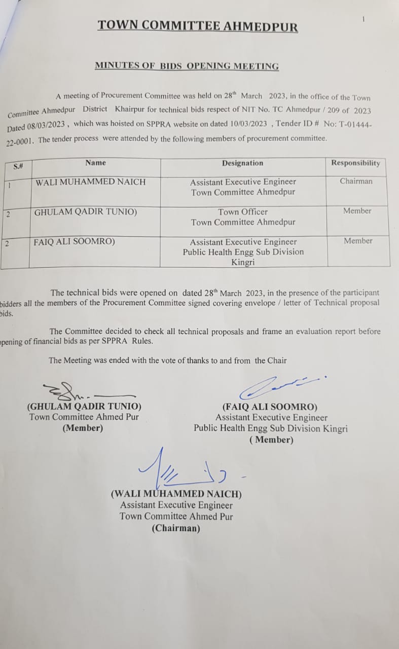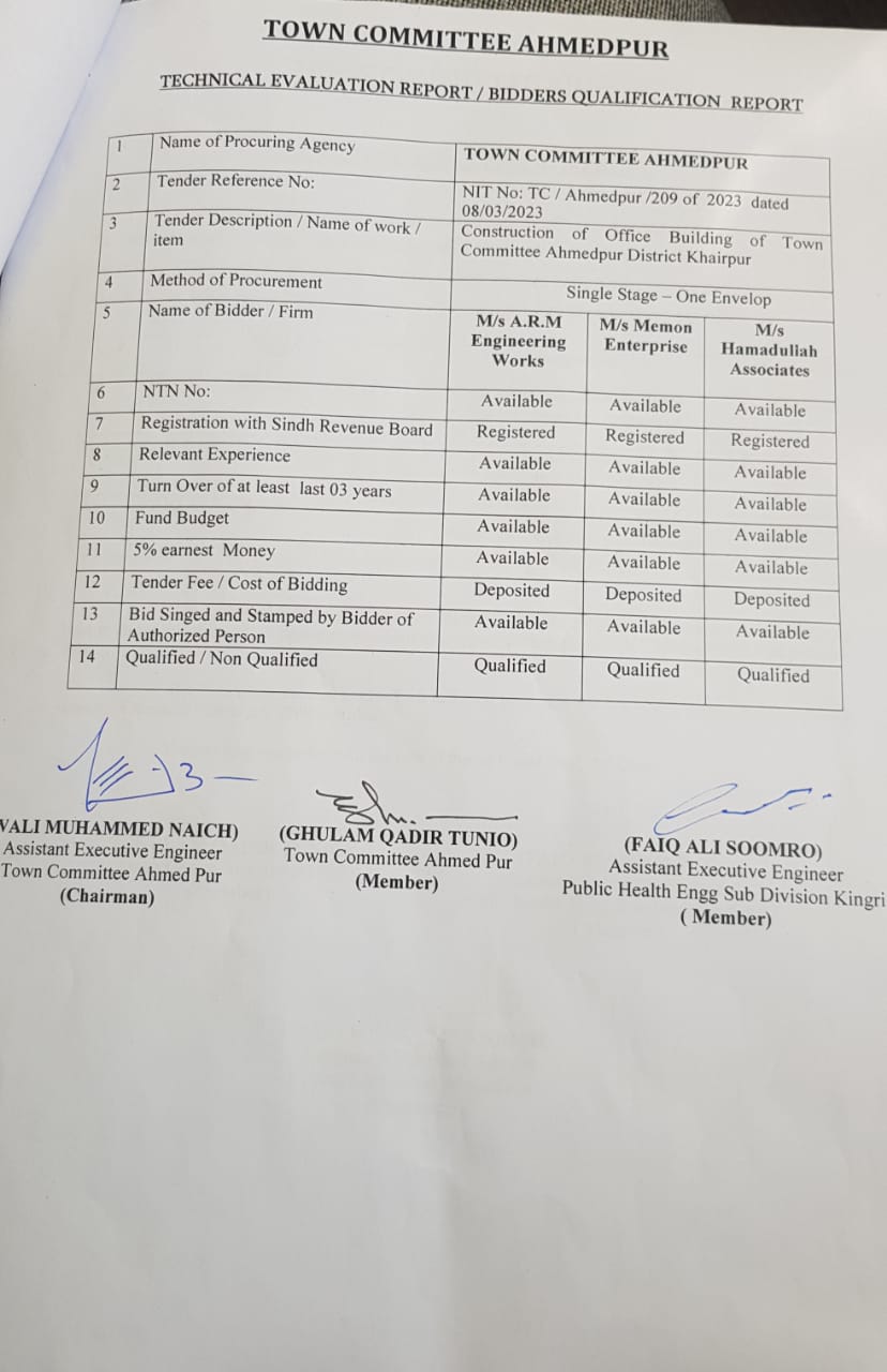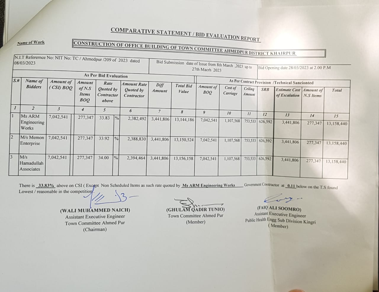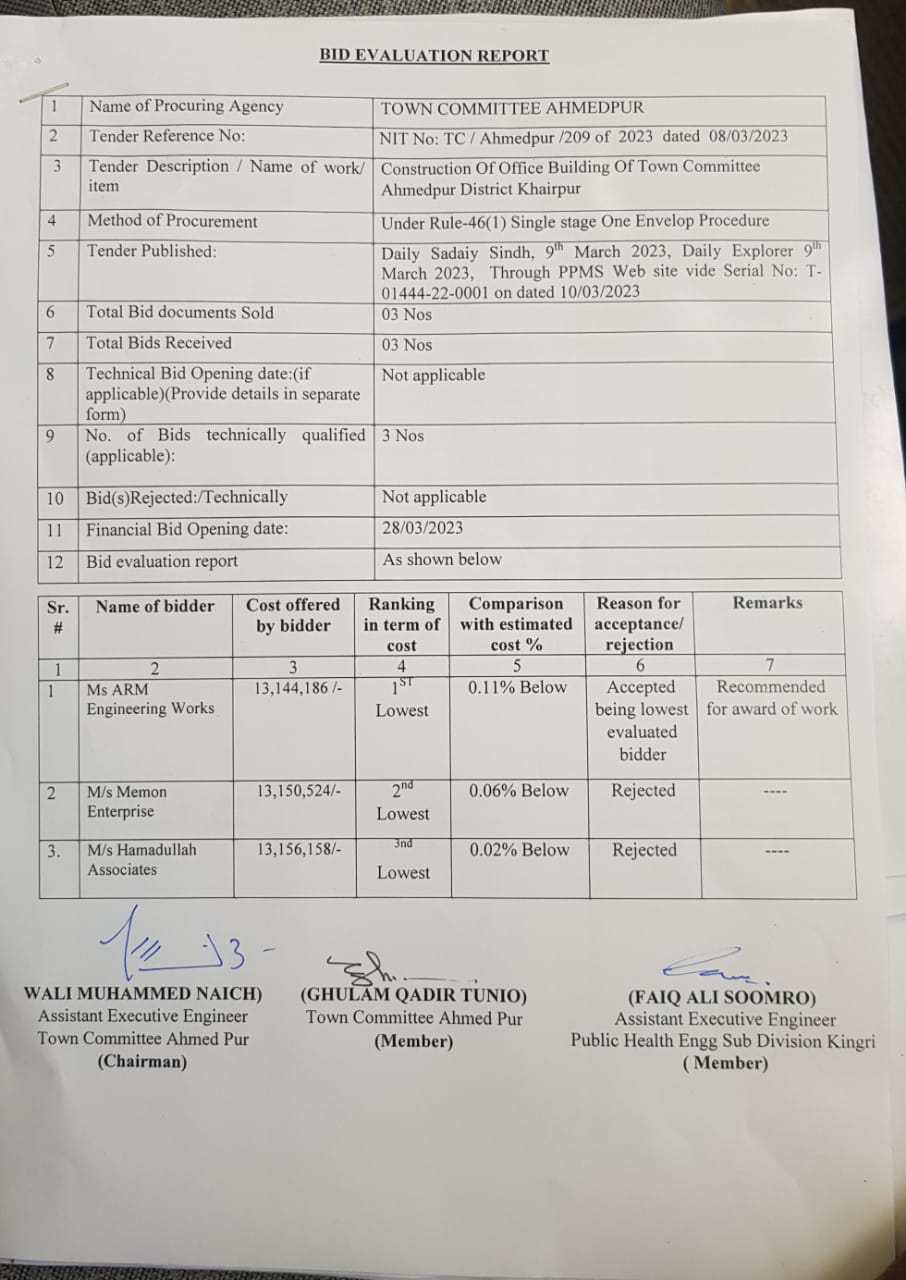 | T01444-22-0001 | BE01444-22-0001-1 | CONSTRUCTION OF OFFICE BUILDING OF TOWN COMMITTEE AHMEDPUR DISTRICT KHAIRPUR | Town Committee Ahmedpur (27-Local Government Department) | 29-03-2023 | Khairpur | Active |