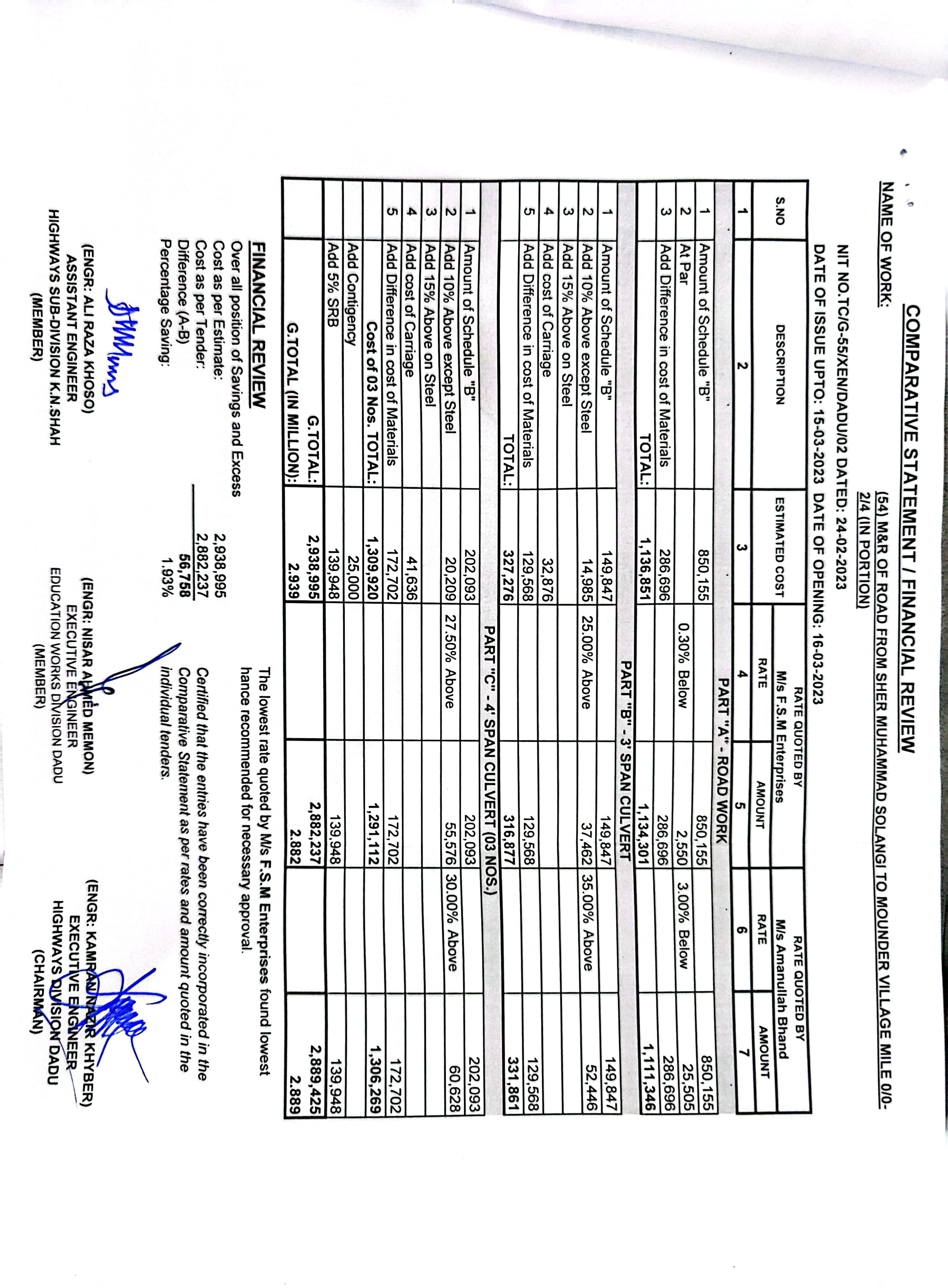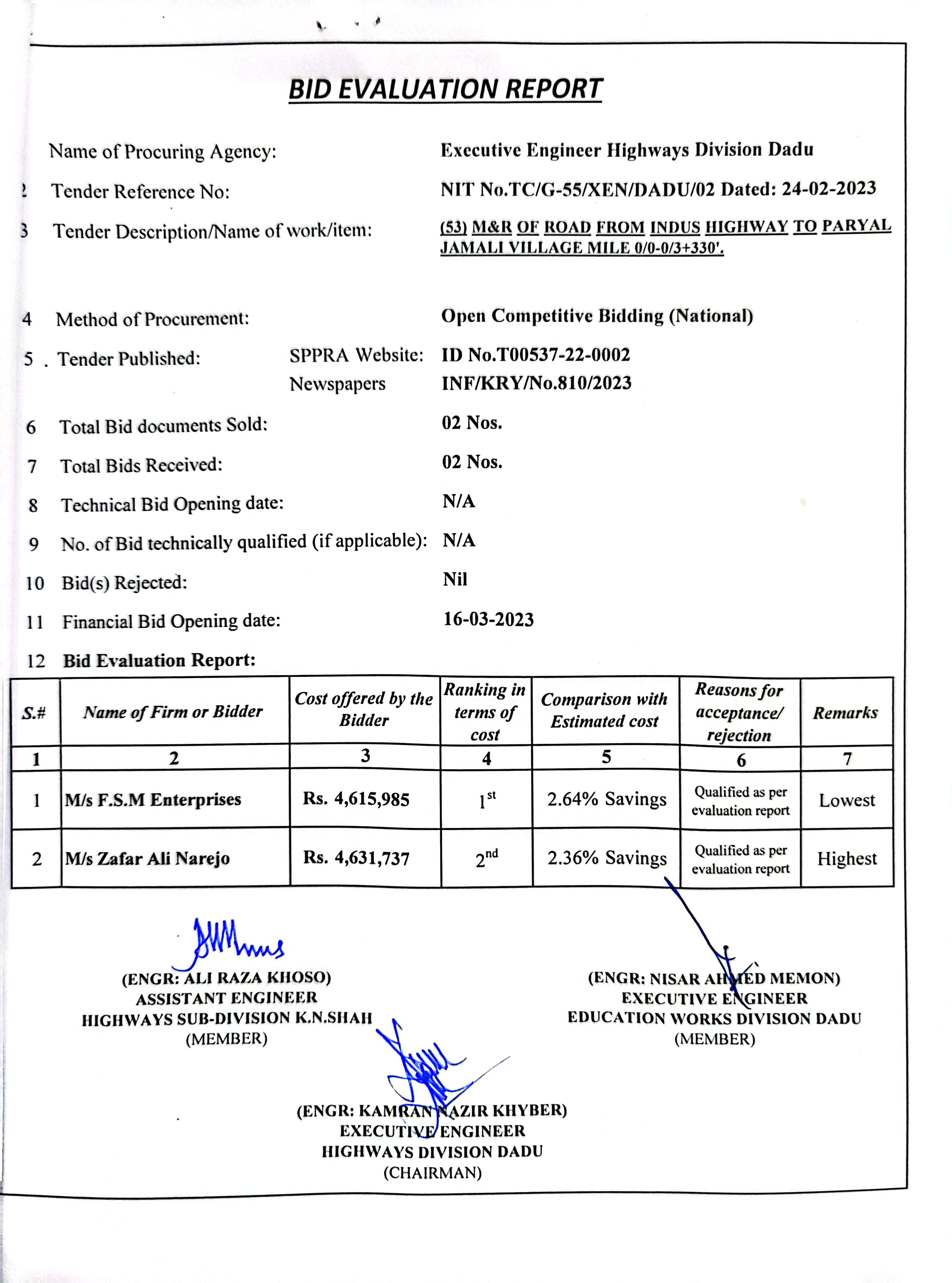 | T00537-22-0002 | BE00537-22-0002-53 | M&R of road from Indus Highway to Paryal Jamali village mile 0/0-4 0/3+330' | Executive Engineer Highway Division Dadu (51-Works and Services Department) | 06-04-2023 | Dadu | Active |