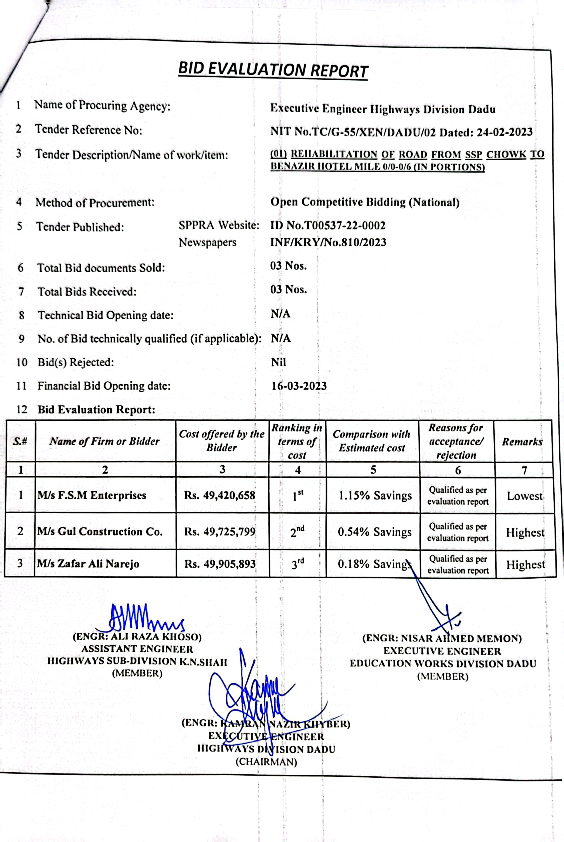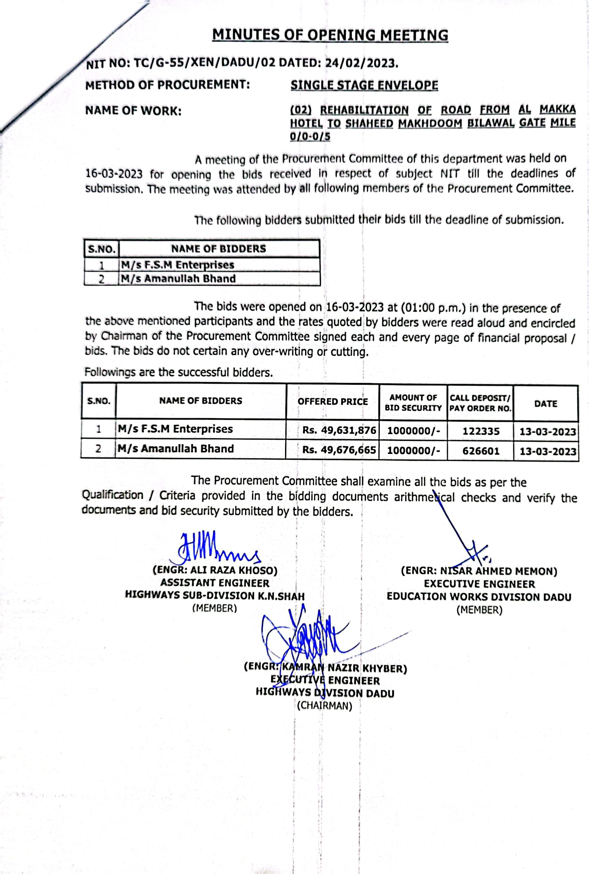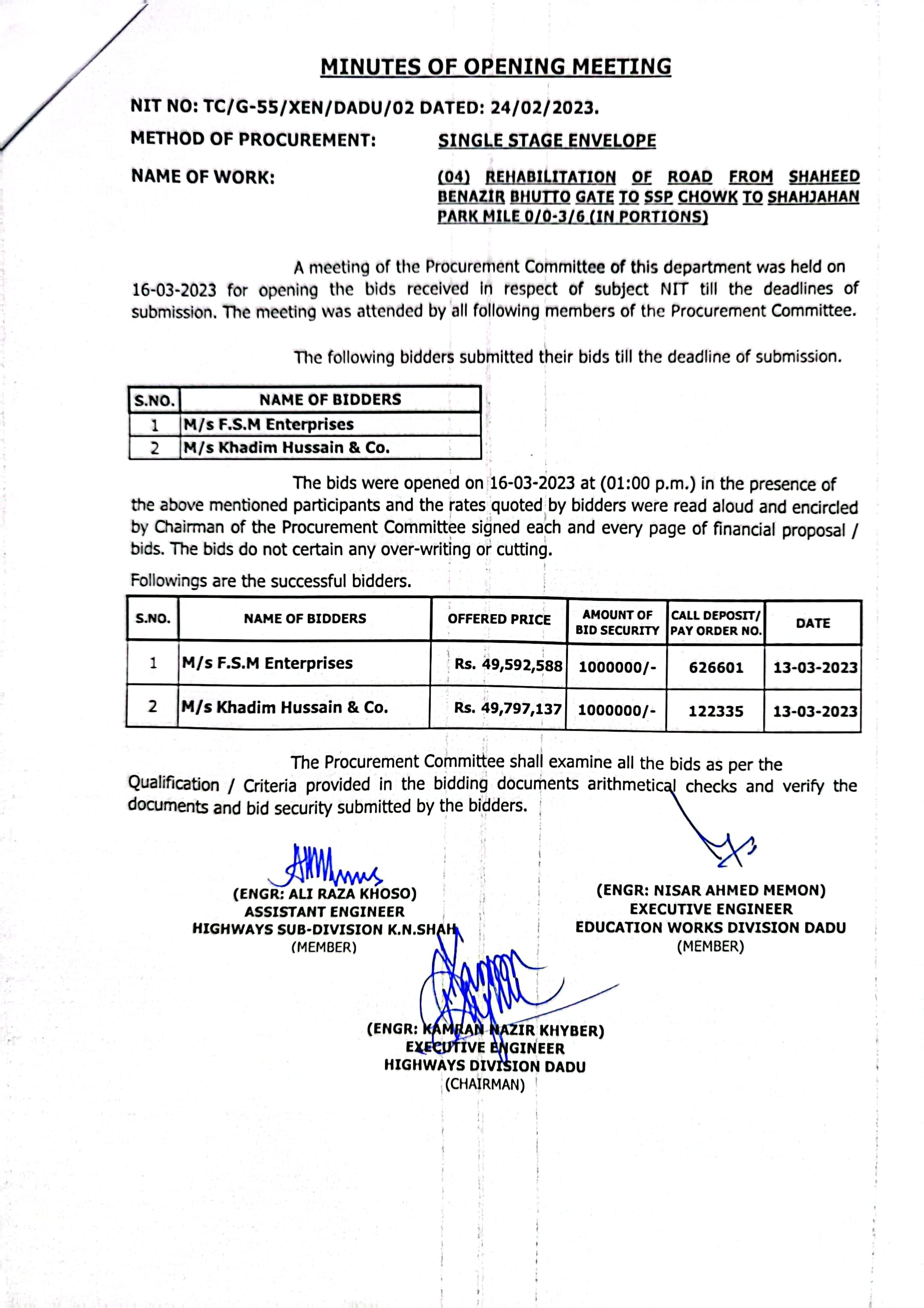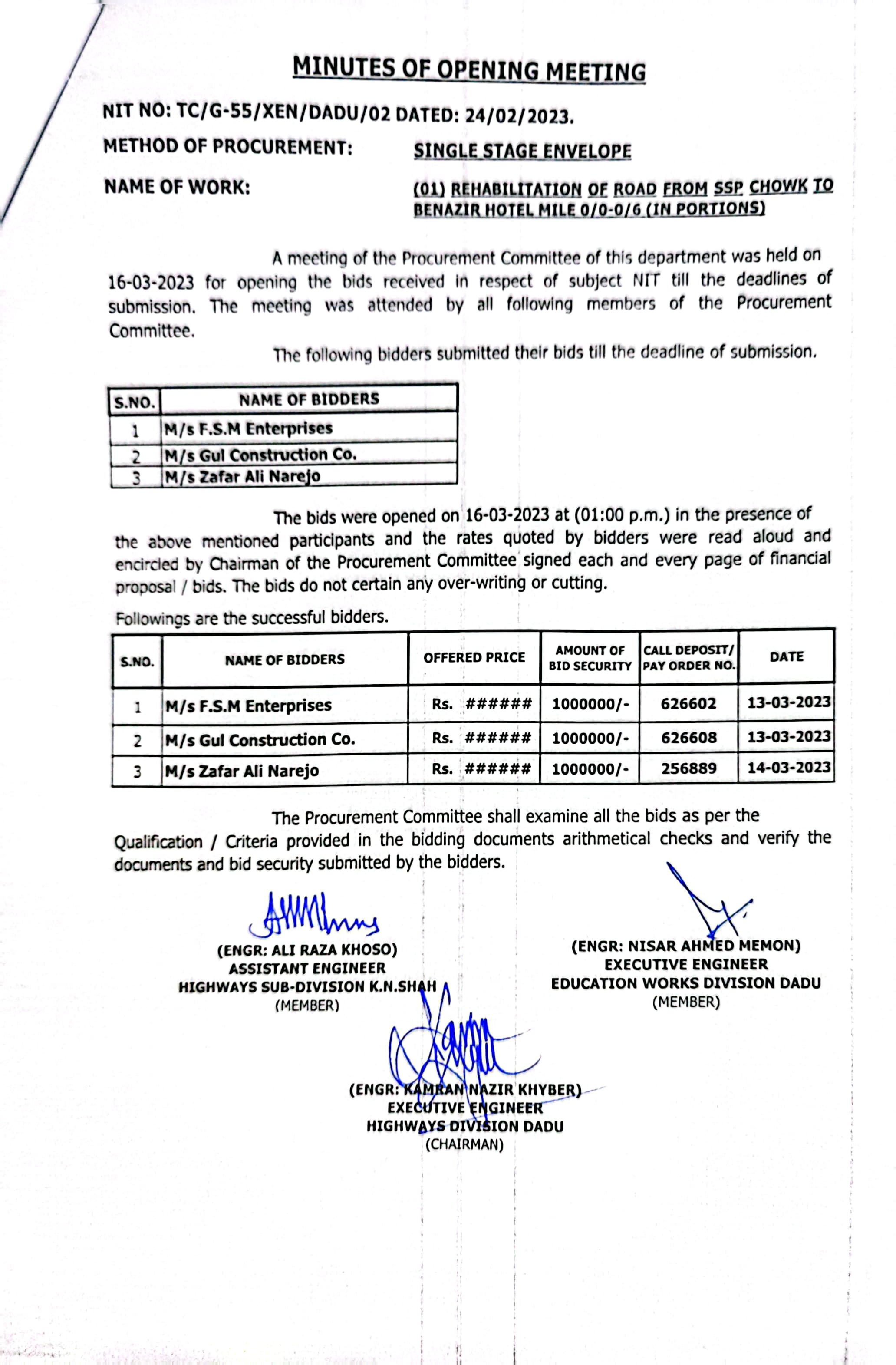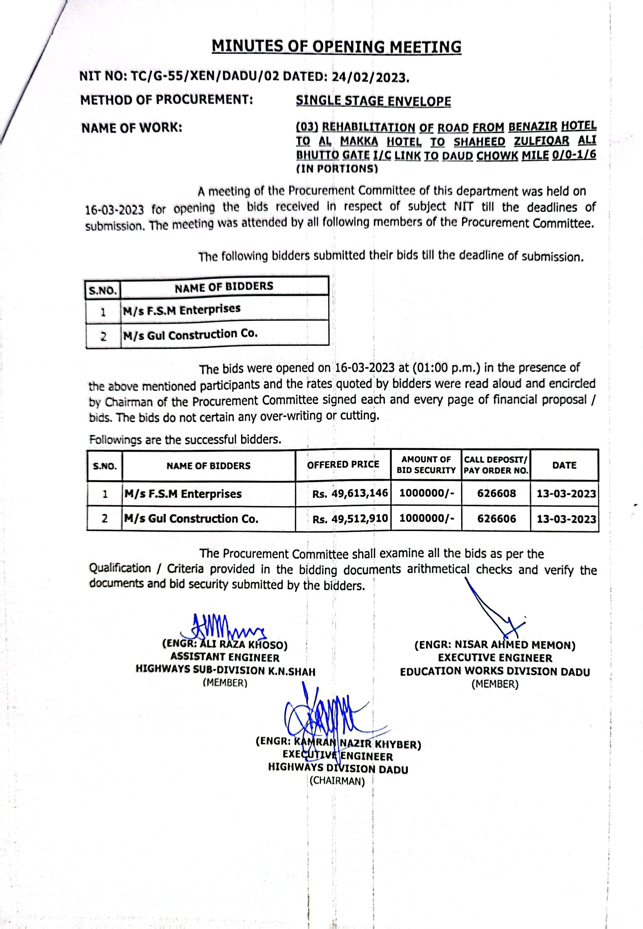 | T00537-22-0002 | BE00537-22-0003 | 3.Rehabilitation of road from Benazir Hotel to Al Makka Hotel to Shaheed Zulfiqar Ali Bhutto Gate i/c link to Daud Chowk mile 0/0-1/6 (in portions) | Executive Engineer Highway Division Dadu (51-Works and Services Department) | 20-03-2023 | Dadu | Active |