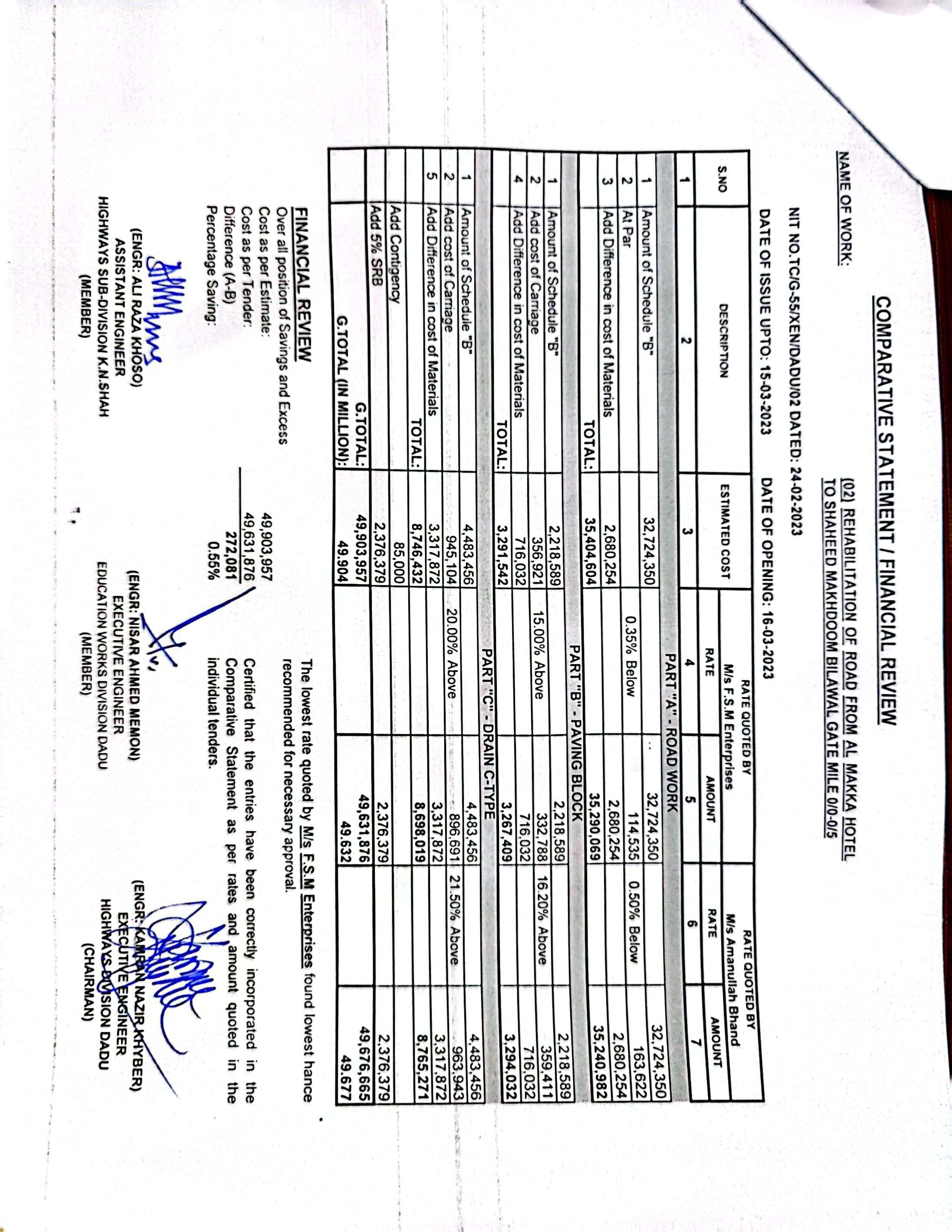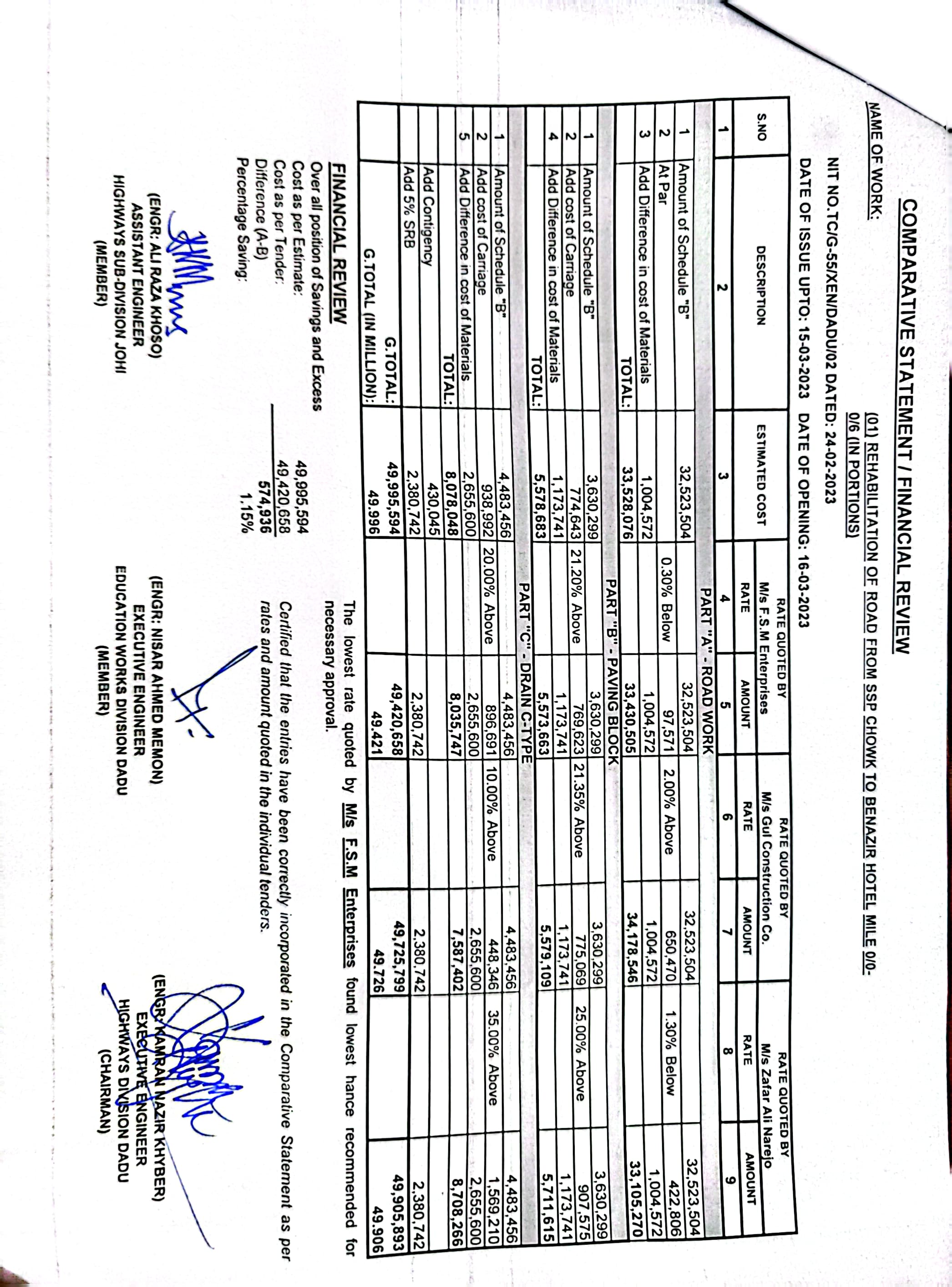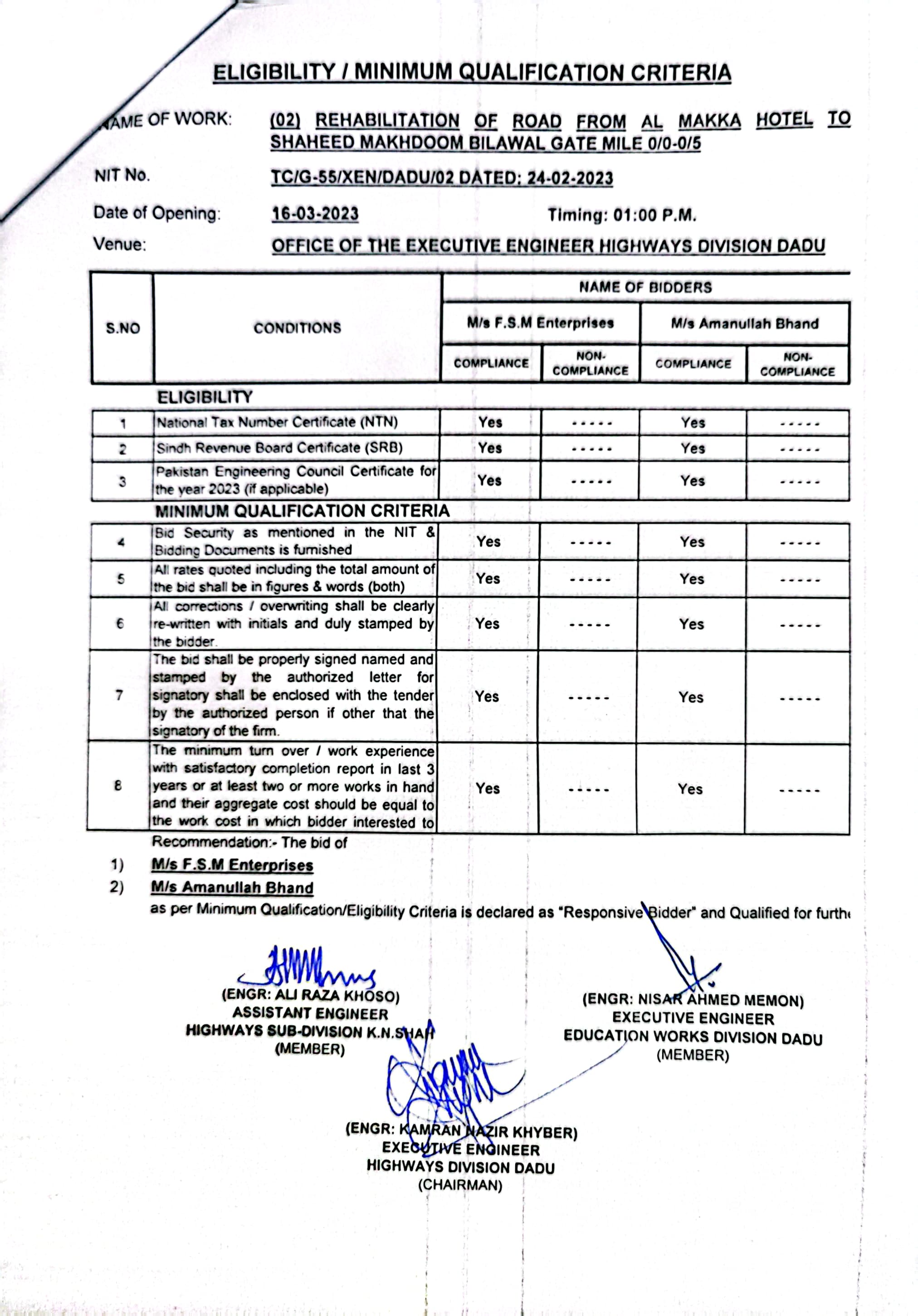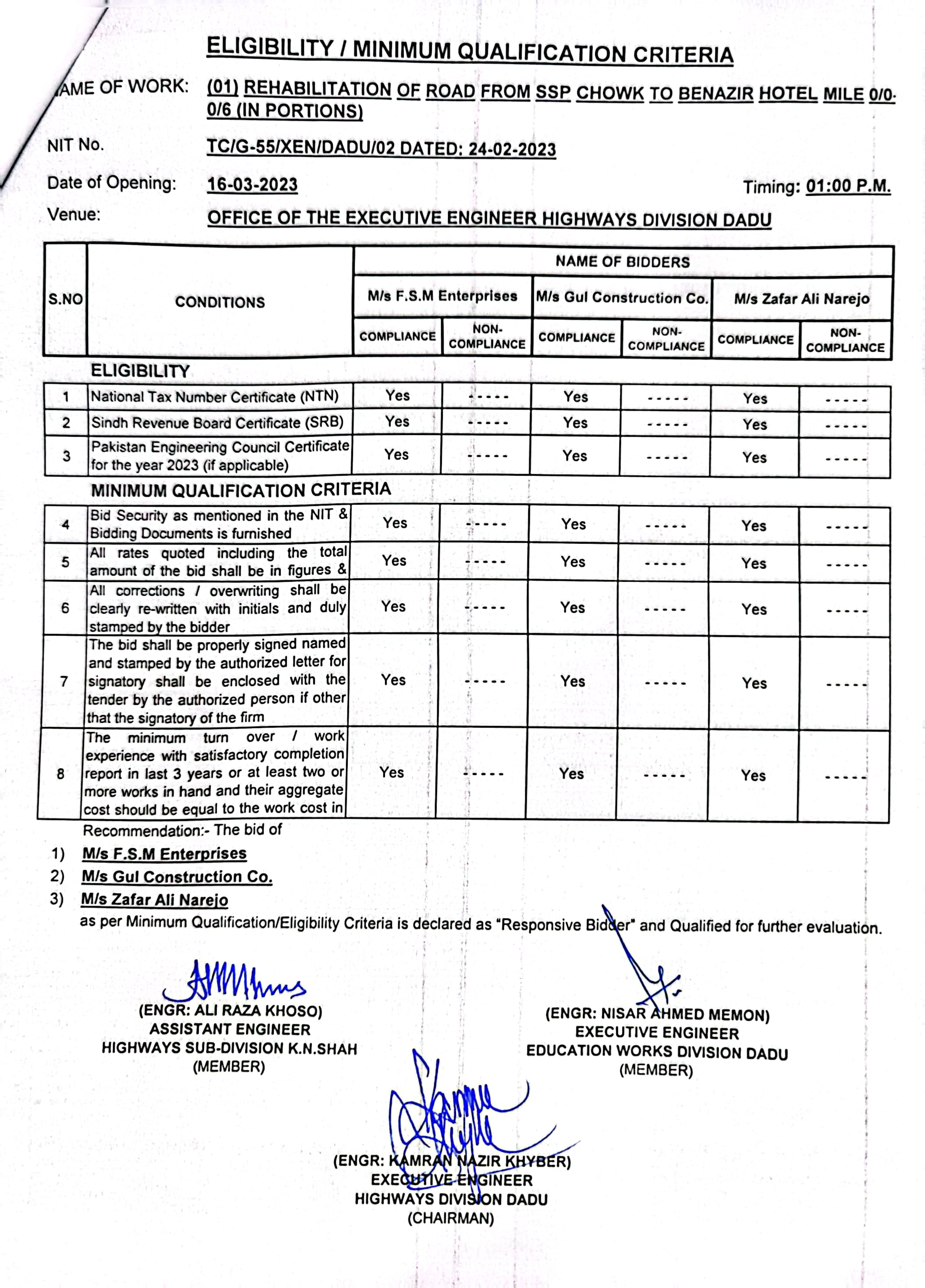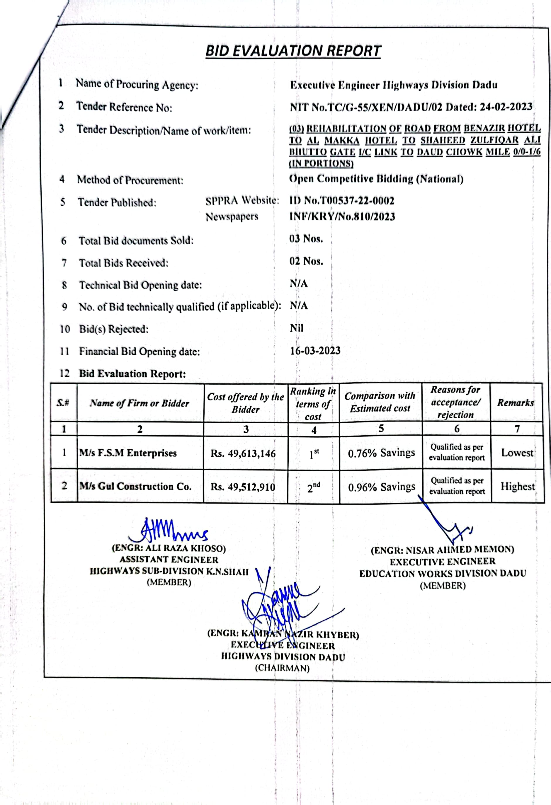| T00537-22-0002 | BE00537-22-0003 | 3.Rehabilitation of road from Benazir Hotel to Al Makka Hotel to Shaheed Zulfiqar Ali Bhutto Gate i/c link to Daud Chowk mile 0/0-1/6 (in portions) | Executive Engineer Highway Division Dadu (51-Works and Services Department) | 20-03-2023 | Dadu | Active |