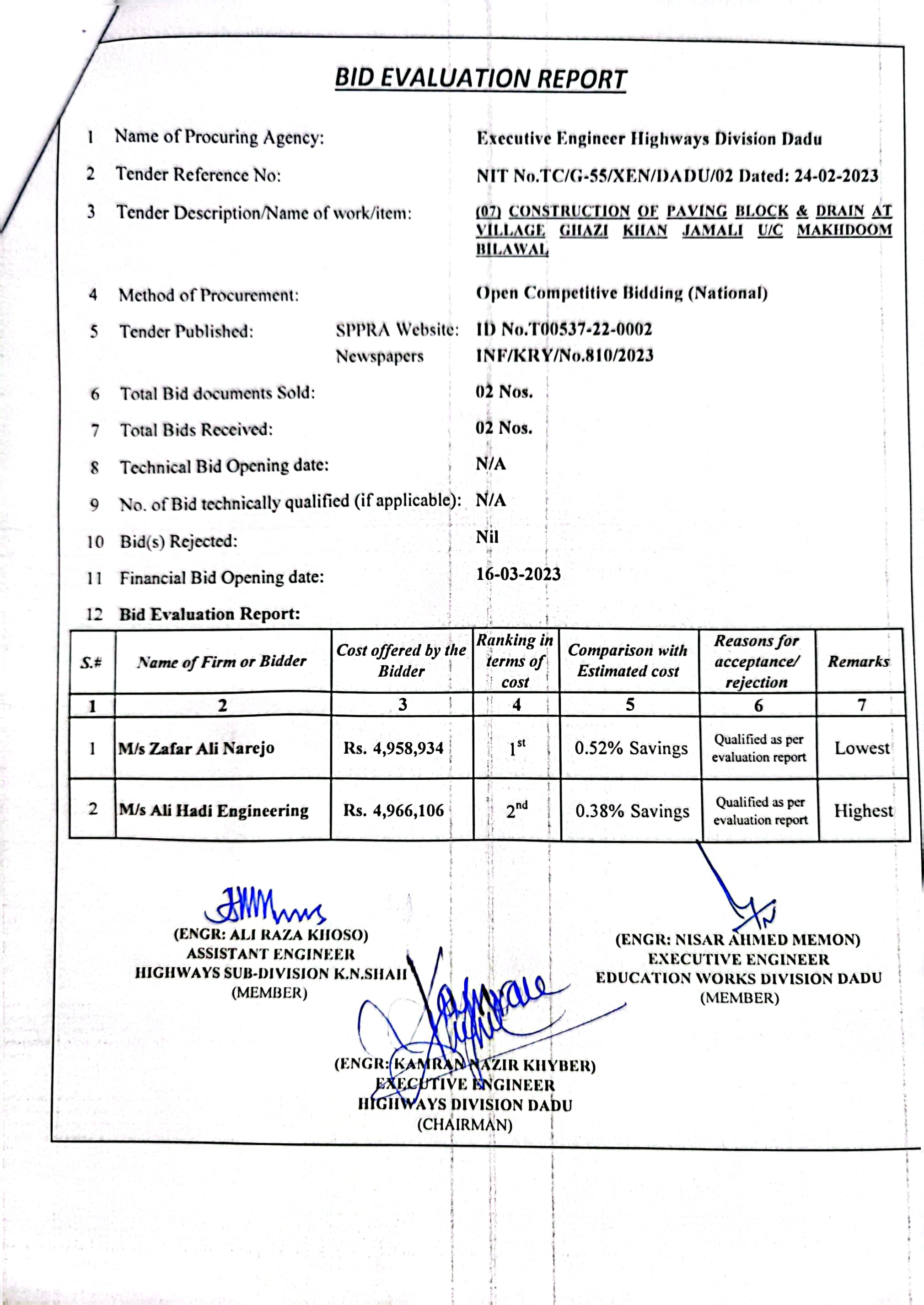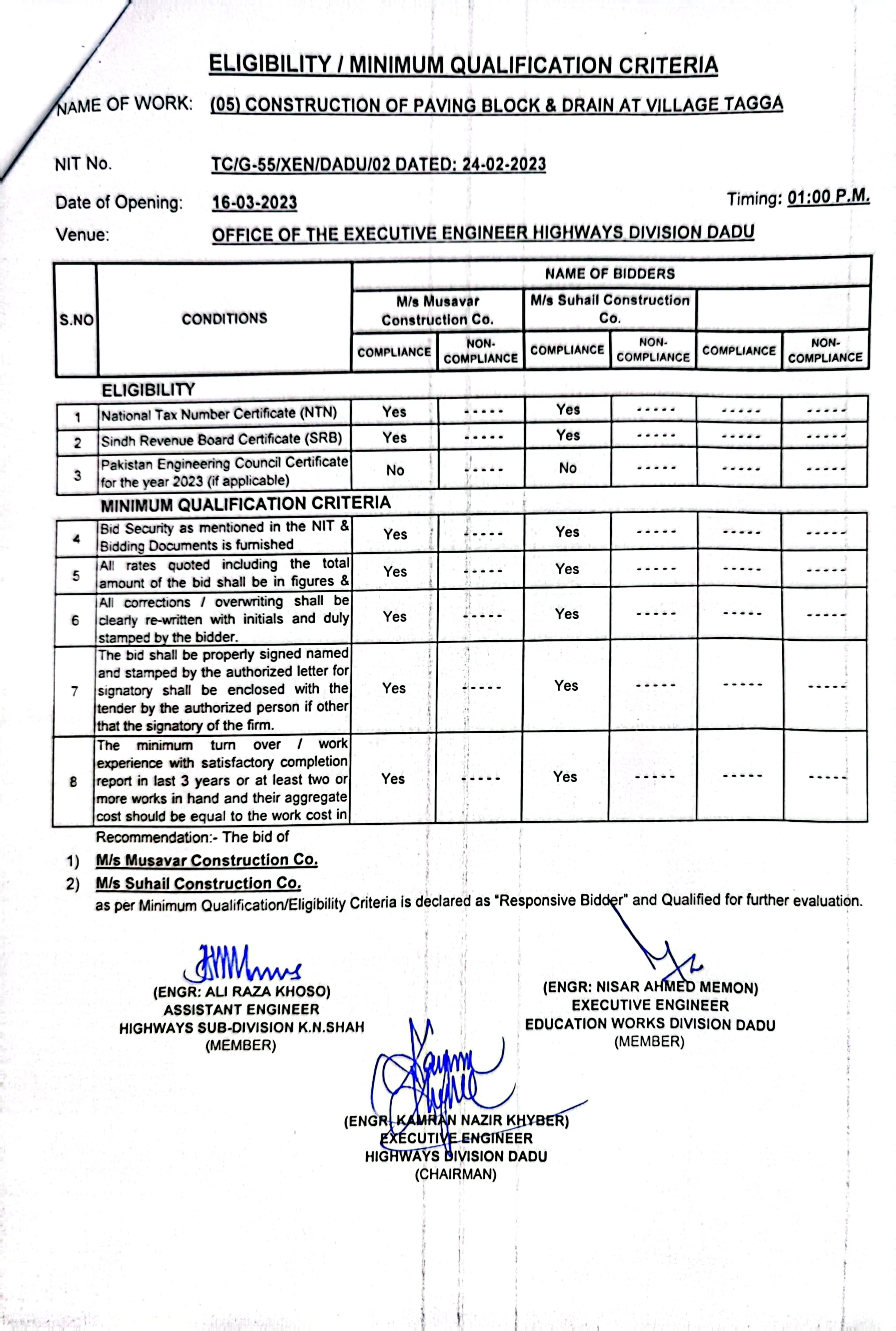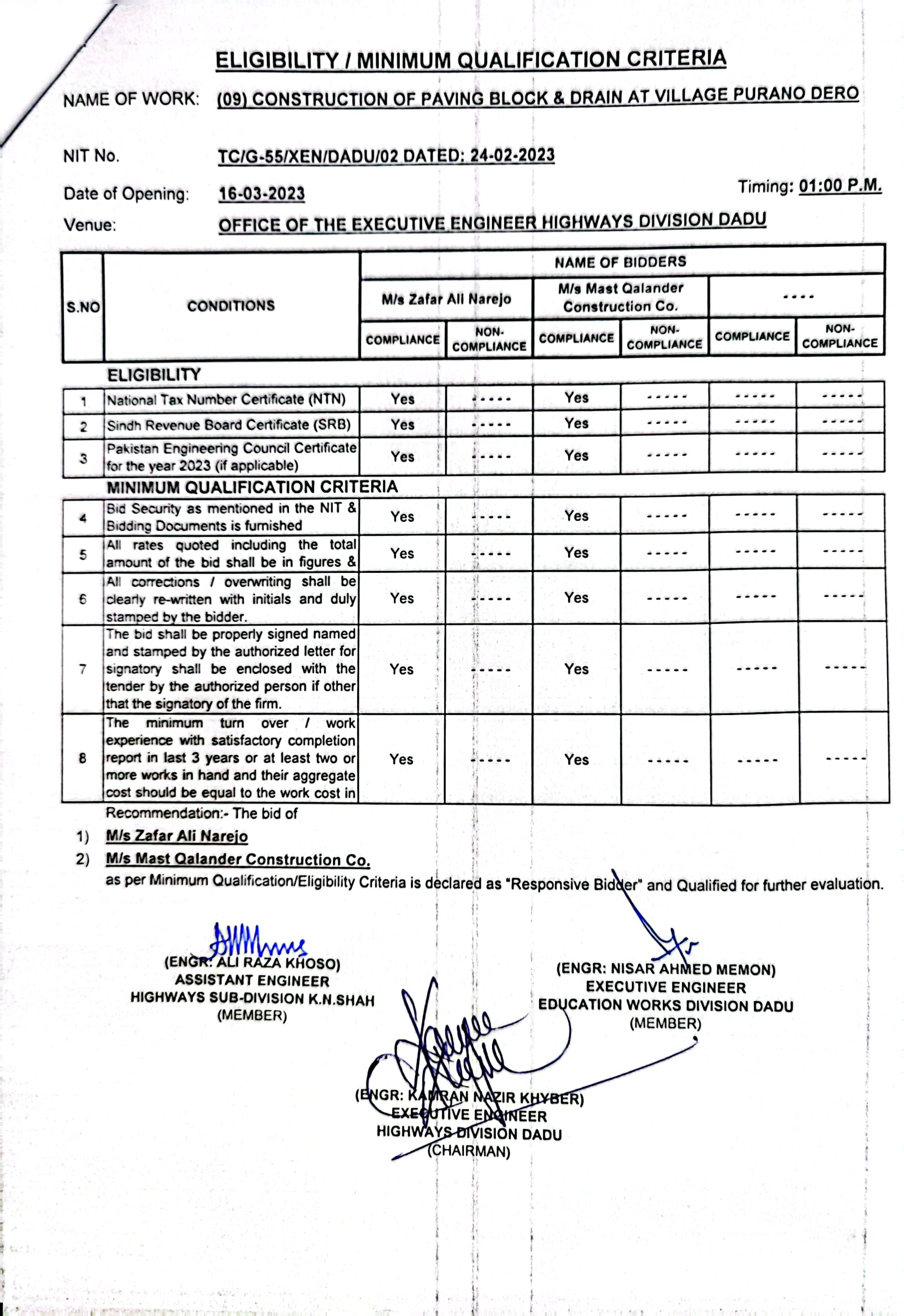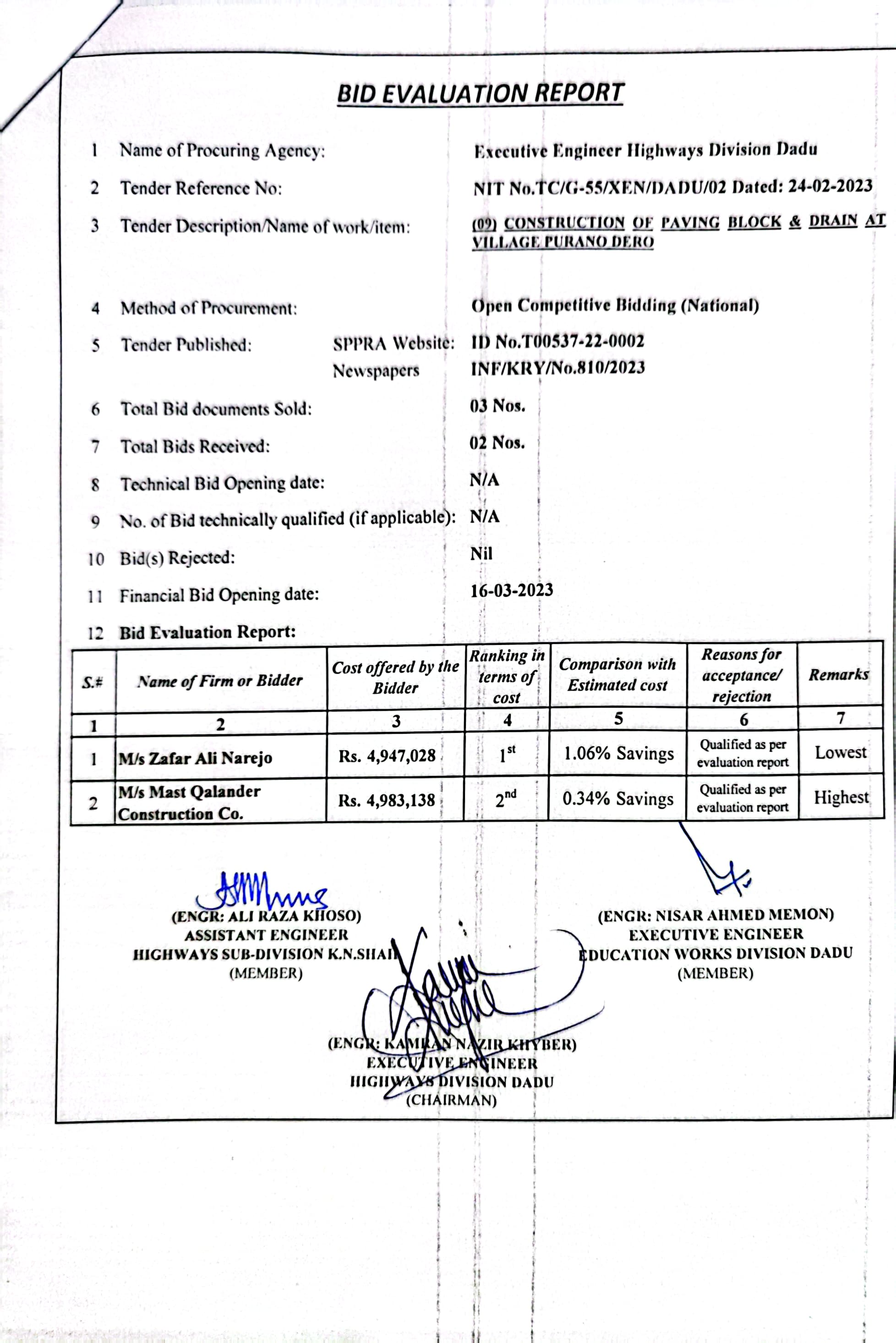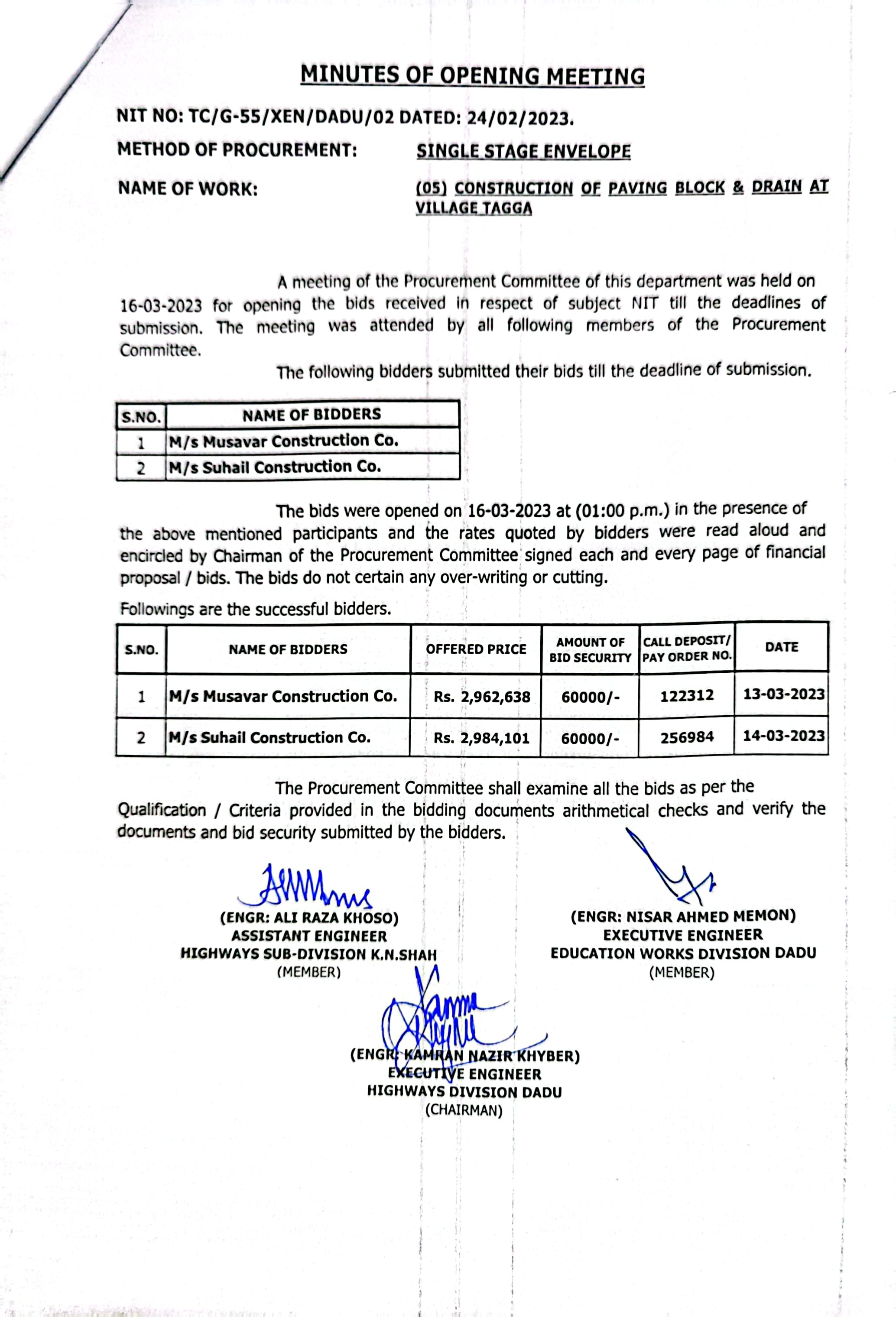 | T00537-22-0002 | BE00537-22-0005 | 5.Construction of Paving Block & Drain at village Tagga | Executive Engineer Highway Division Dadu (51-Works and Services Department) | 20-03-2023 | Dadu | Active |
