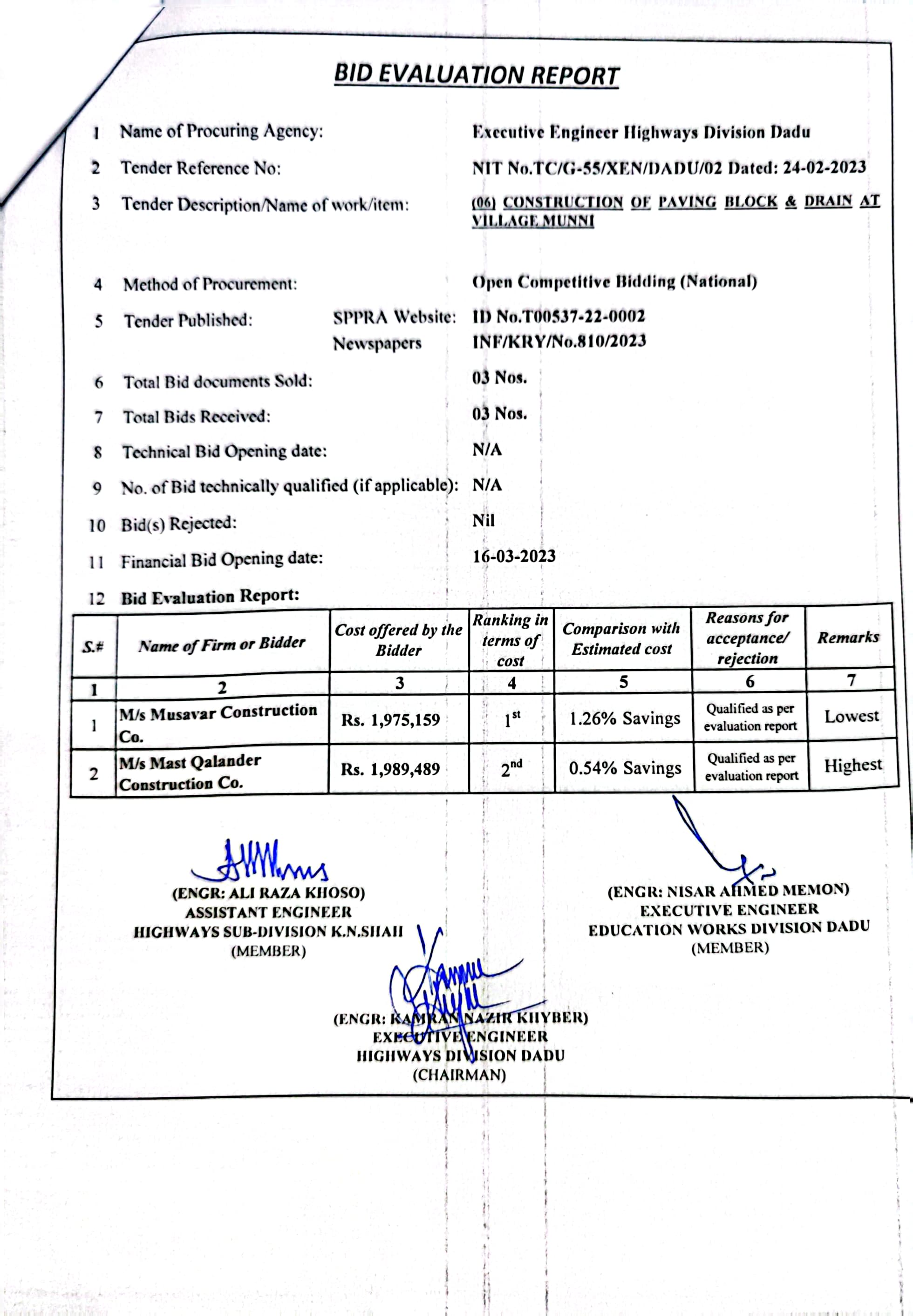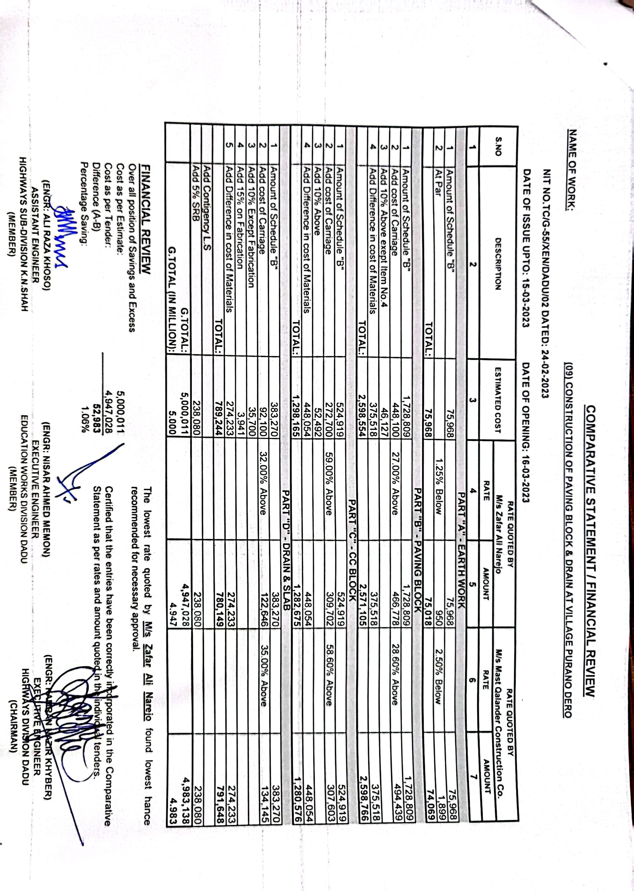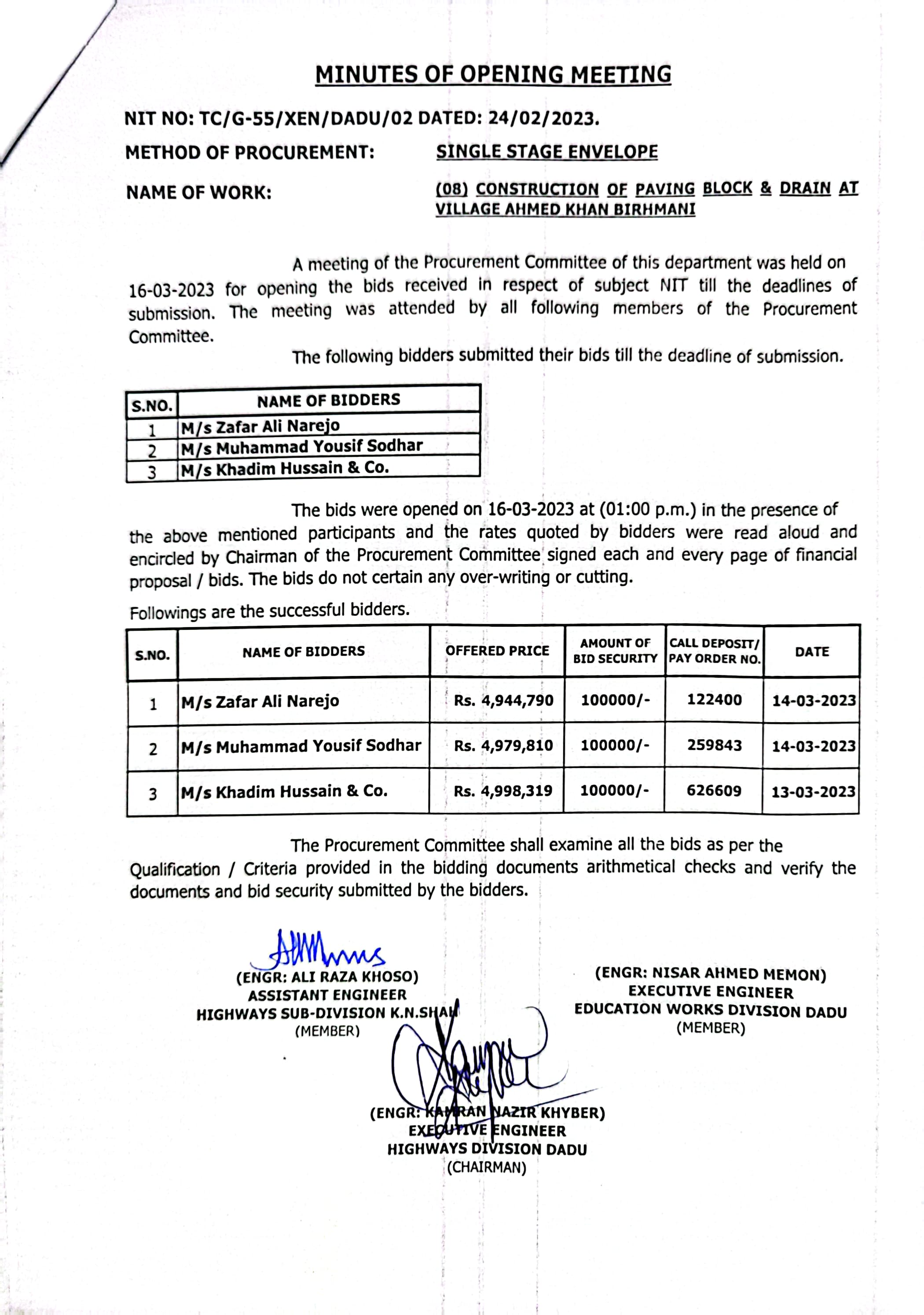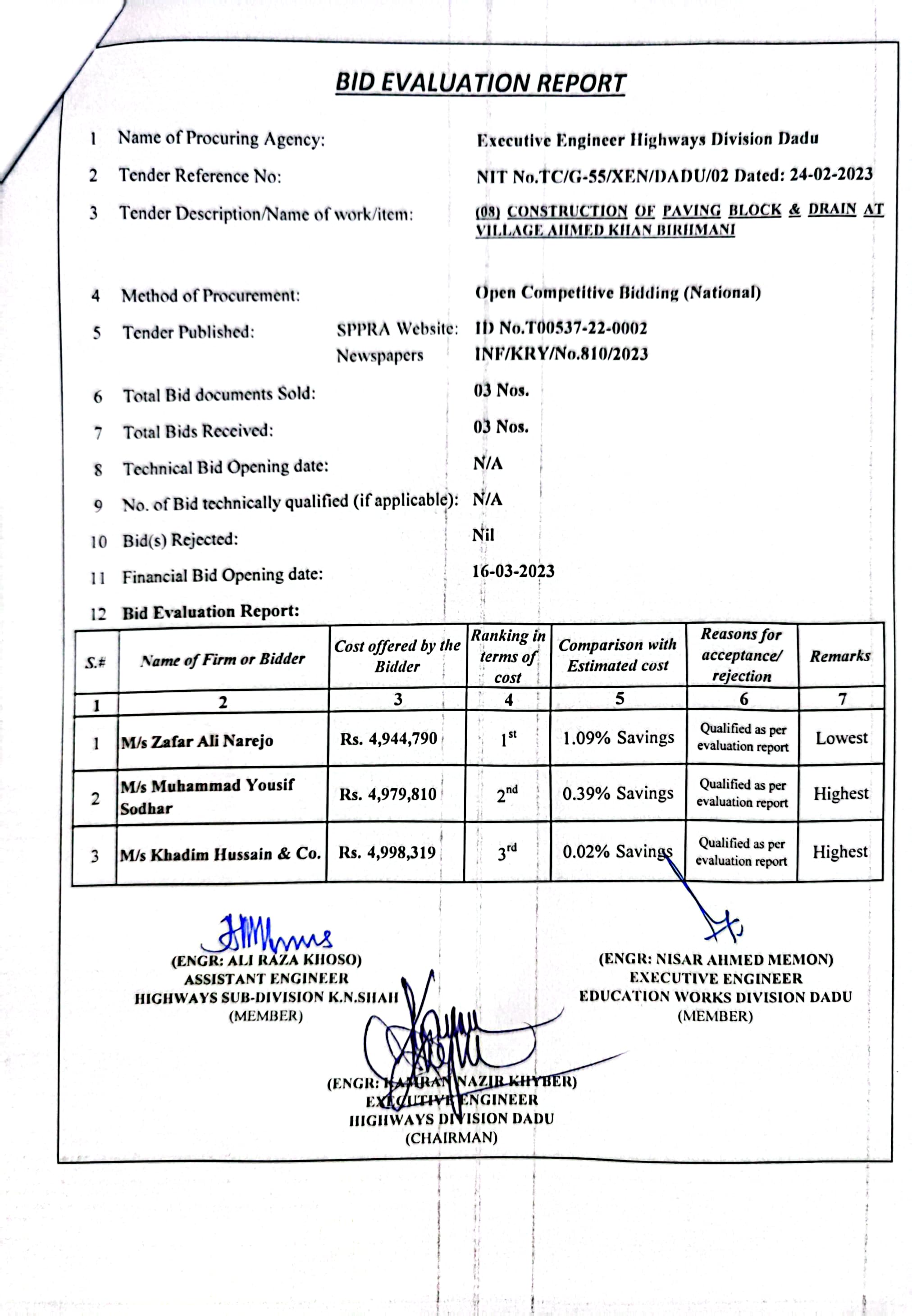 | T00537-22-0002 | BE00537-22-0008 | 8.Construction of Paving Block & Drain at village Ahmed Khan Birhmani | Executive Engineer Highway Division Dadu (51-Works and Services Department) | 20-03-2023 | Dadu | Active |