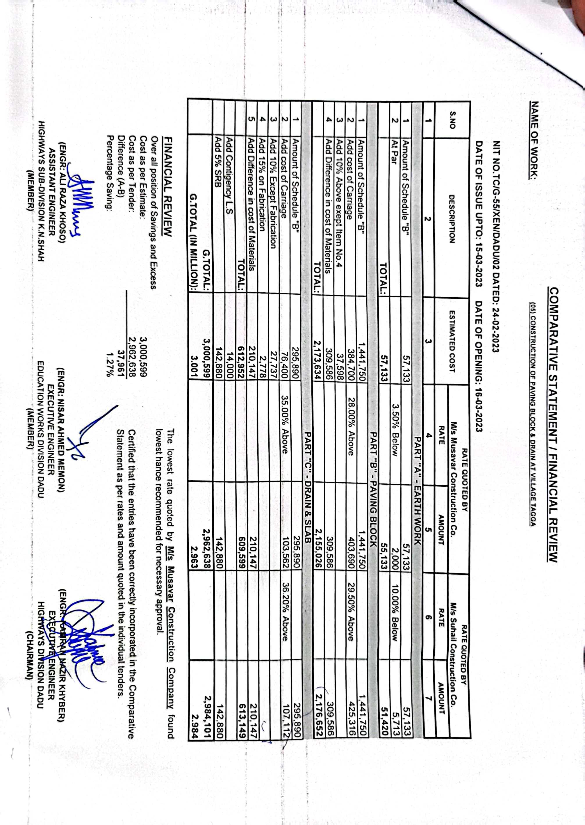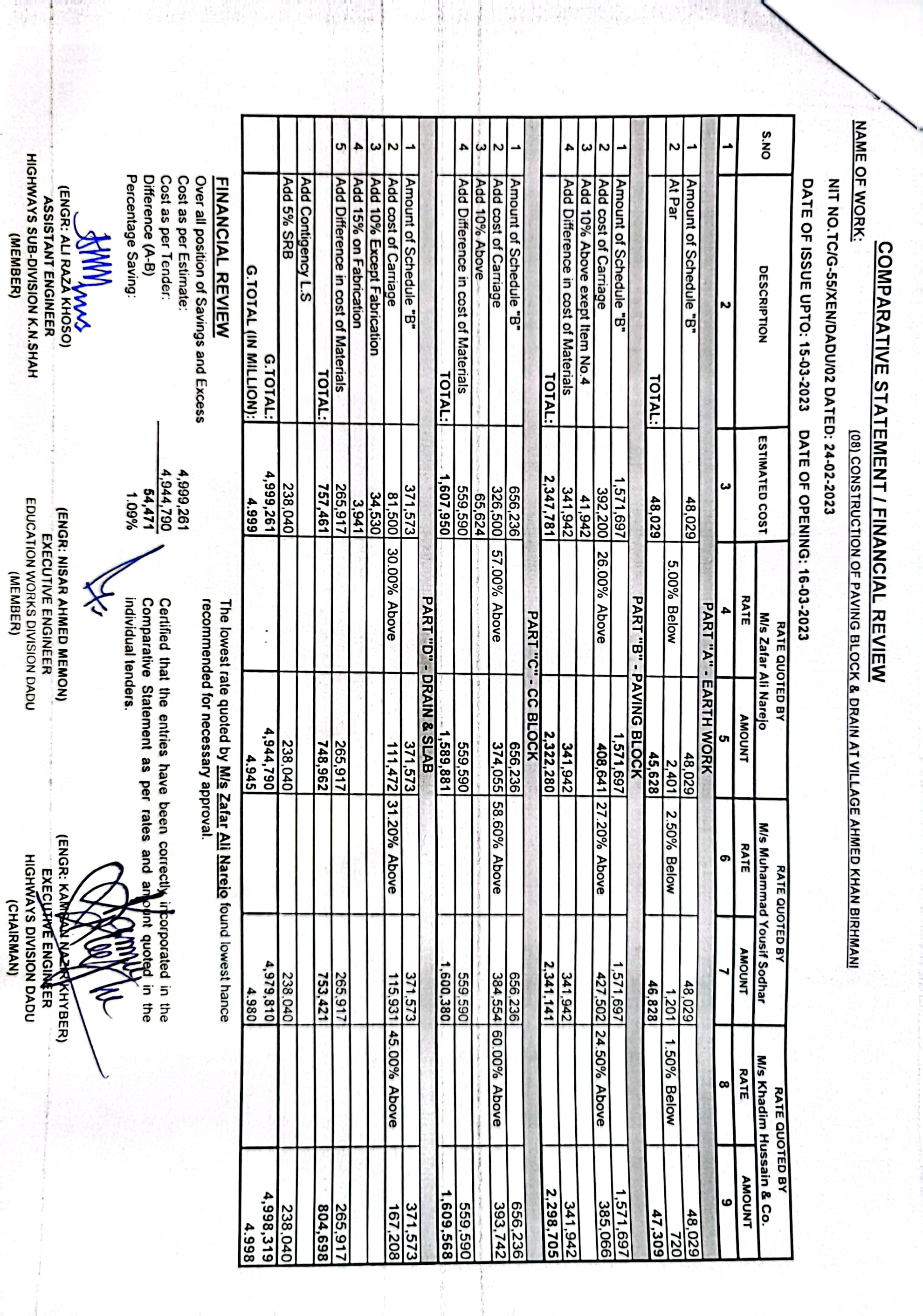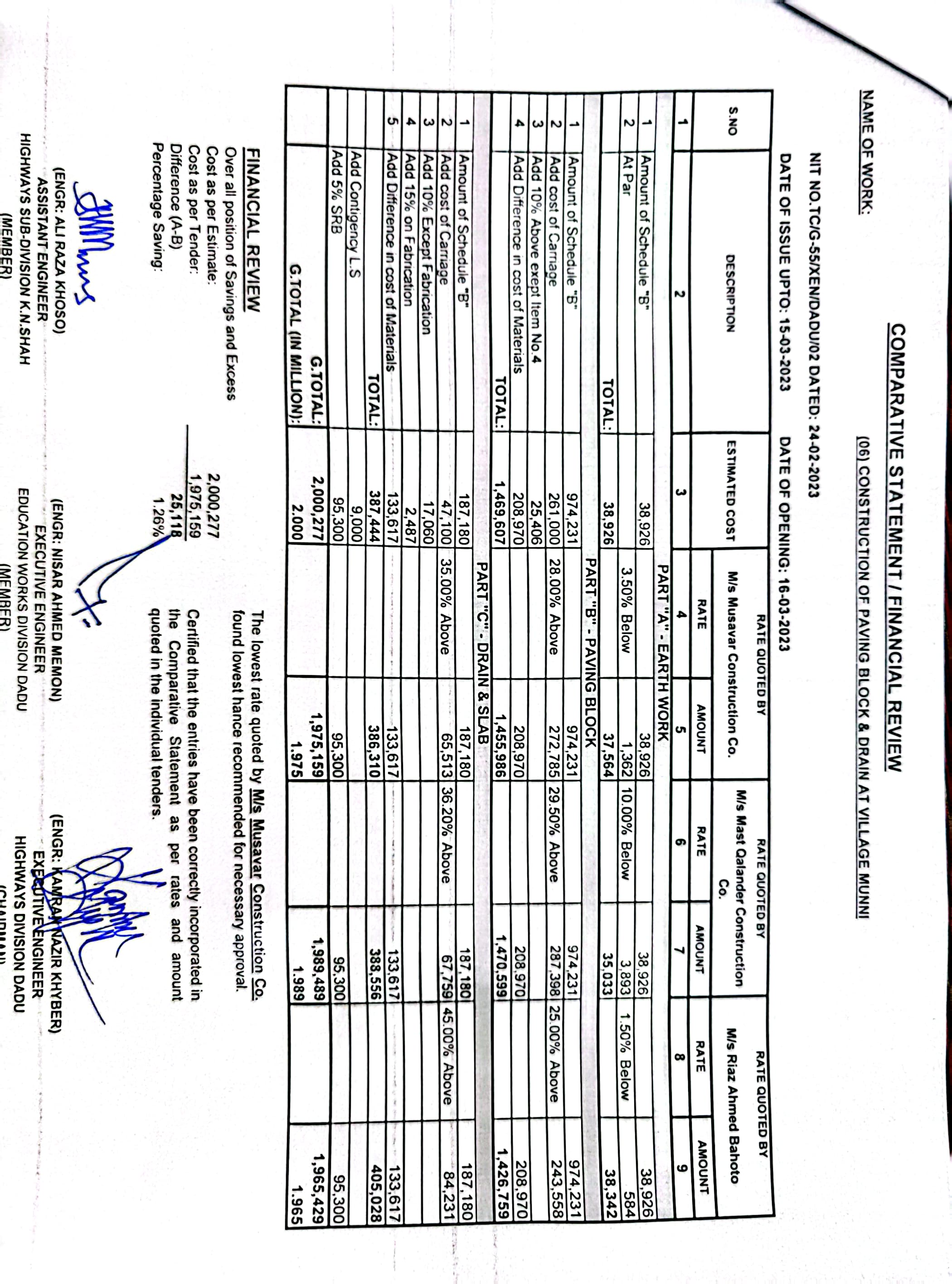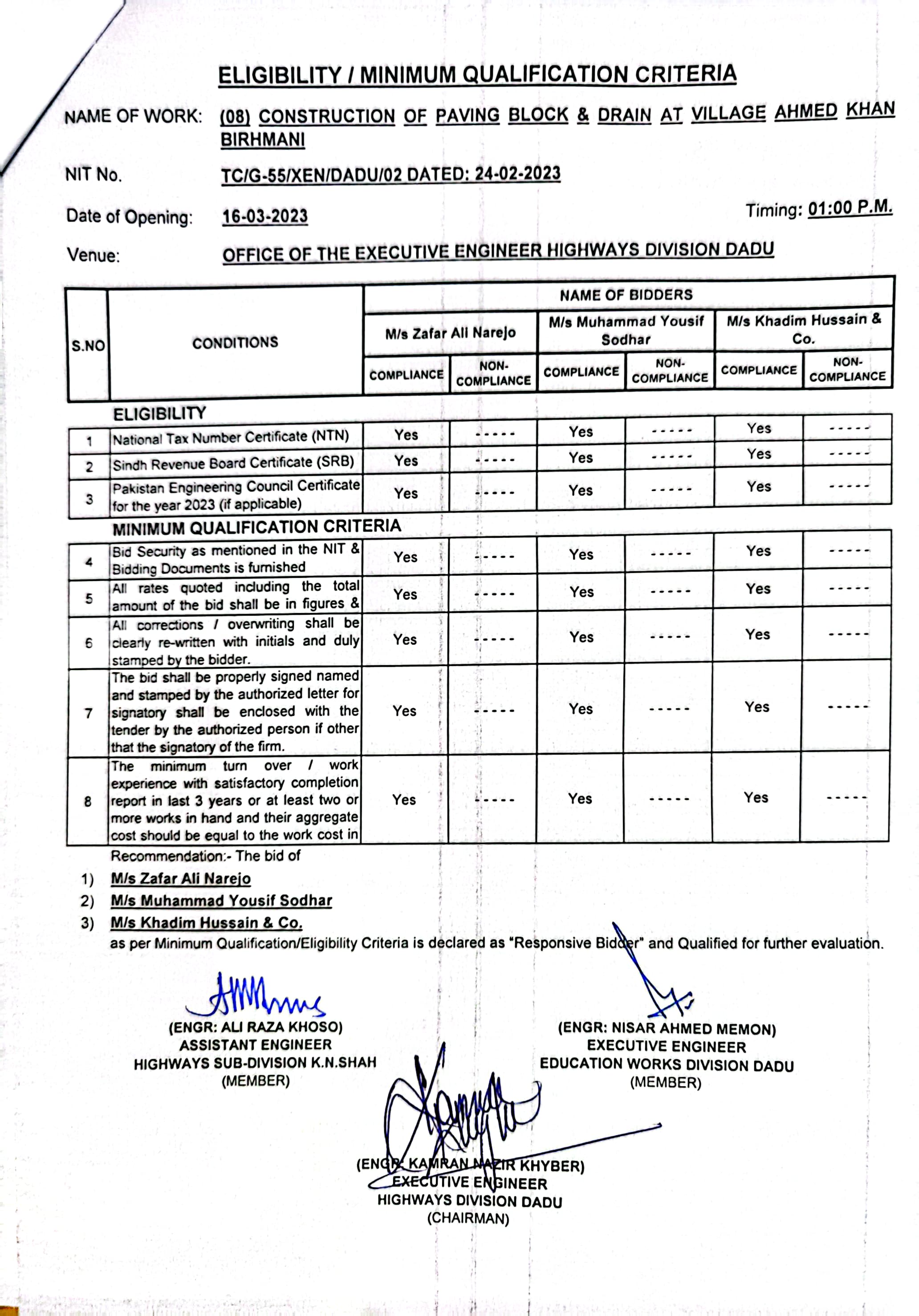 | T00537-22-0002 | BE00537-22-0008 | 8.Construction of Paving Block & Drain at village Ahmed Khan Birhmani | Executive Engineer Highway Division Dadu (51-Works and Services Department) | 20-03-2023 | Dadu | Active |