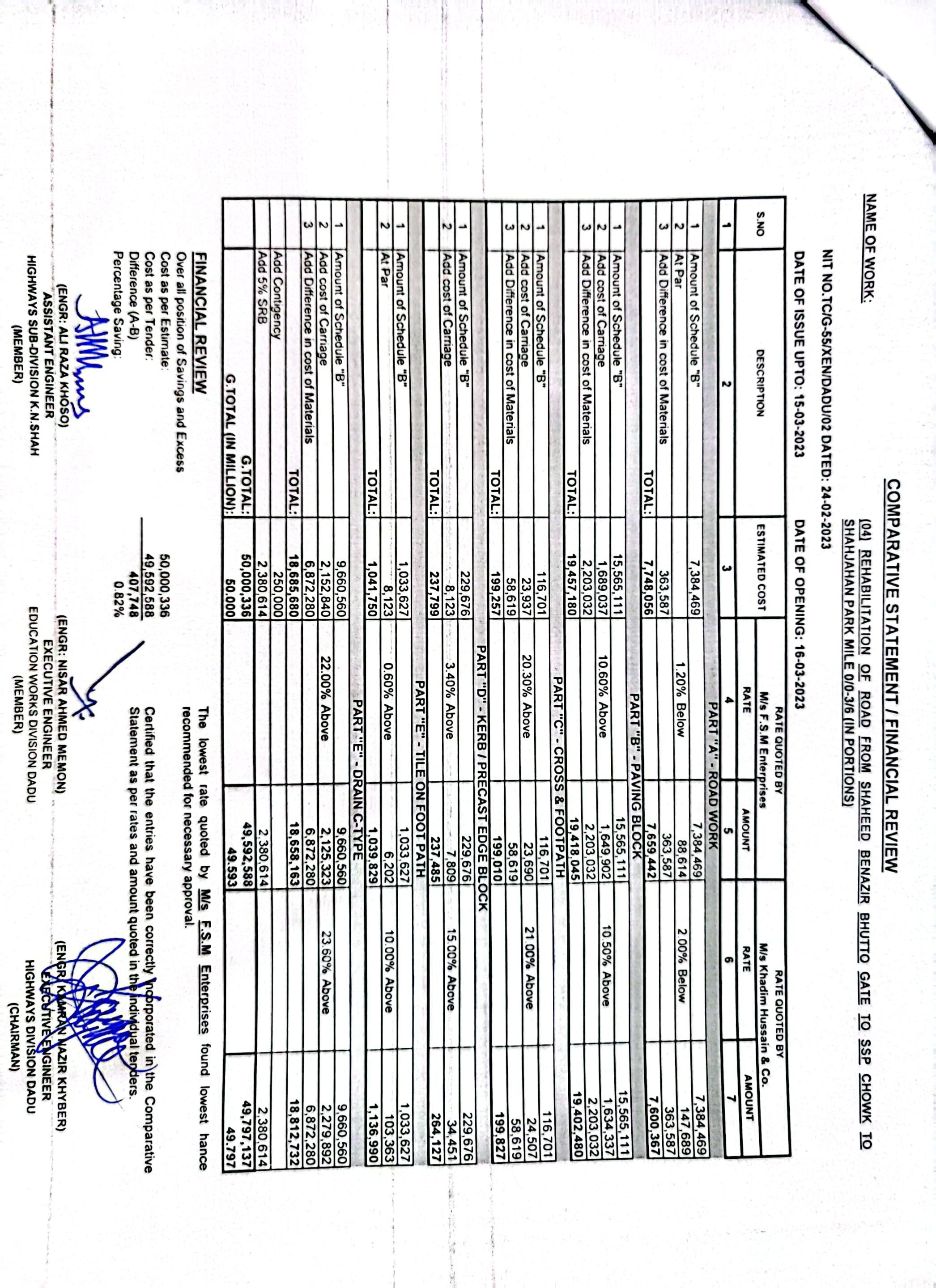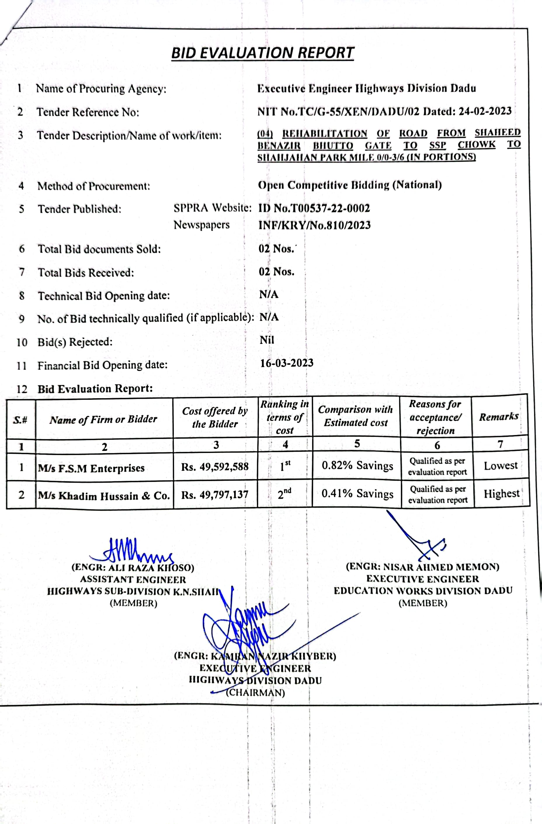 | T00537-22-0002 | BE00537-22-0004 | 4.Rehabilitation of road from Shaheed Benazir Bhutto Gate to SSP Chowk to Shahjahan Park mile 0/0-3/6 (in portions) | Executive Engineer Highway Division Dadu (51-Works and Services Department) | 20-03-2023 | Dadu | Active |
