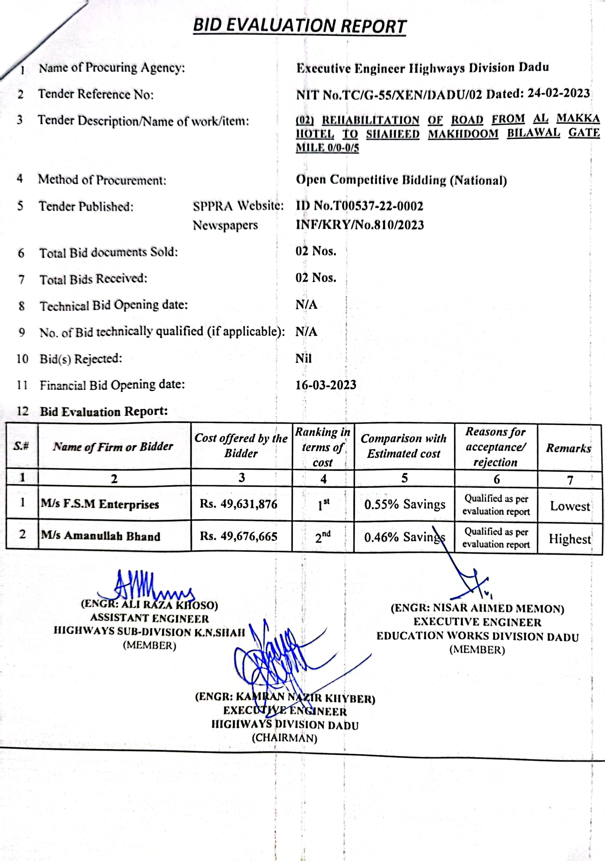 | T00537-22-0002 | BE00537-22-0002 | 2.Rehabilitation of road from Al Makka Hotel to Shaheed Makhdoom Bilawal Gate mile 0/0-0/5 | Executive Engineer Highway Division Dadu (51-Works and Services Department) | 20-03-2023 | Dadu | Active |