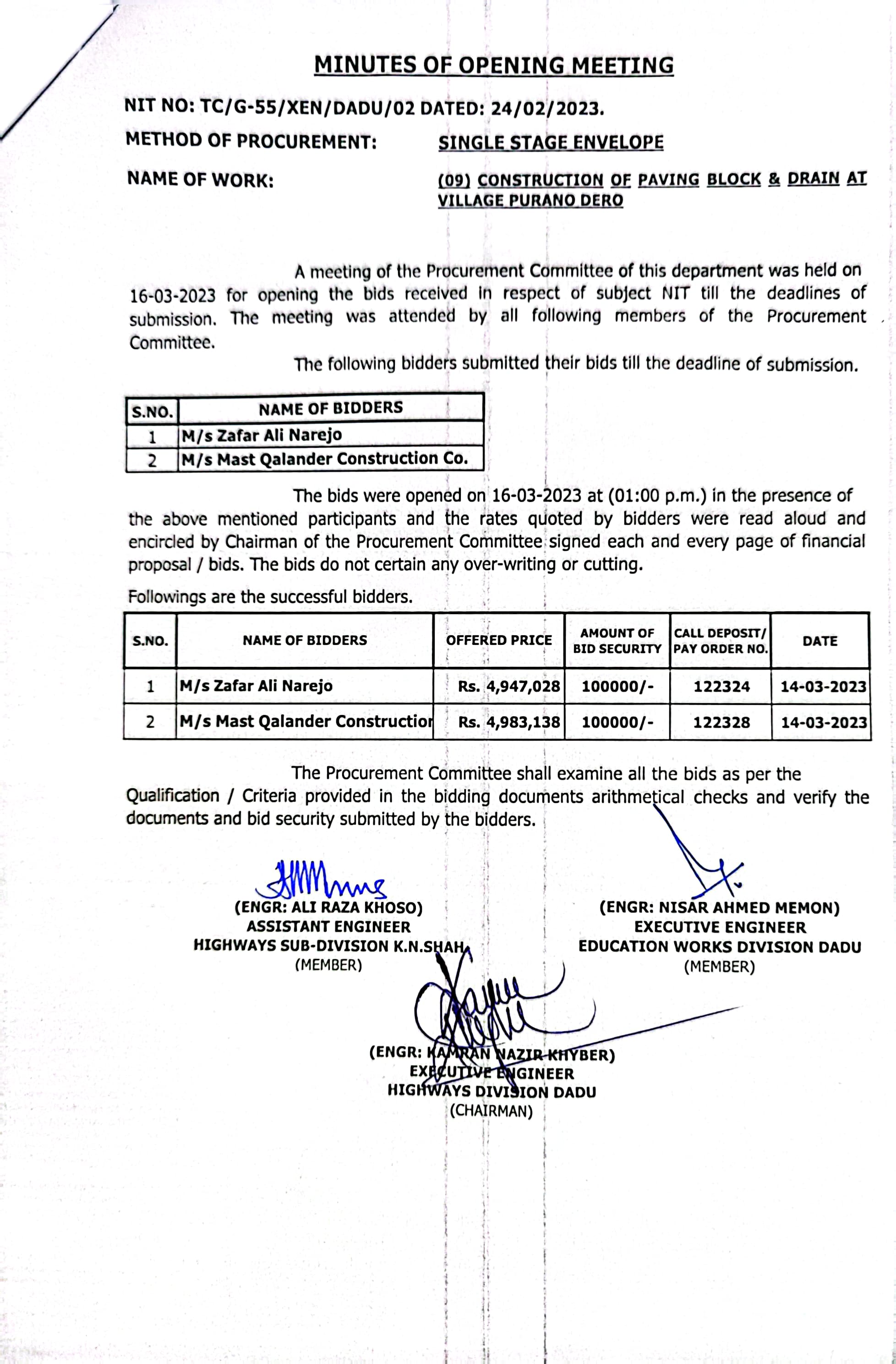 | T00537-22-0002 | BE00537-22-0009 | 9.Construction of Paving Block & Drain at village Purano Dero | Executive Engineer Highway Division Dadu (51-Works and Services Department) | 20-03-2023 | Dadu | Active |