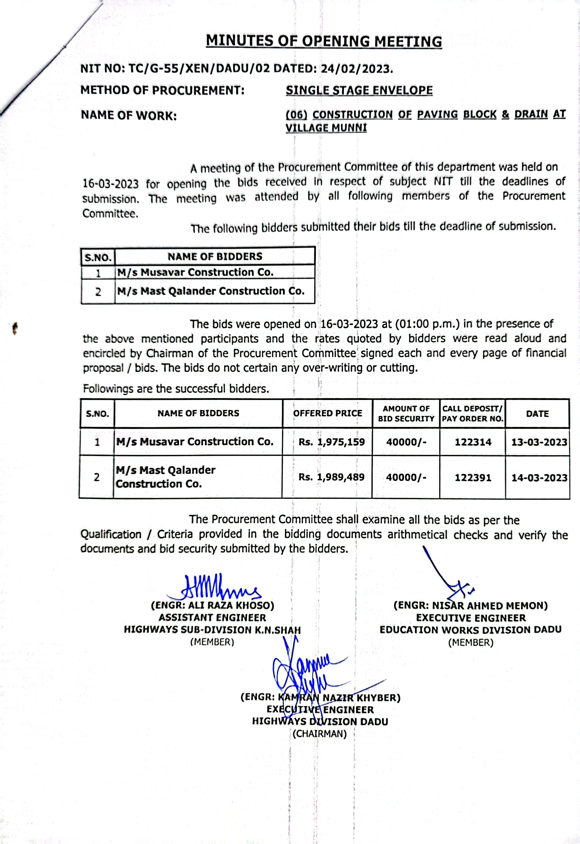 | T00537-22-0002 | BE00537-22-0006 | 6.Construction of Paving Block & Drain at village Munni | Executive Engineer Highway Division Dadu (51-Works and Services Department) | 20-03-2023 | Dadu | Active |