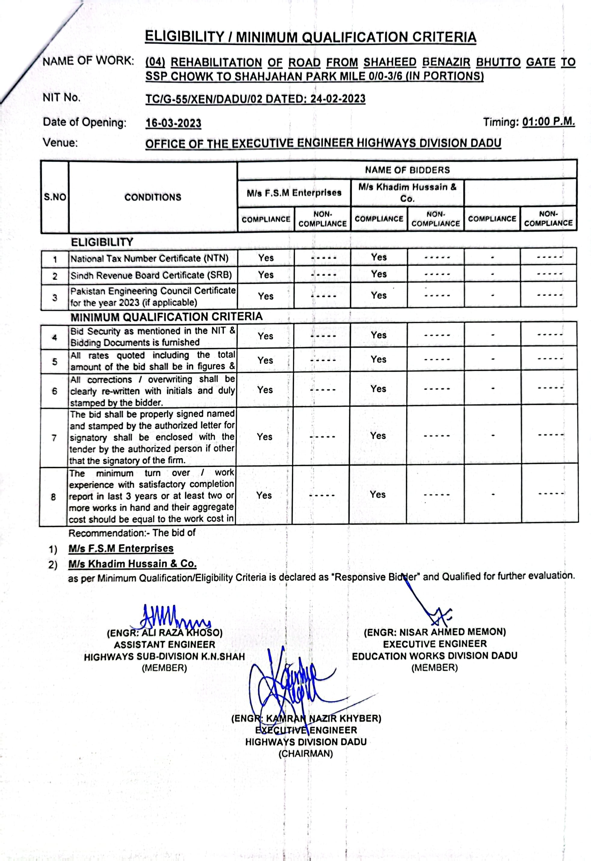 | T00537-22-0002 | BE00537-22-0001 | 1.Rehabilitation of road from SSP Chowk to Benazir Hotel mile 0/0-0/6 (in portions) | Executive Engineer Highway Division Dadu (51-Works and Services Department) | 20-03-2023 | Dadu | Active |