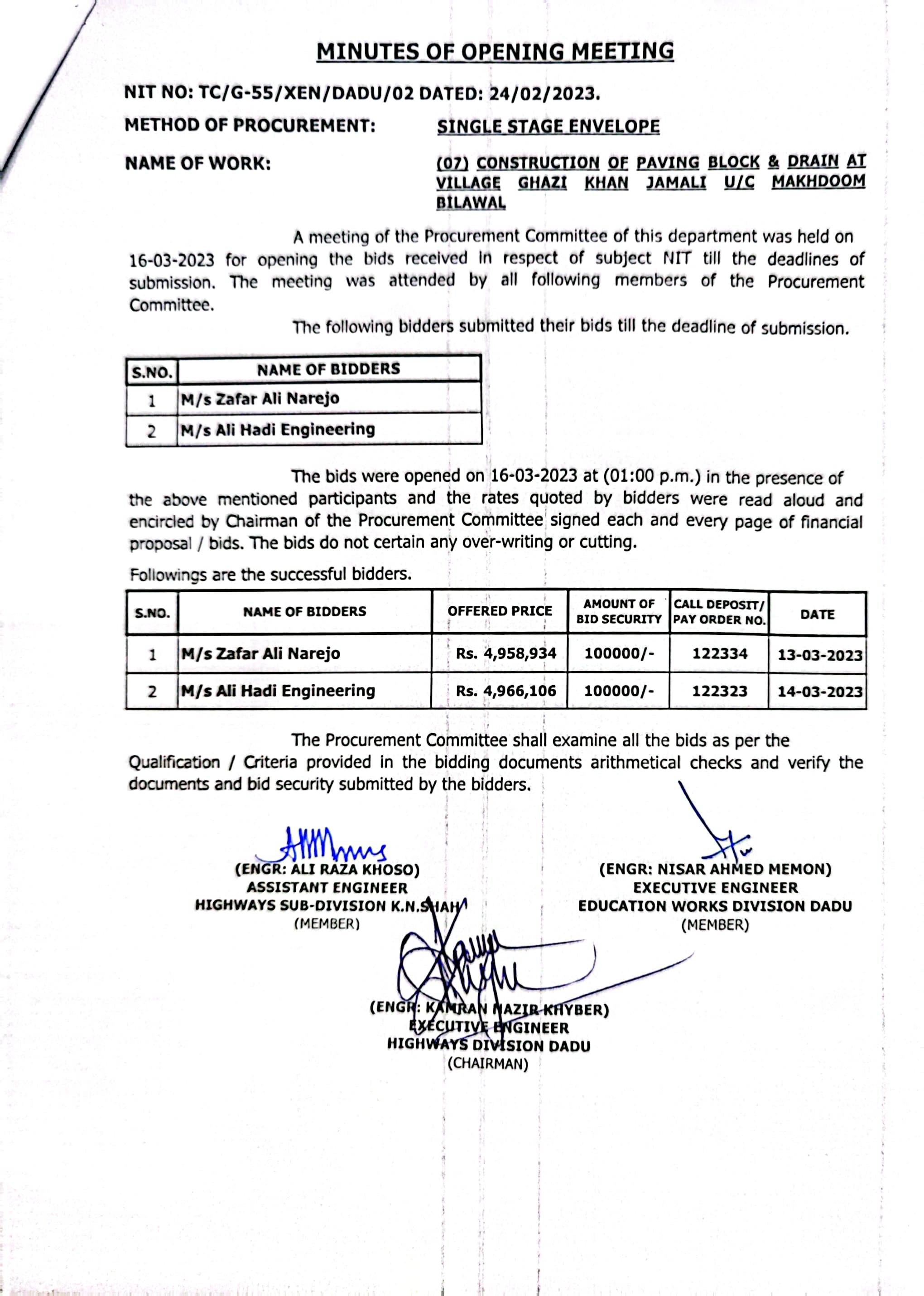 | T00537-22-0002 | BE00537-22-0007 | 7.Construction of Paving Block & Drain at village Ghazi Khan Jamali U/C Makhdoom Bilawal | Executive Engineer Highway Division Dadu (51-Works and Services Department) | 20-03-2023 | Dadu | Active |