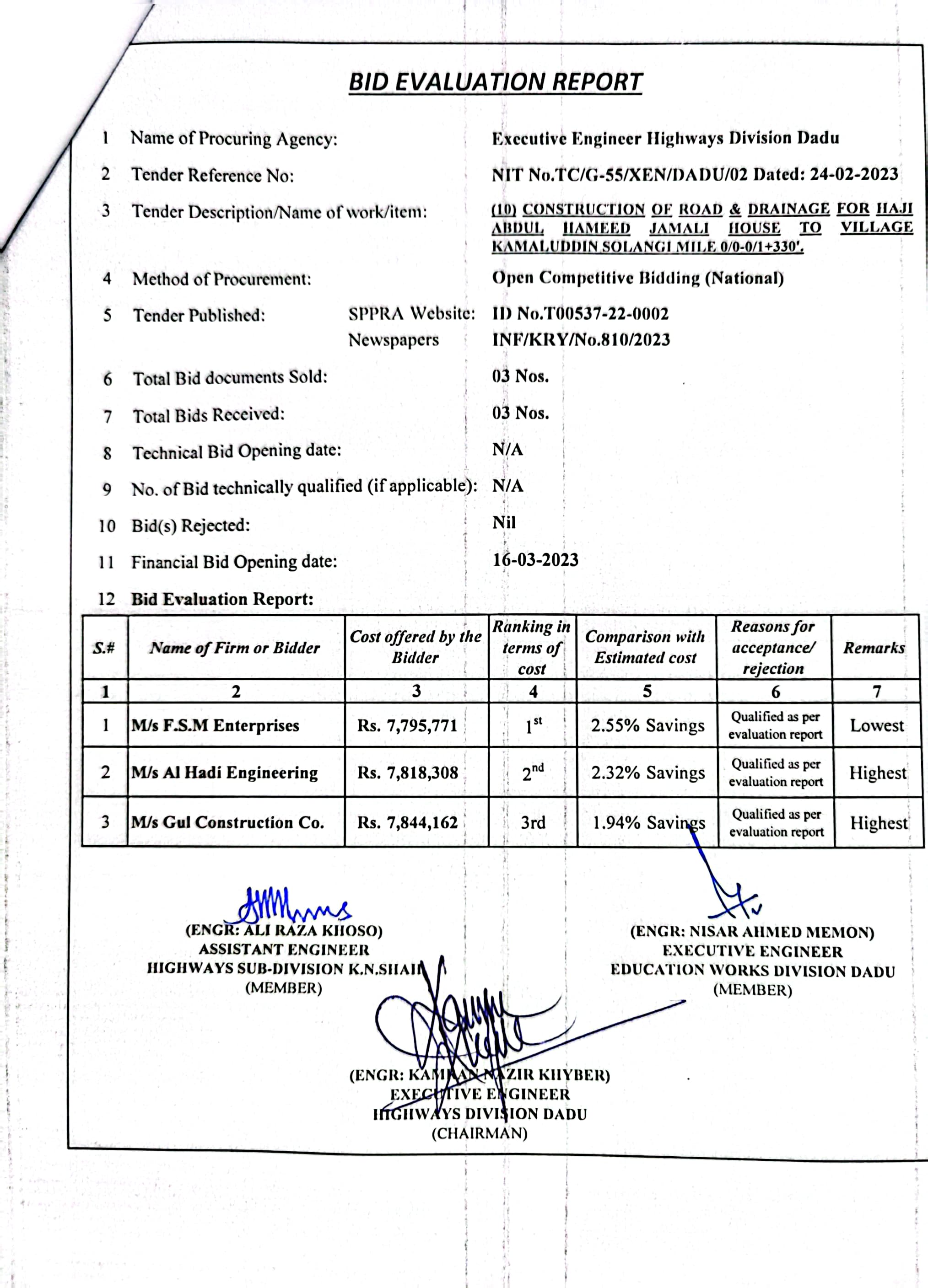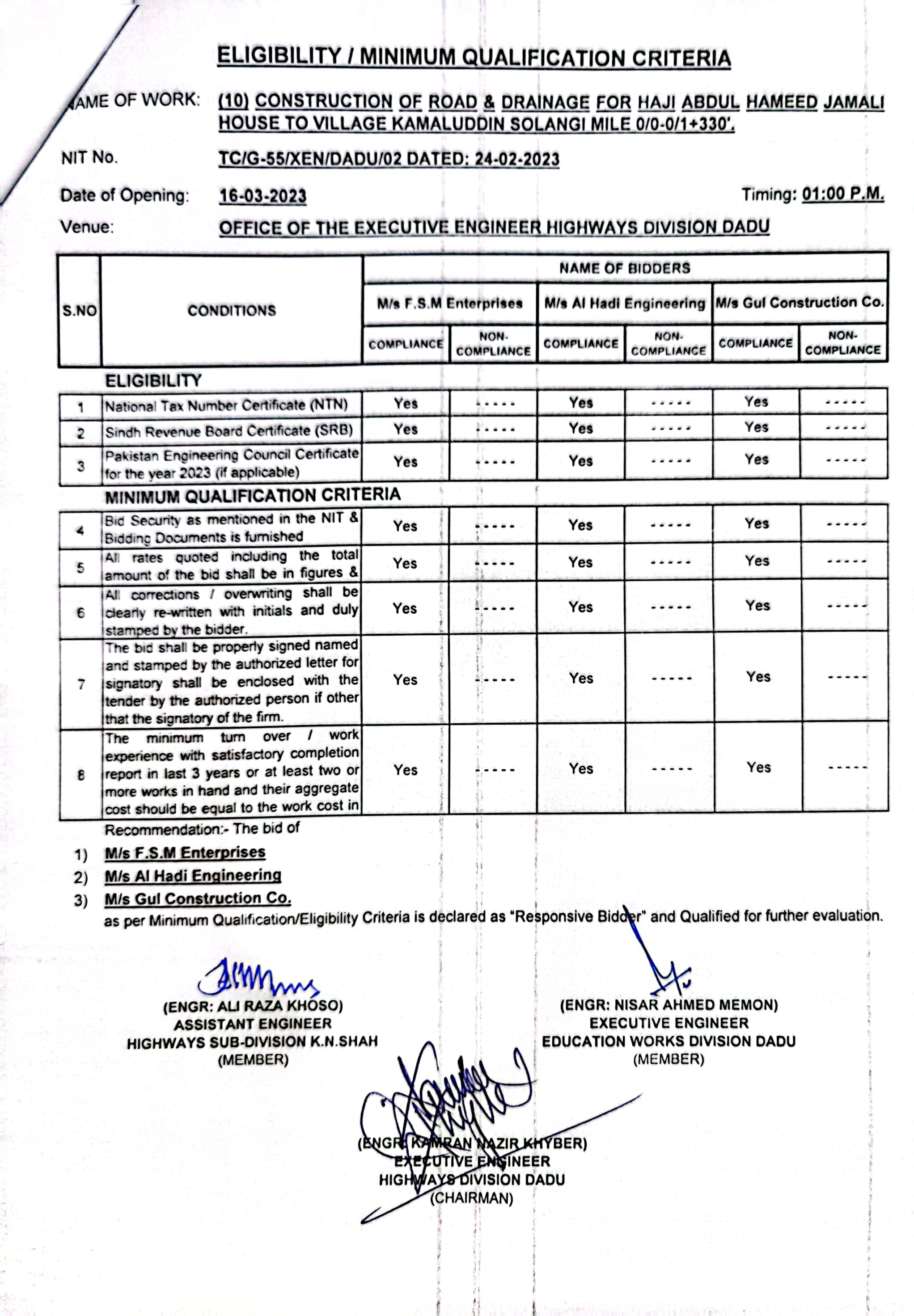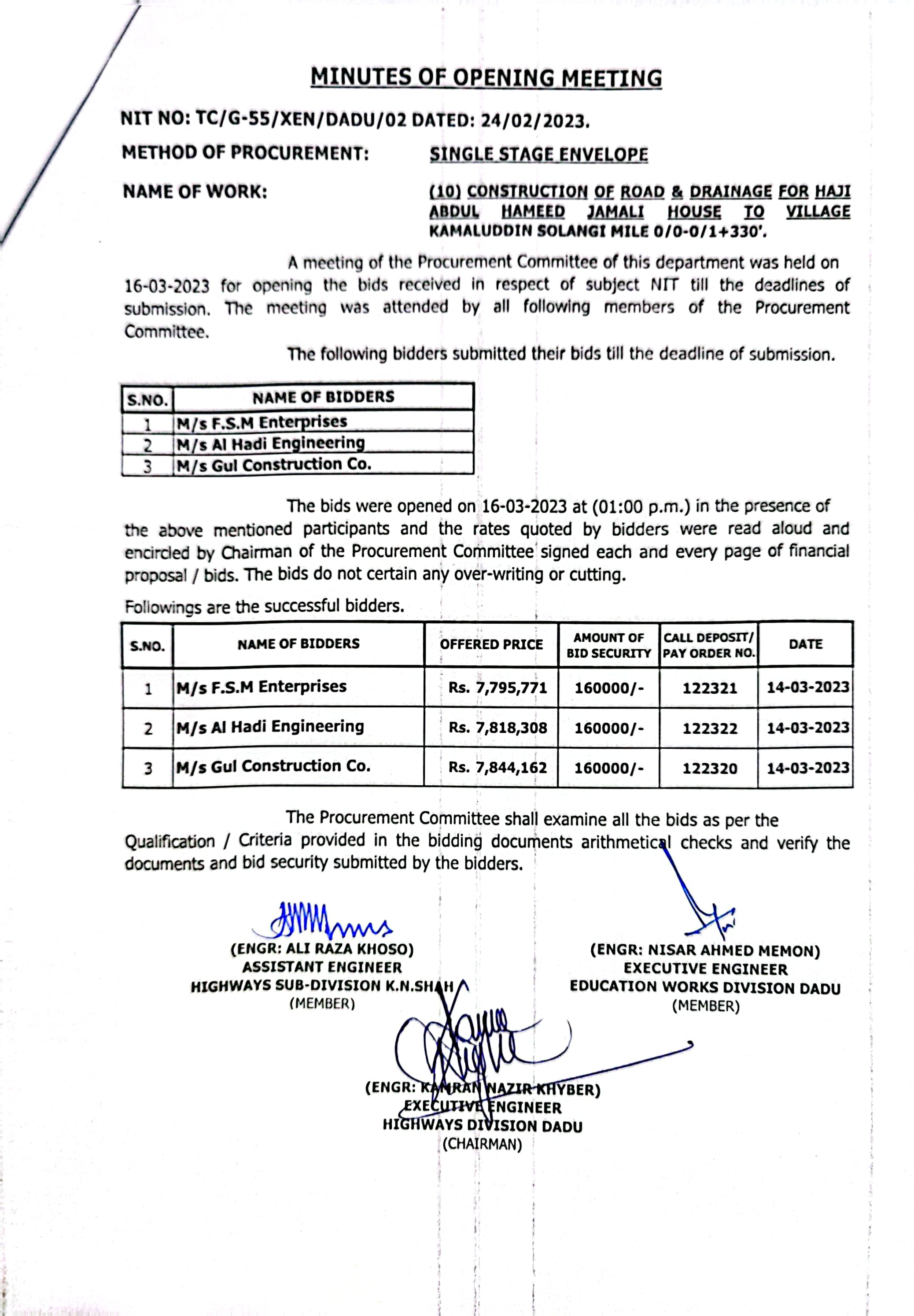 | T00537-22-0002 | BE00537-22-0010 | 10.Construction of Road & Drainage for Haji Abdul Hameed Jamali House to village Kamaluddin Solangi mile 0/0-0/1+330'. | Executive Engineer Highway Division Dadu (51-Works and Services Department) | 20-03-2023 | Dadu | Active |