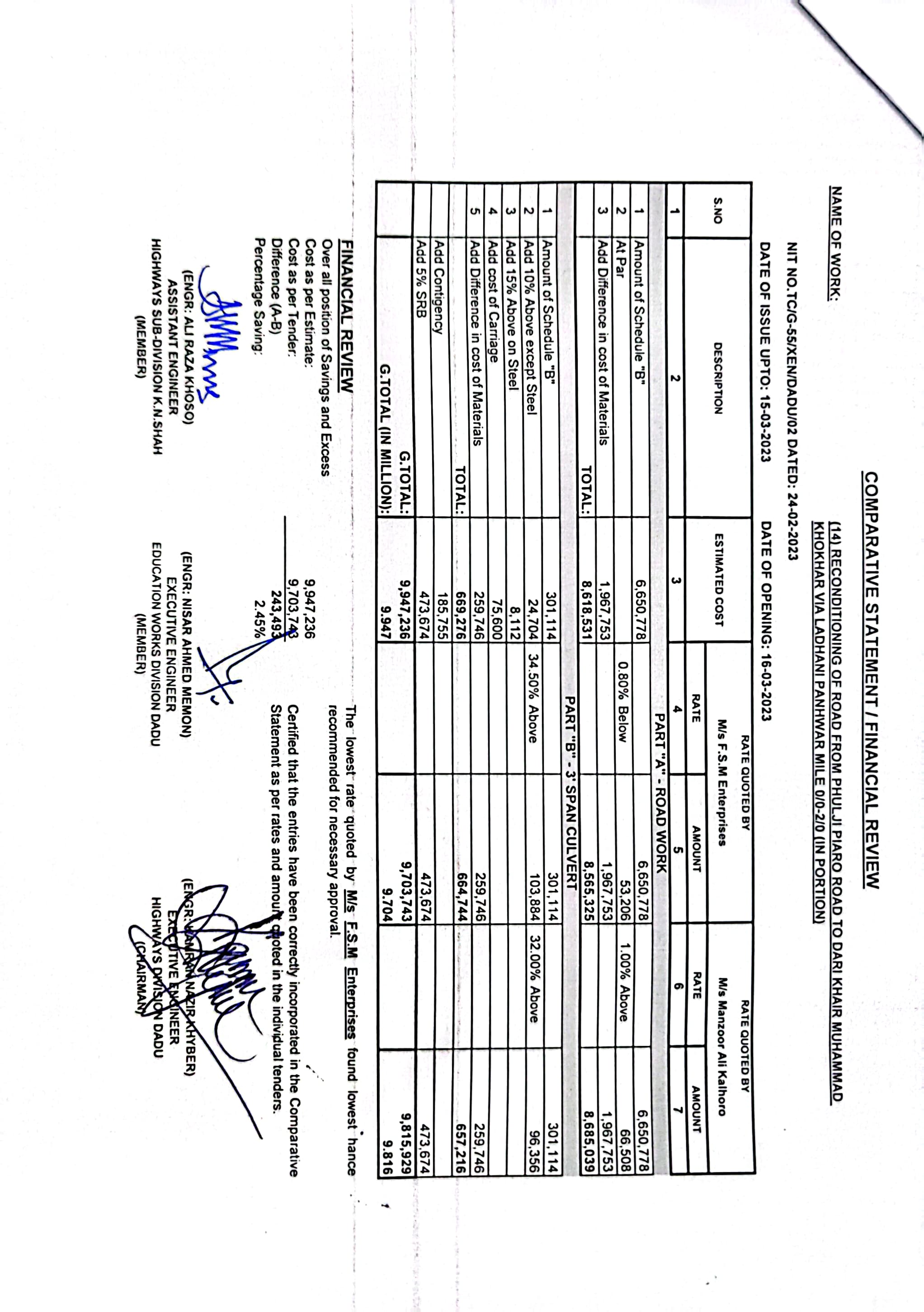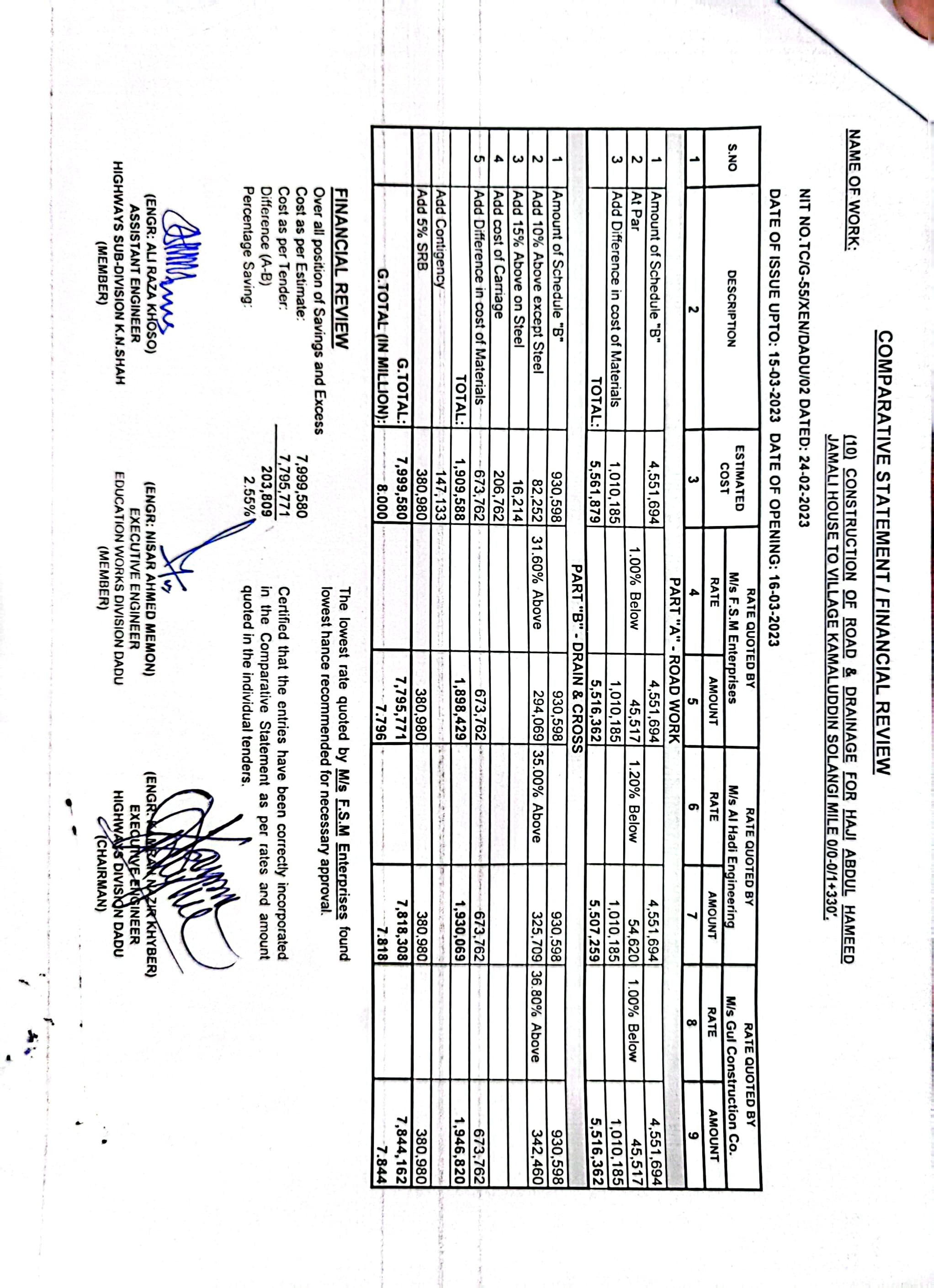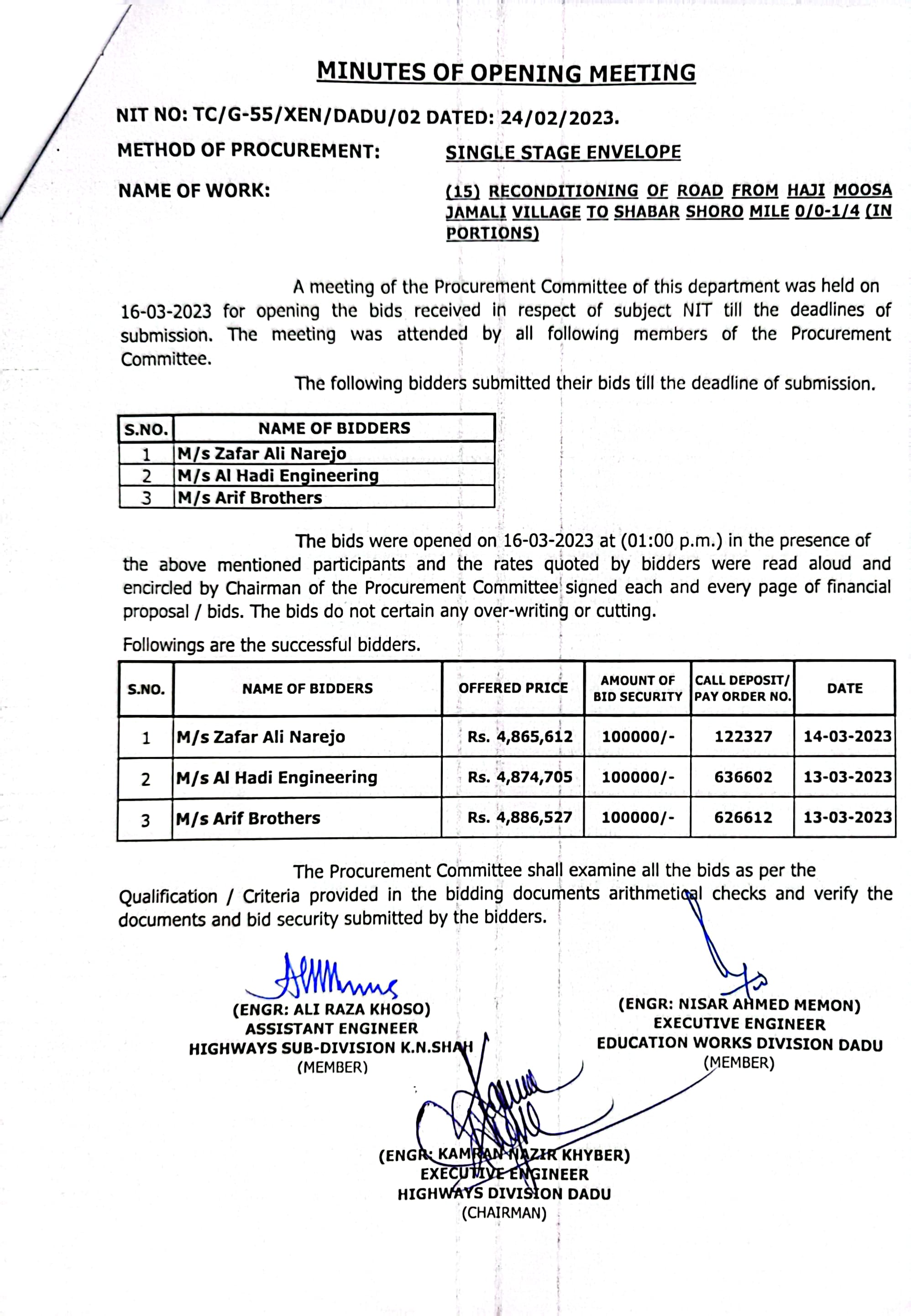 | T00537-22-0002 | BE00537-22-0010 | 10.Construction of Road & Drainage for Haji Abdul Hameed Jamali House to village Kamaluddin Solangi mile 0/0-0/1+330'. | Executive Engineer Highway Division Dadu (51-Works and Services Department) | 20-03-2023 | Dadu | Active |