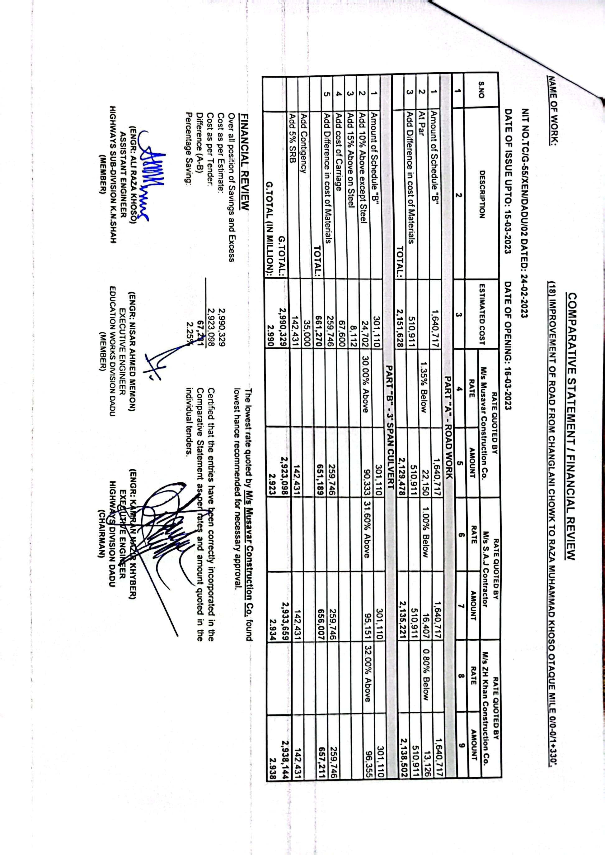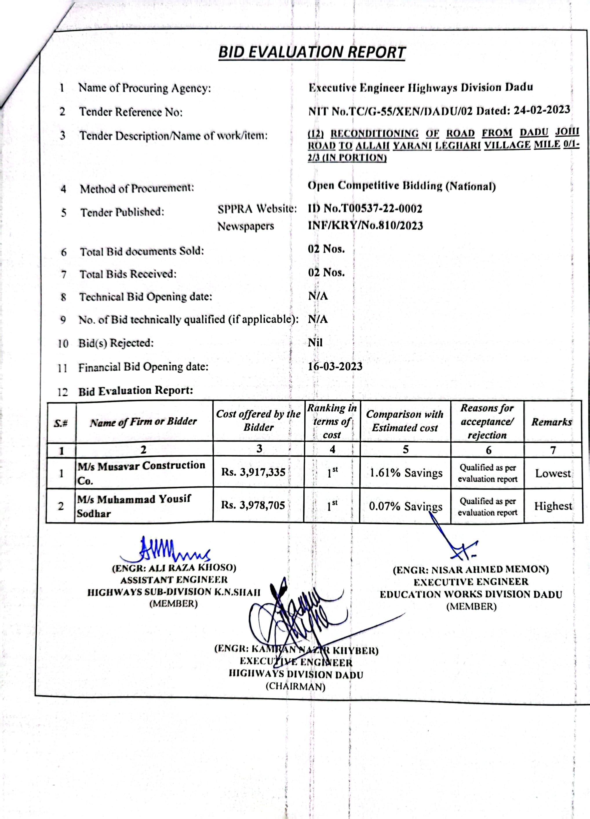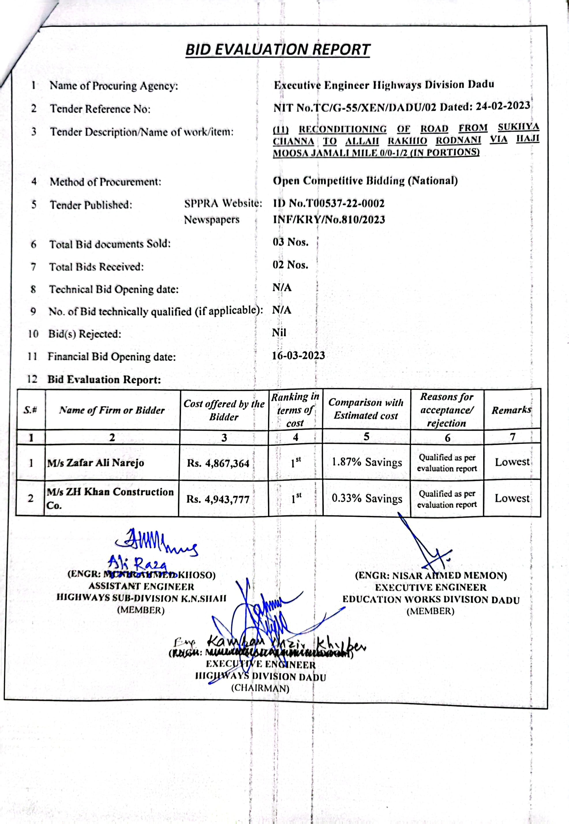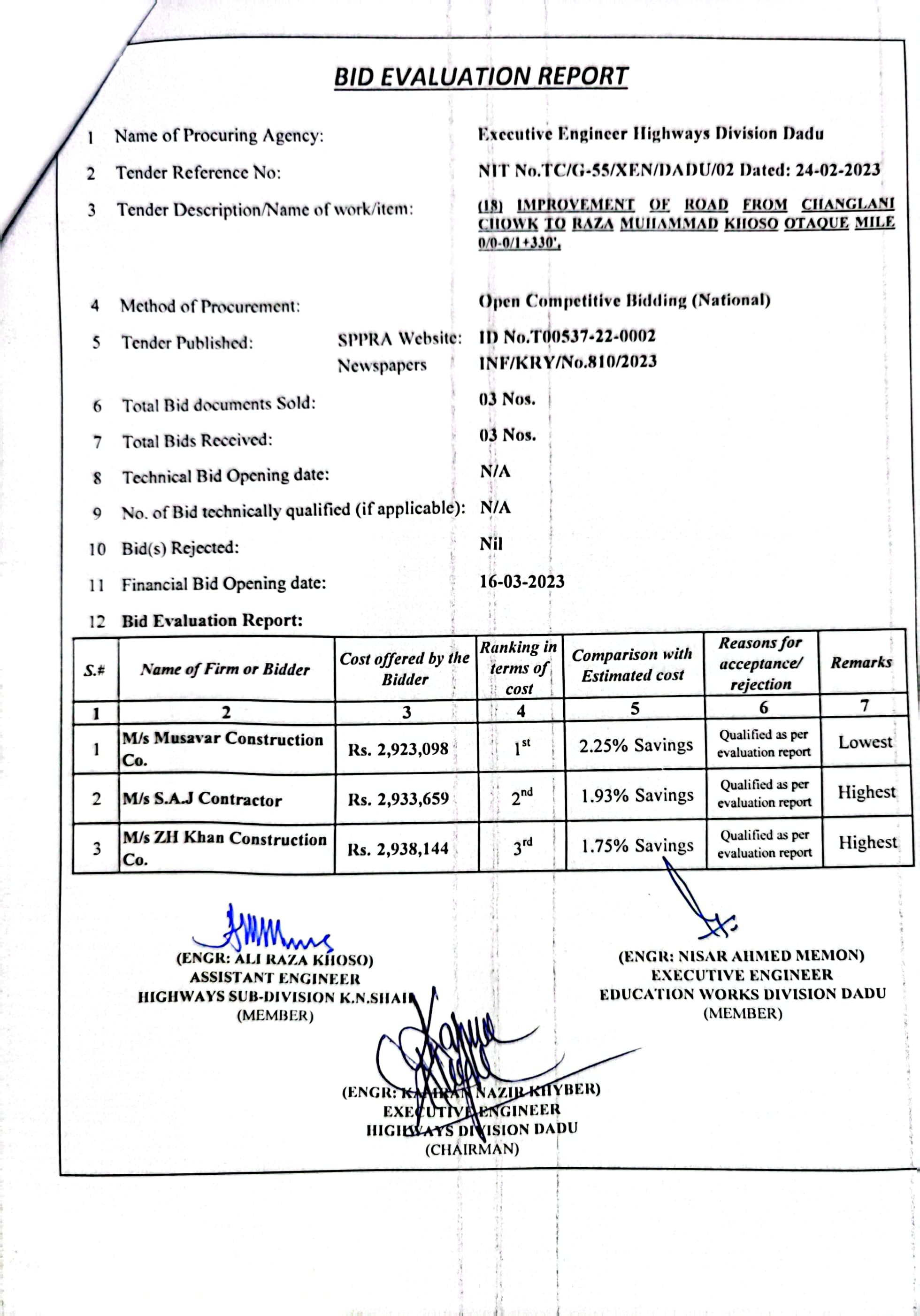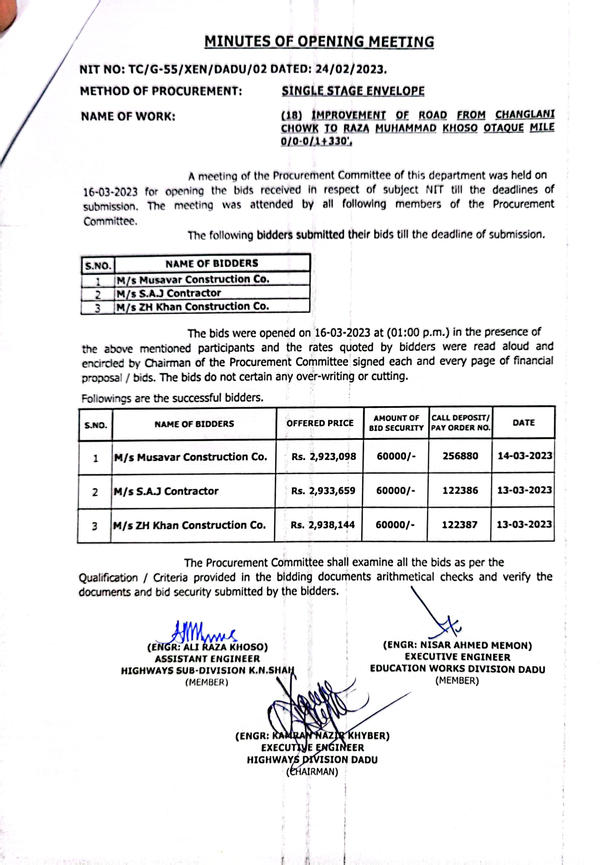| T00537-22-0002 | BE00537-22-0018 | Improvement of road from Changlani Chowk to Raza Muhammad Khoso Otaque mile 0/0-0/1+330'. | Executive Engineer Highway Division Dadu (51-Works and Services Department) | 20-03-2023 | Dadu | Active |