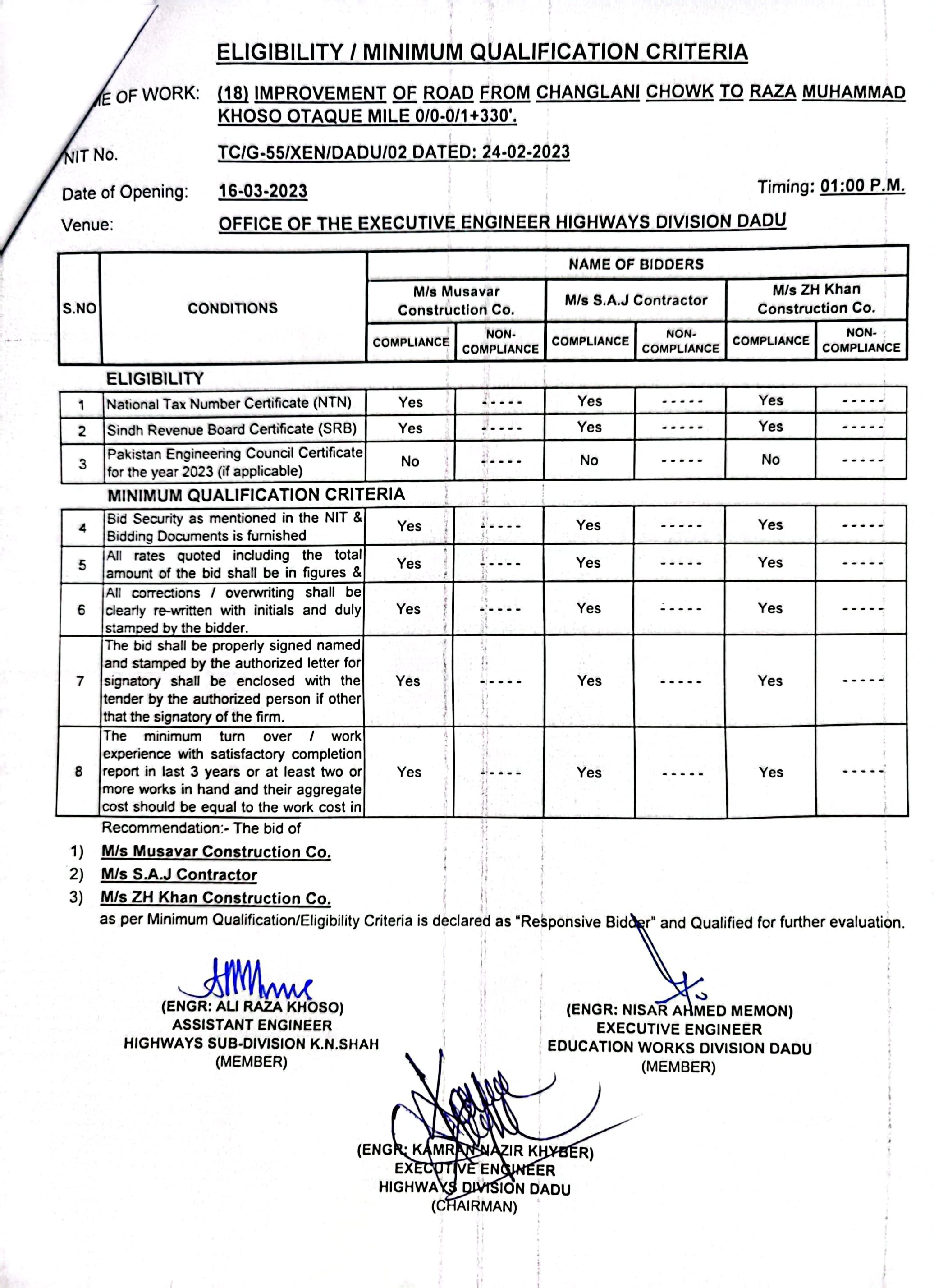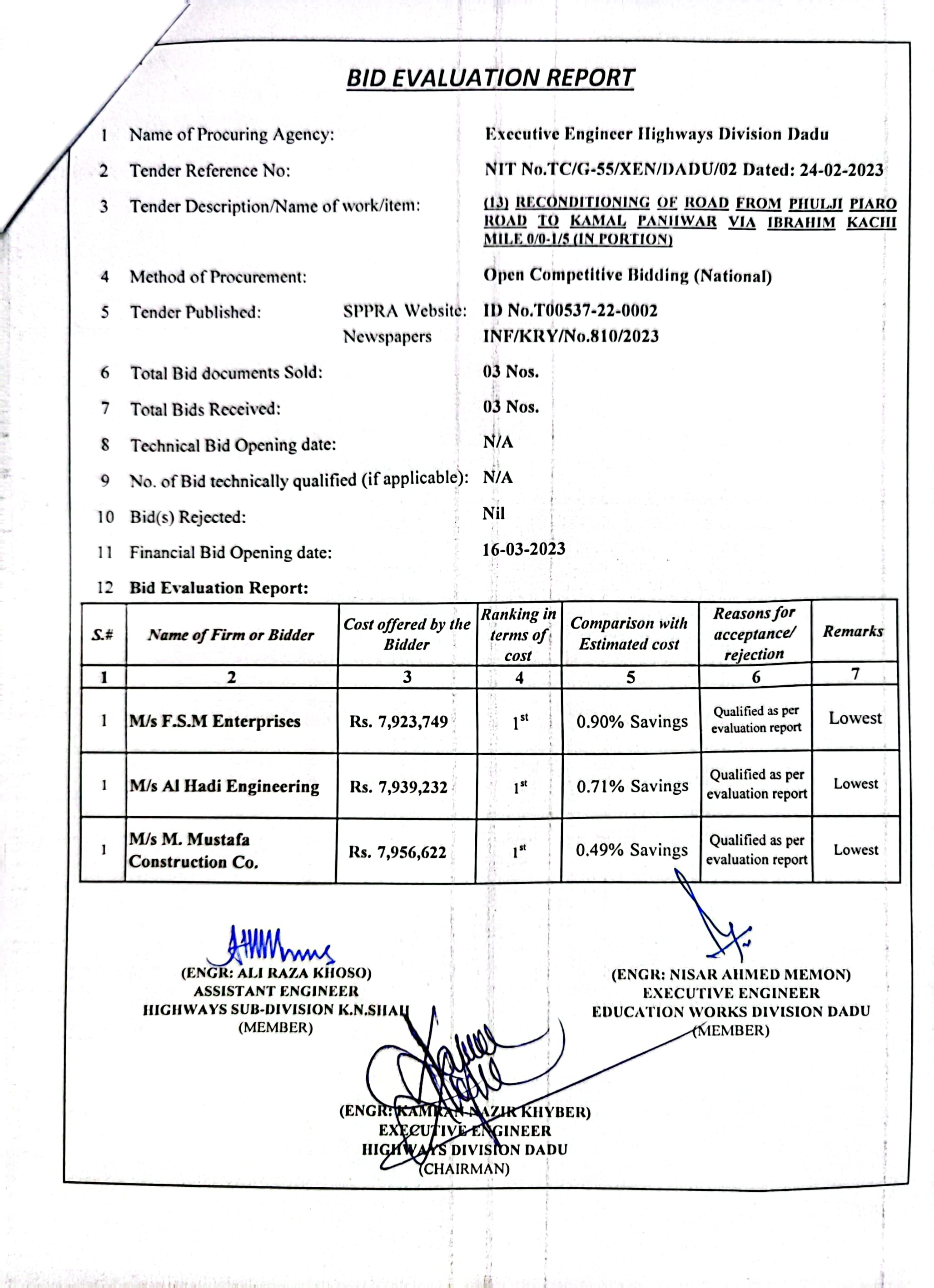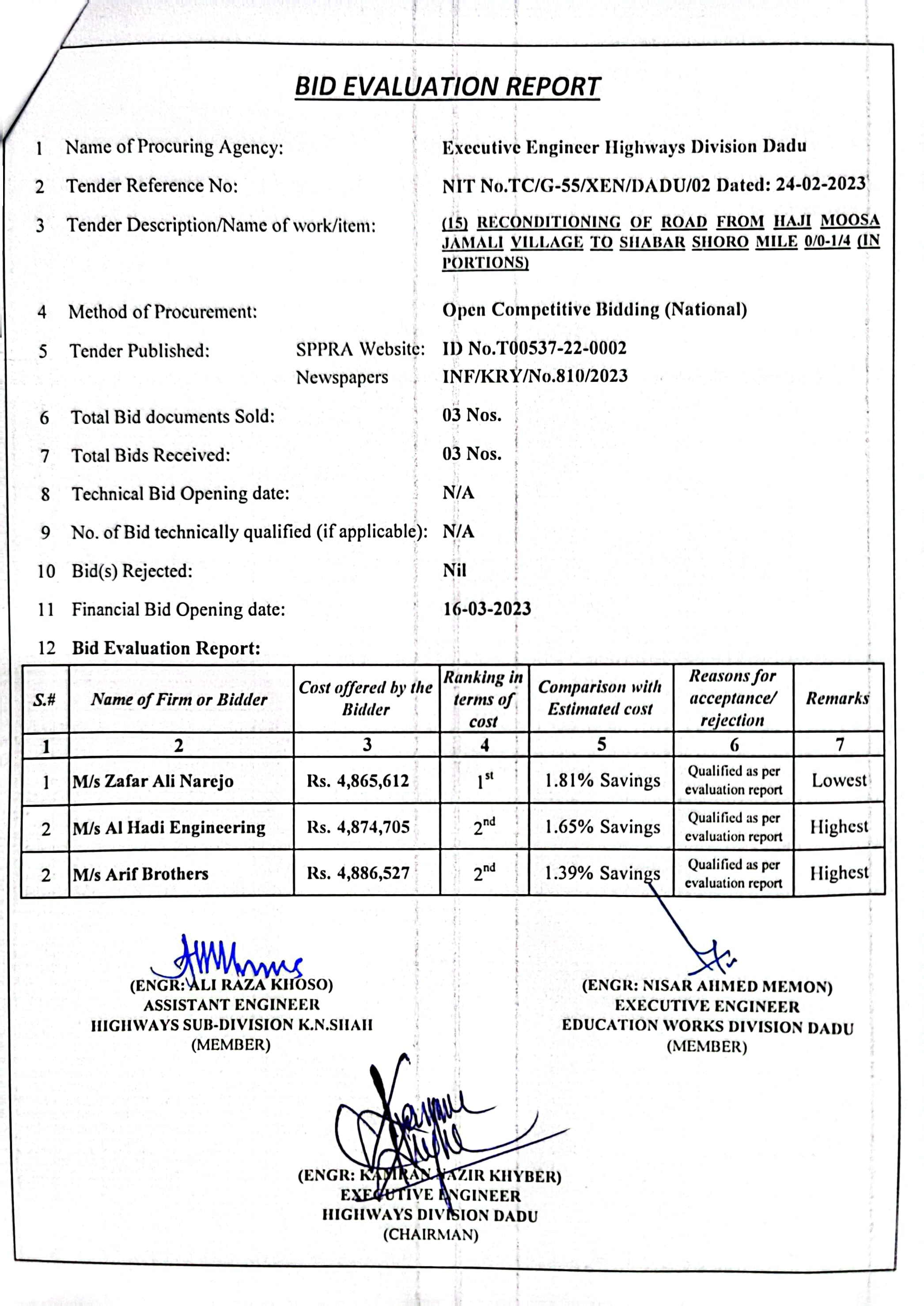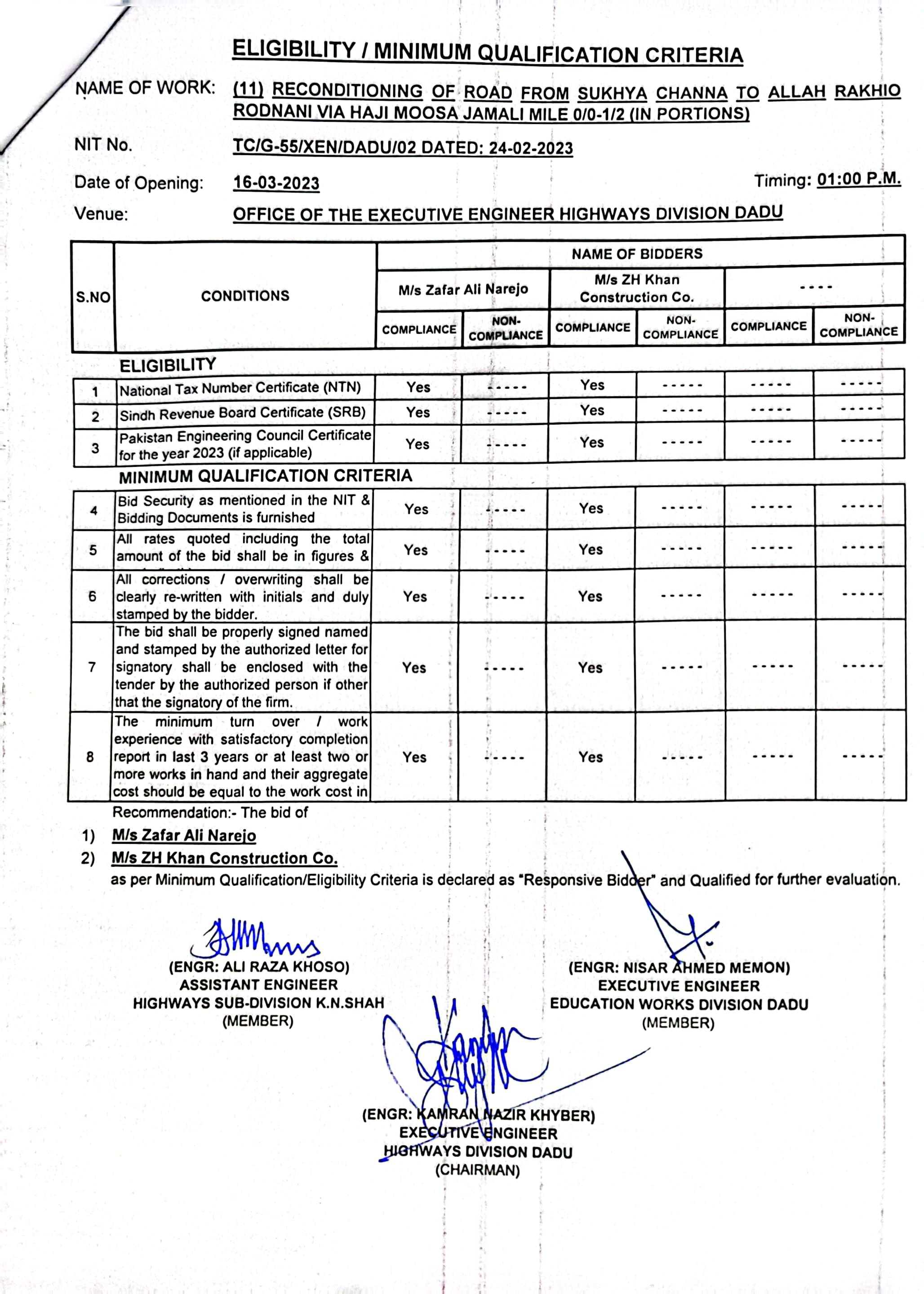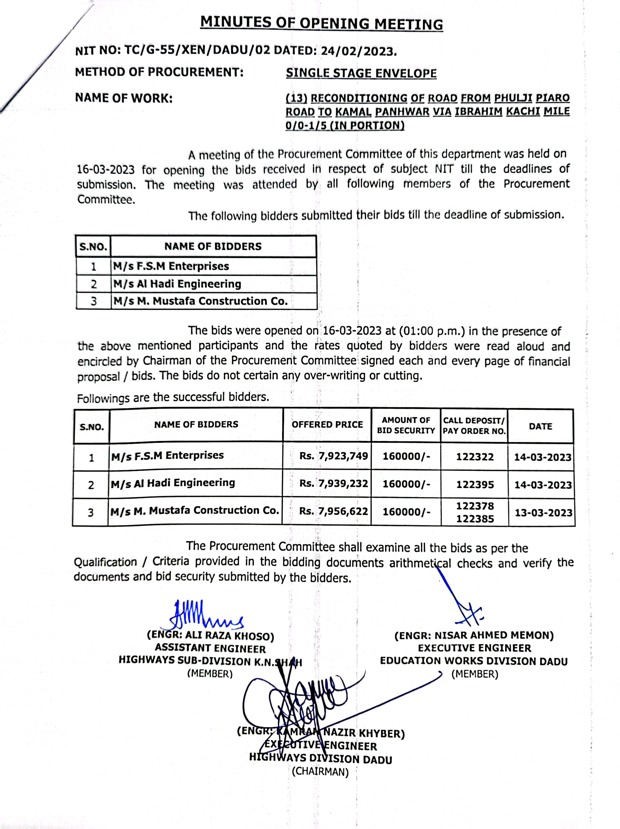 | T00537-22-0002 | BE00537-22-0018 | Improvement of road from Changlani Chowk to Raza Muhammad Khoso Otaque mile 0/0-0/1+330'. | Executive Engineer Highway Division Dadu (51-Works and Services Department) | 20-03-2023 | Dadu | Active |