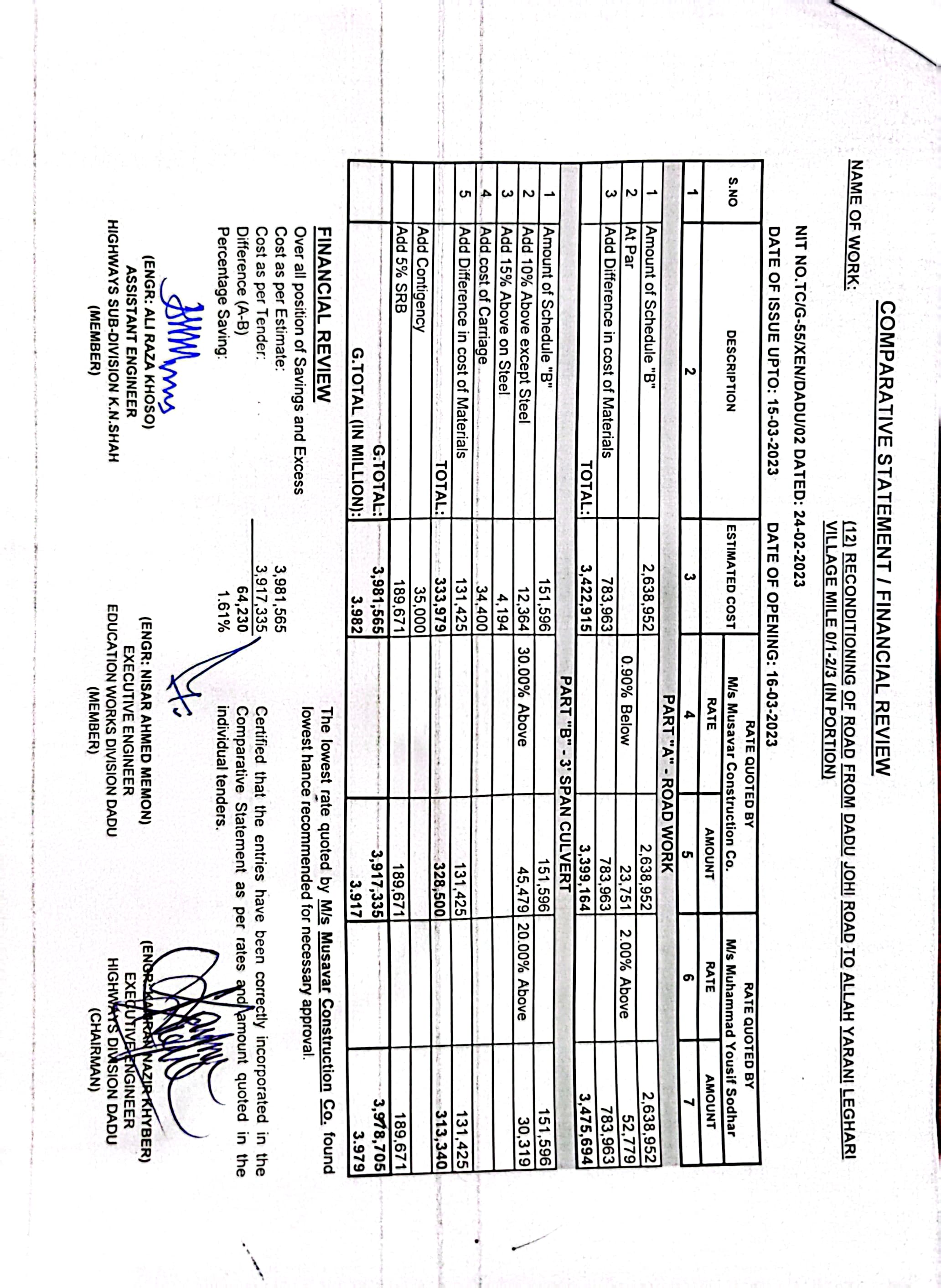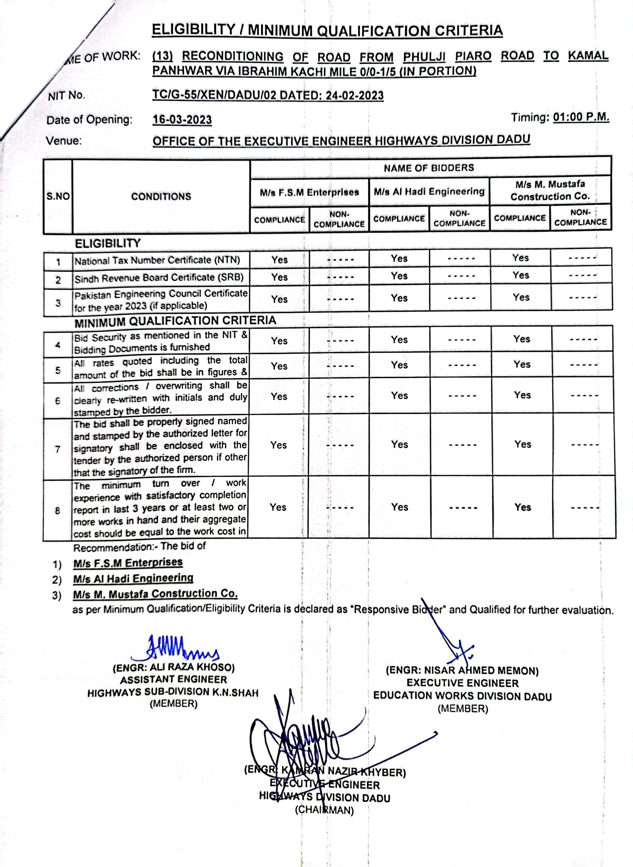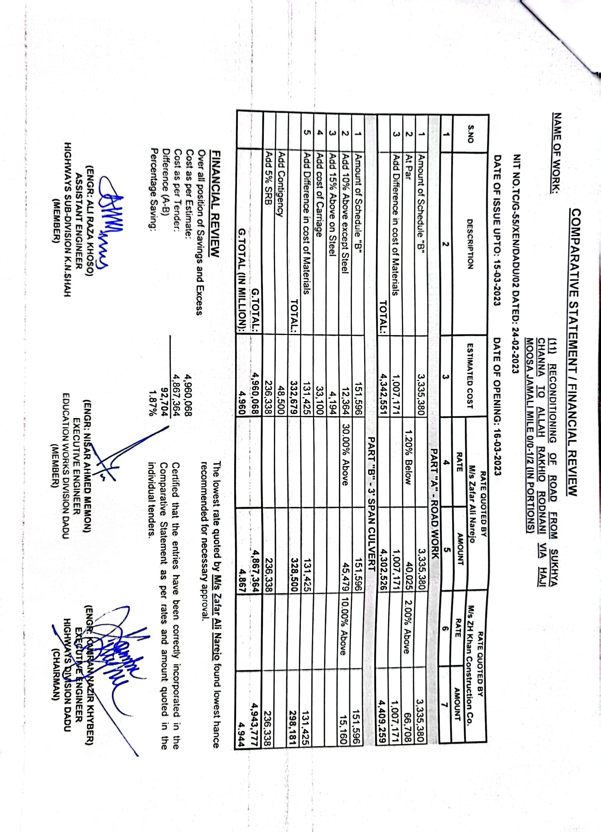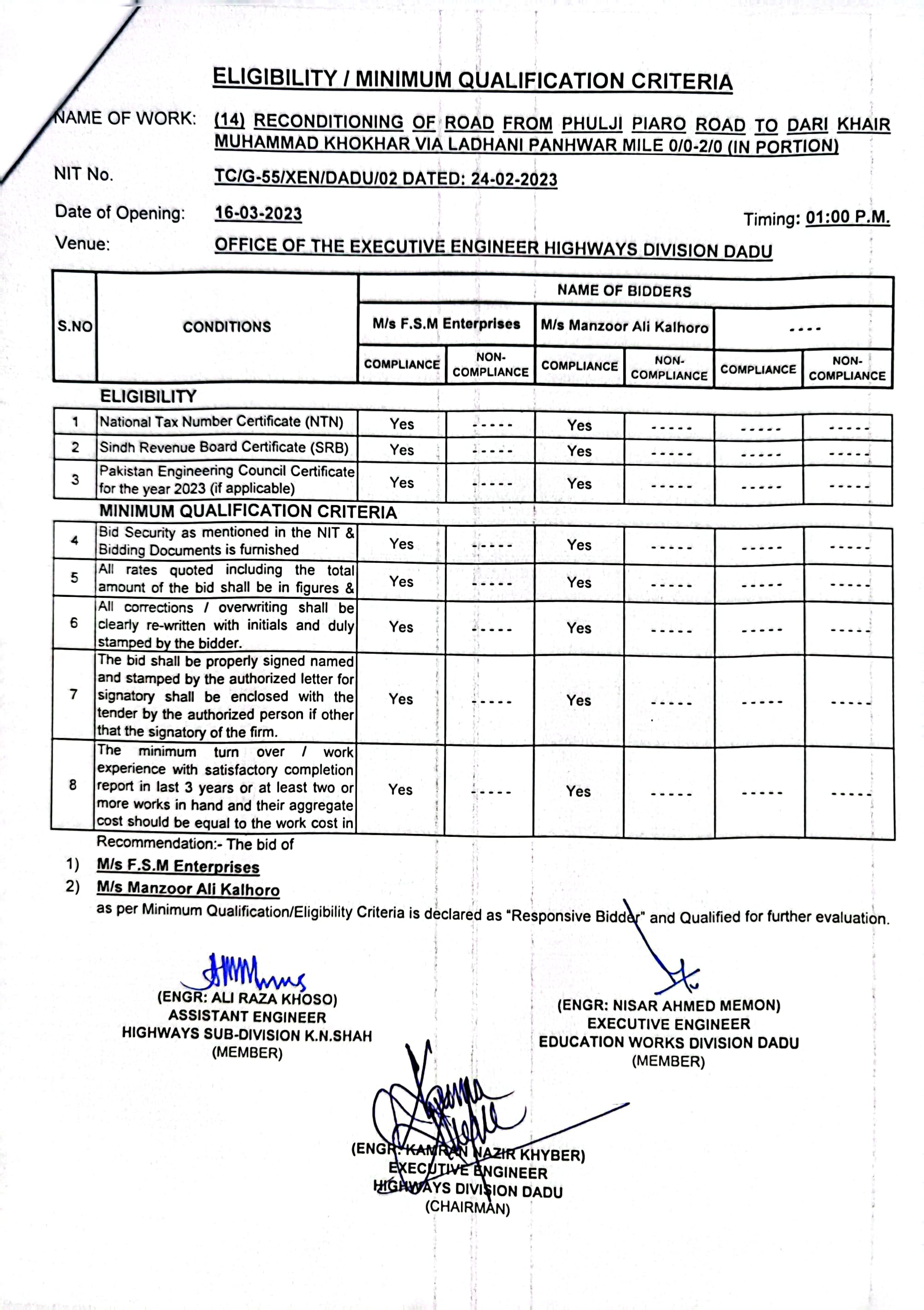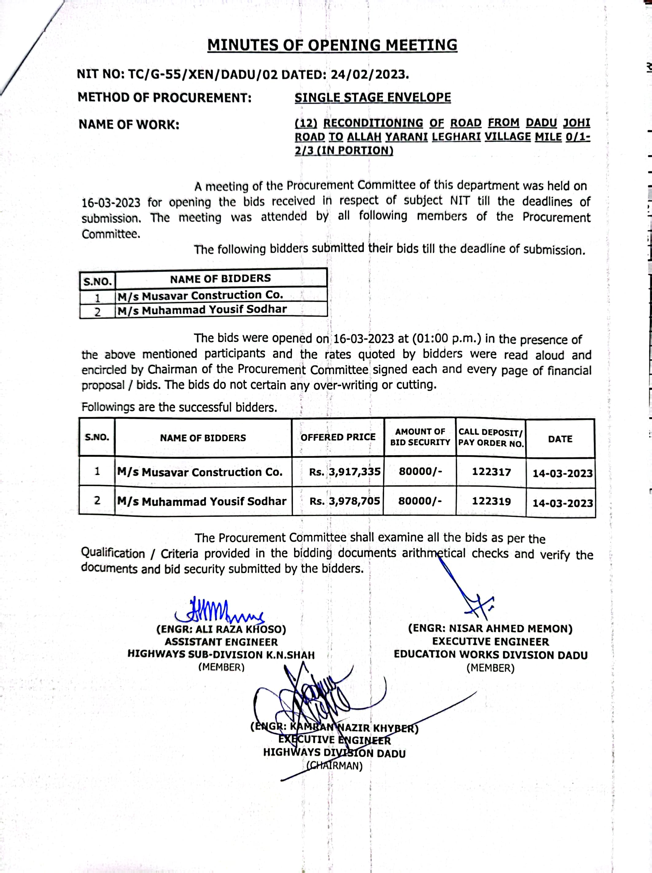 | T00537-22-0002 | BE00537-22-0018 | Improvement of road from Changlani Chowk to Raza Muhammad Khoso Otaque mile 0/0-0/1+330'. | Executive Engineer Highway Division Dadu (51-Works and Services Department) | 20-03-2023 | Dadu | Active |