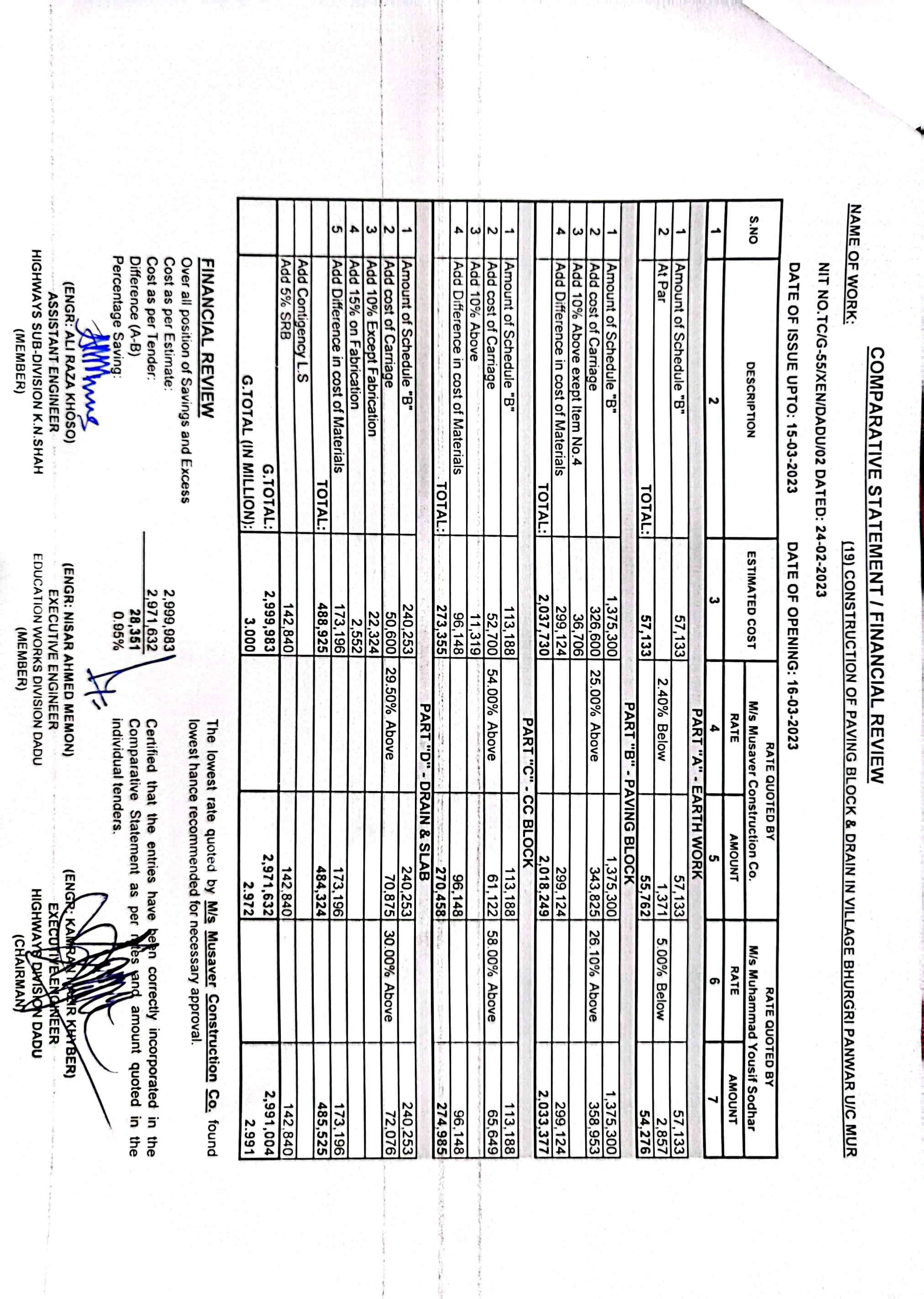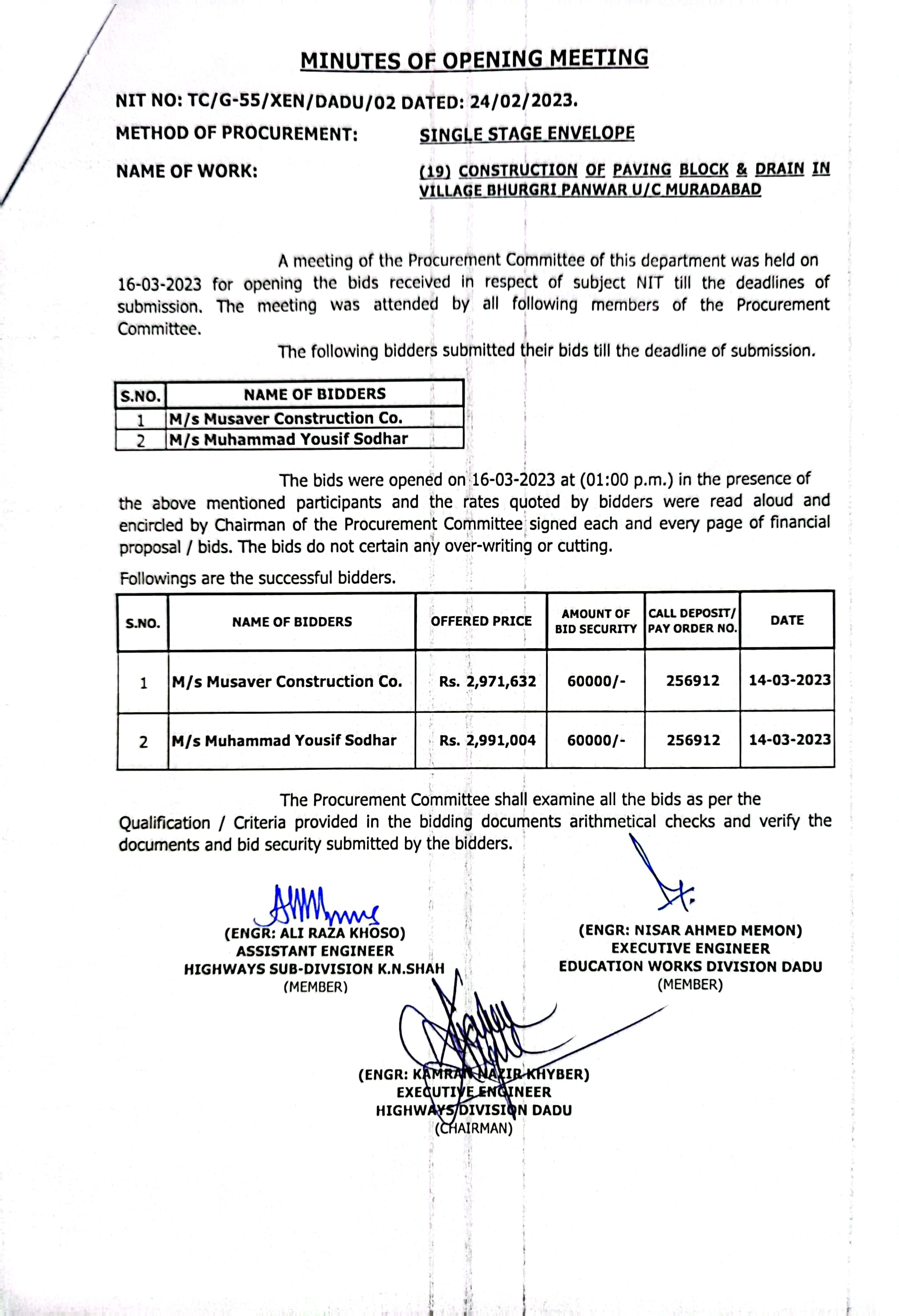 | T00537-22-0002 | BE00537-22-0019 | 19.Construction of Paving Block & Drain in village Bhurgri Panwar U/C Muradabad | Executive Engineer Highway Division Dadu (51-Works and Services Department) | 20-03-2023 | Dadu | Active |