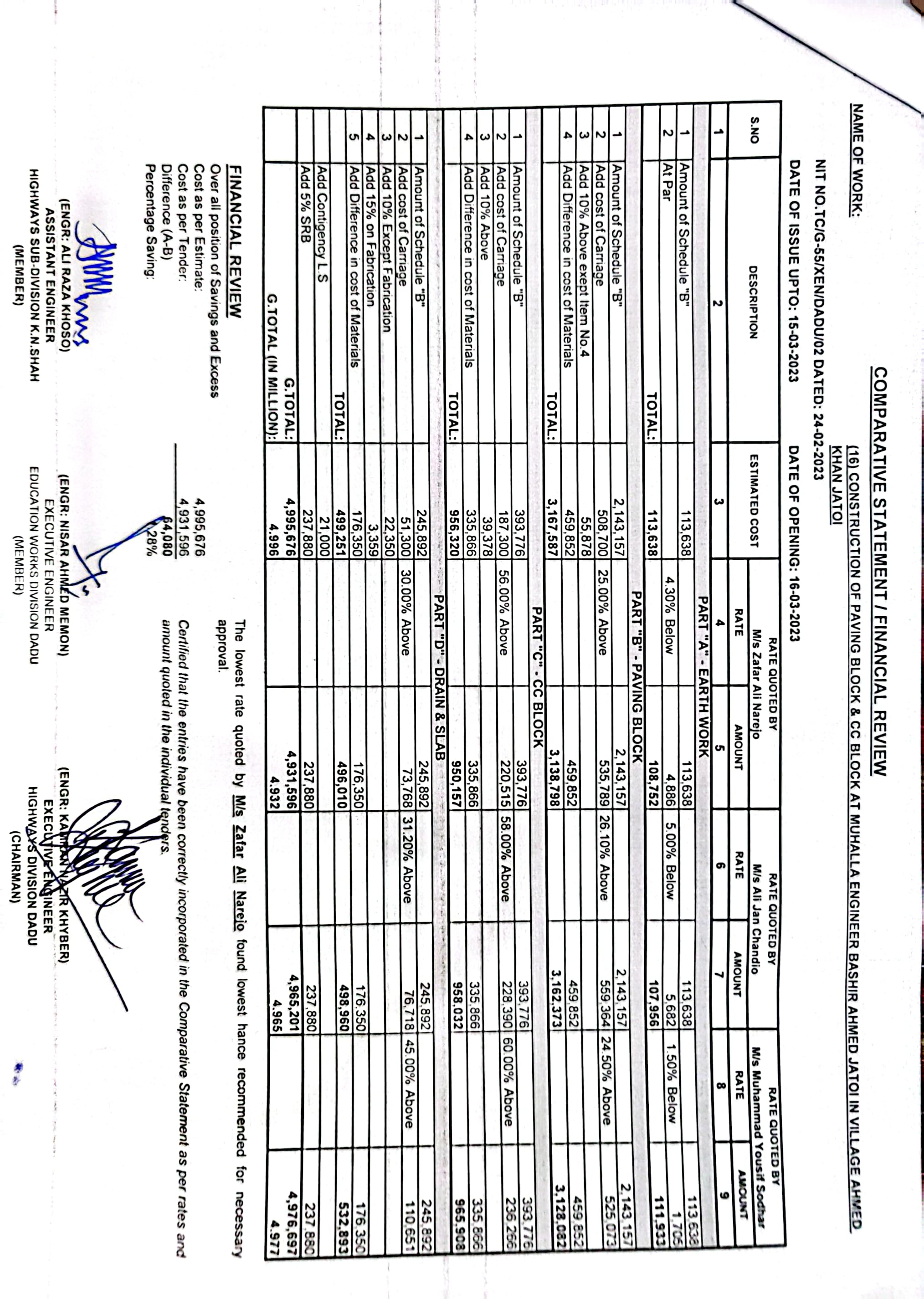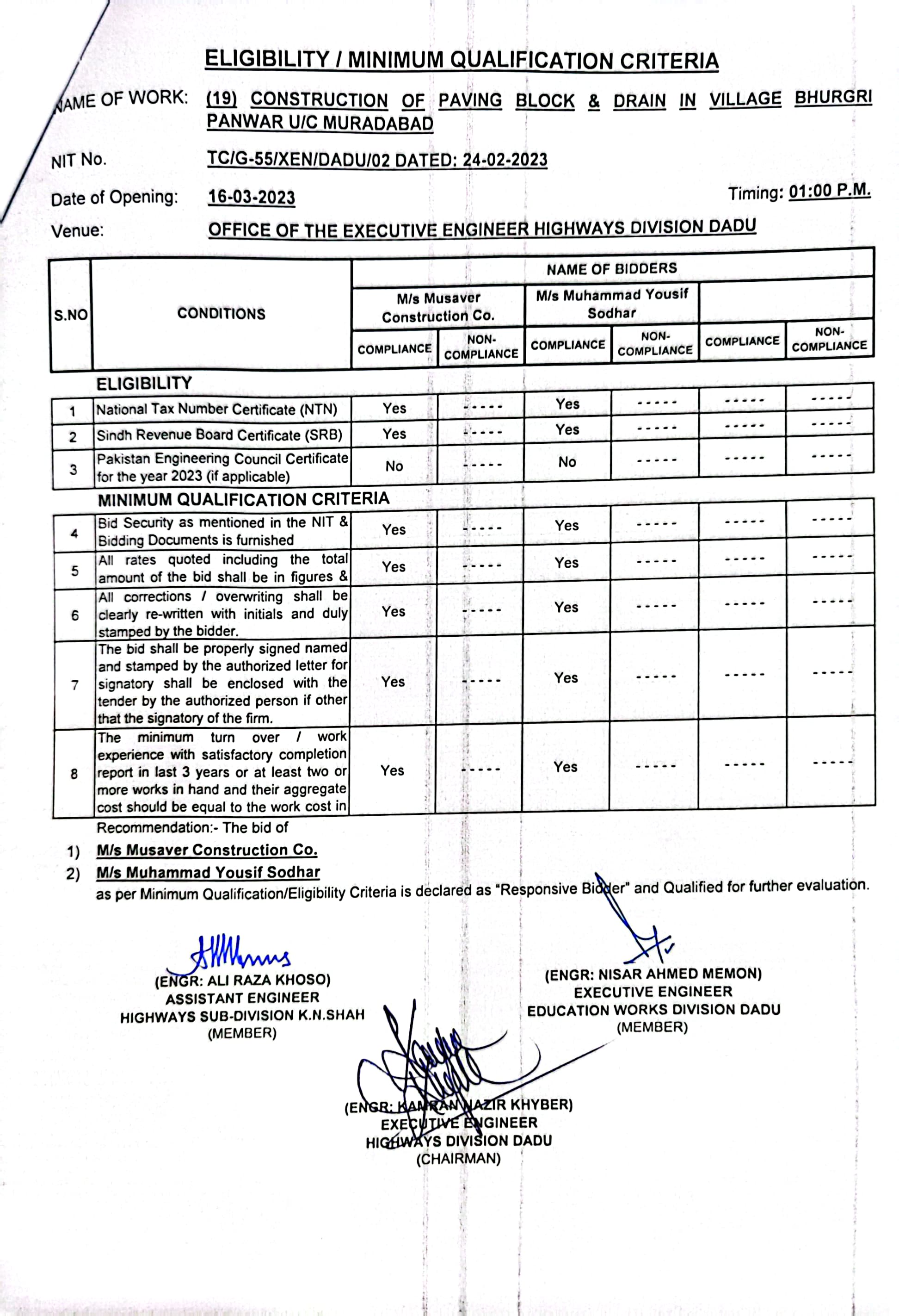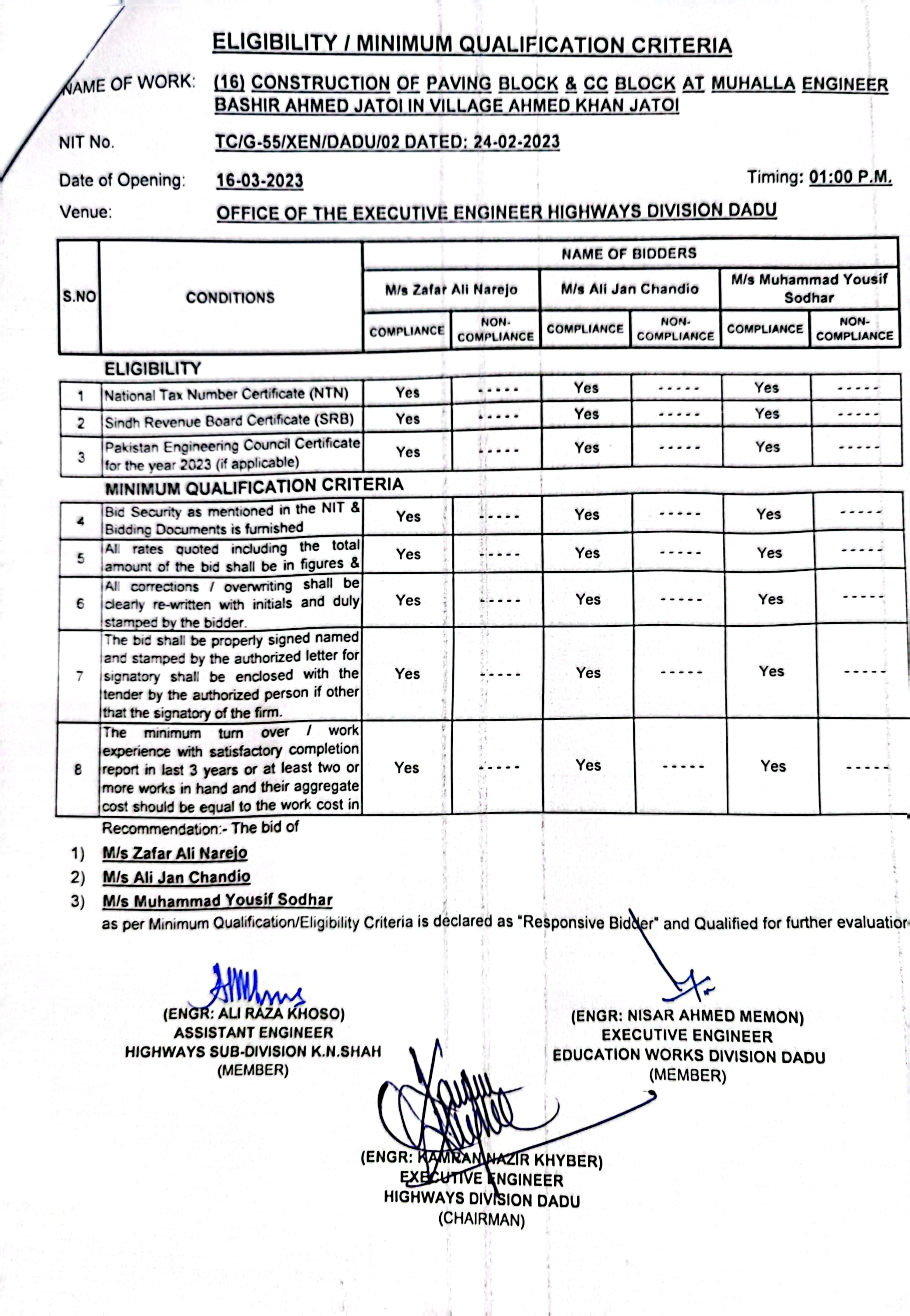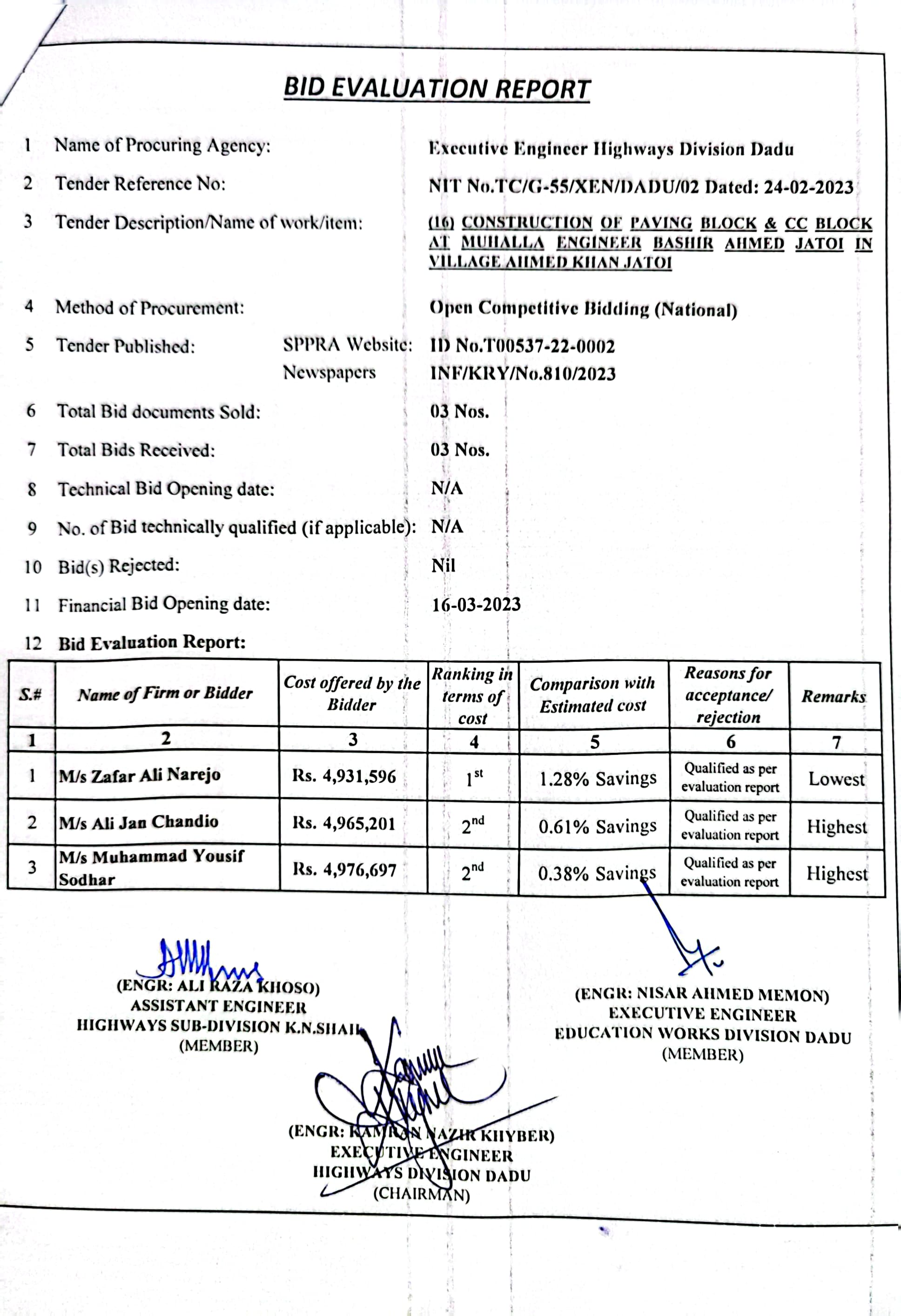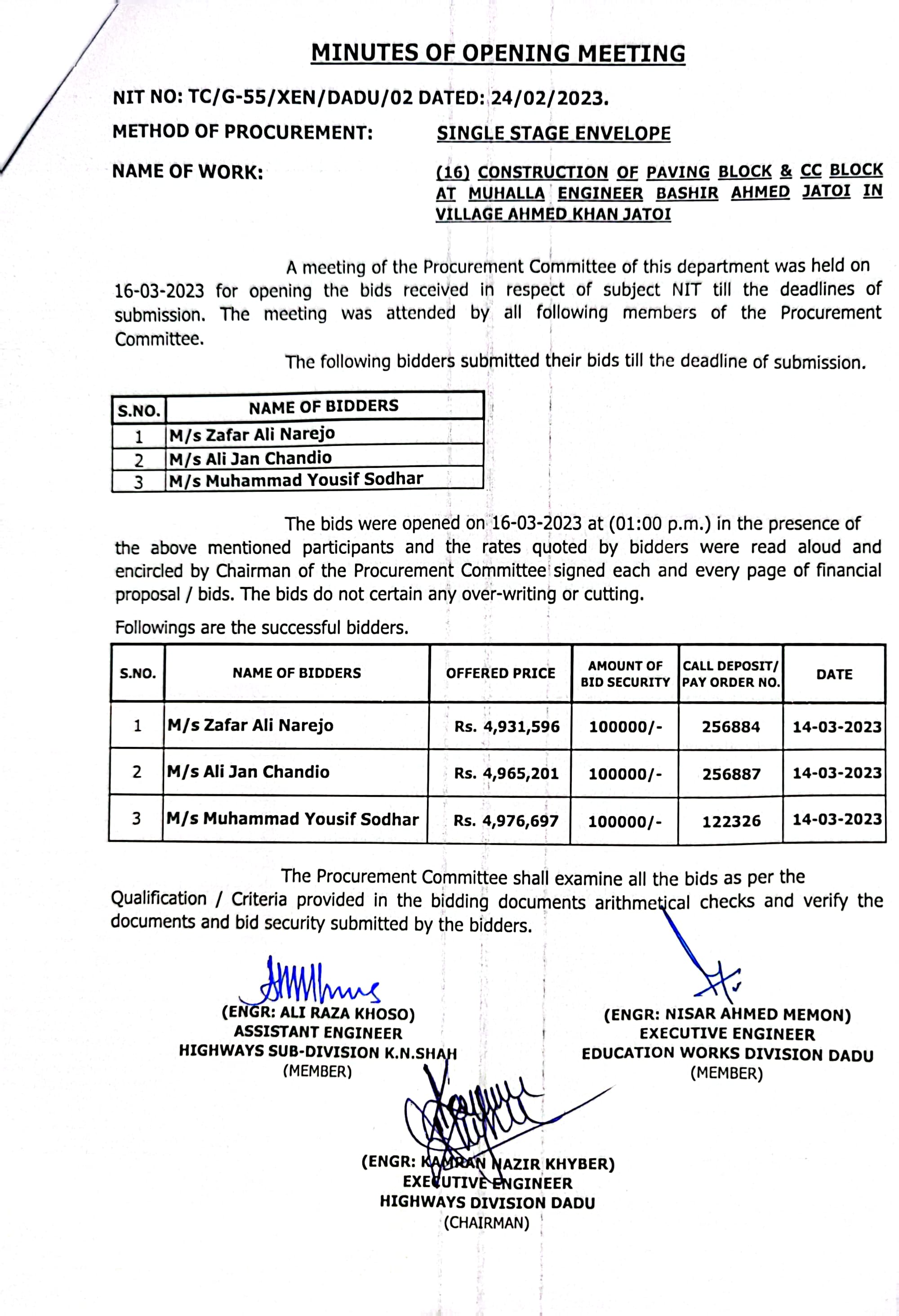 | T00537-22-0002 | BE00537-22-0016 | 16.Construction of Paving Block & CC Block at Muhalla Engineer Bashir Ahmed Jatoi in village Ahmed Khan Jatoi | Executive Engineer Highway Division Dadu (51-Works and Services Department) | 20-03-2023 | Dadu | Active |