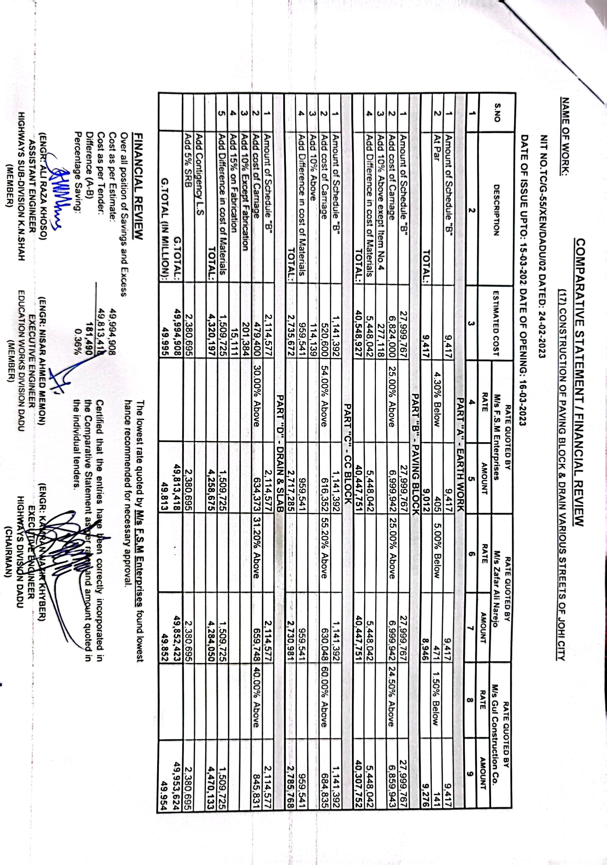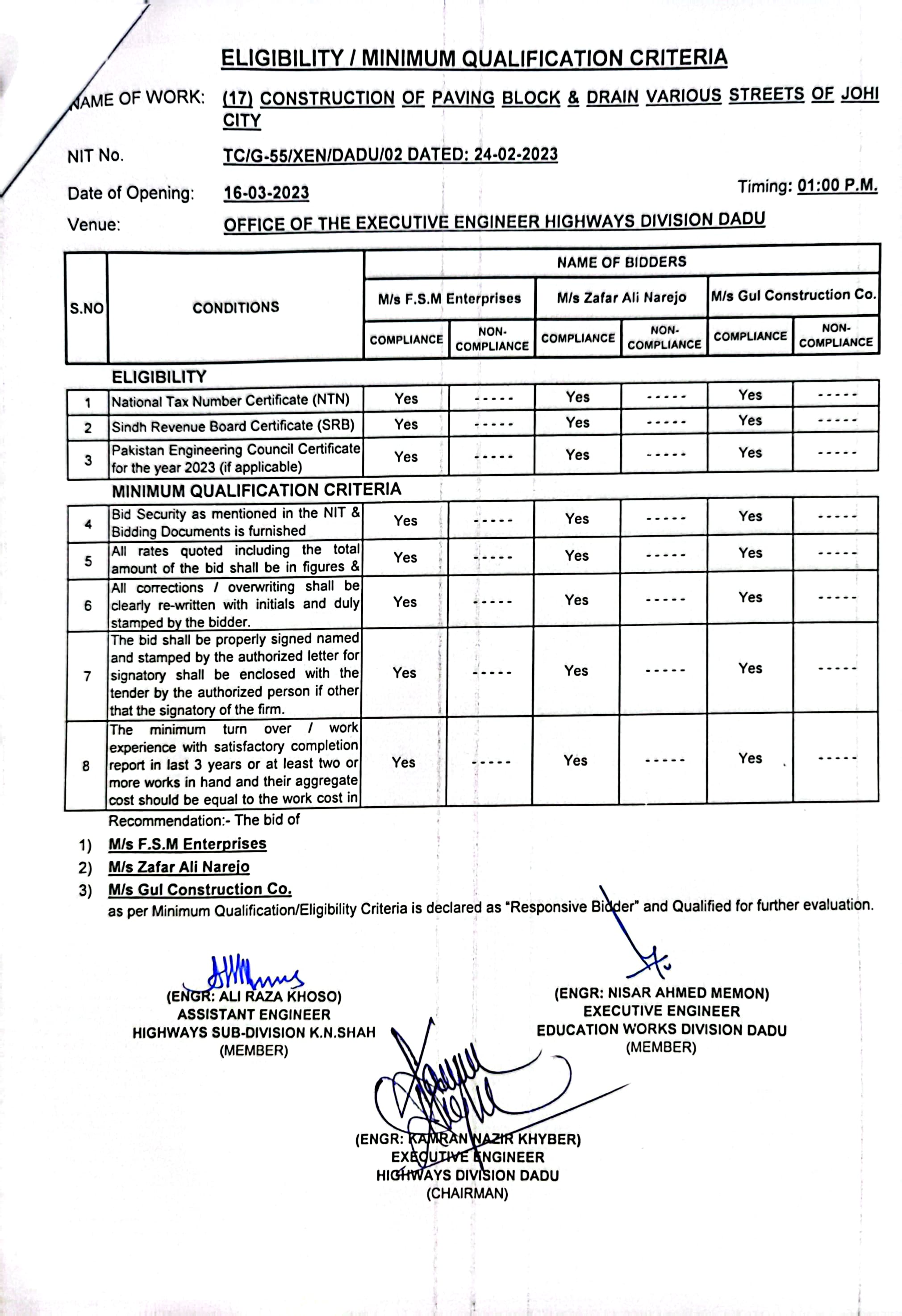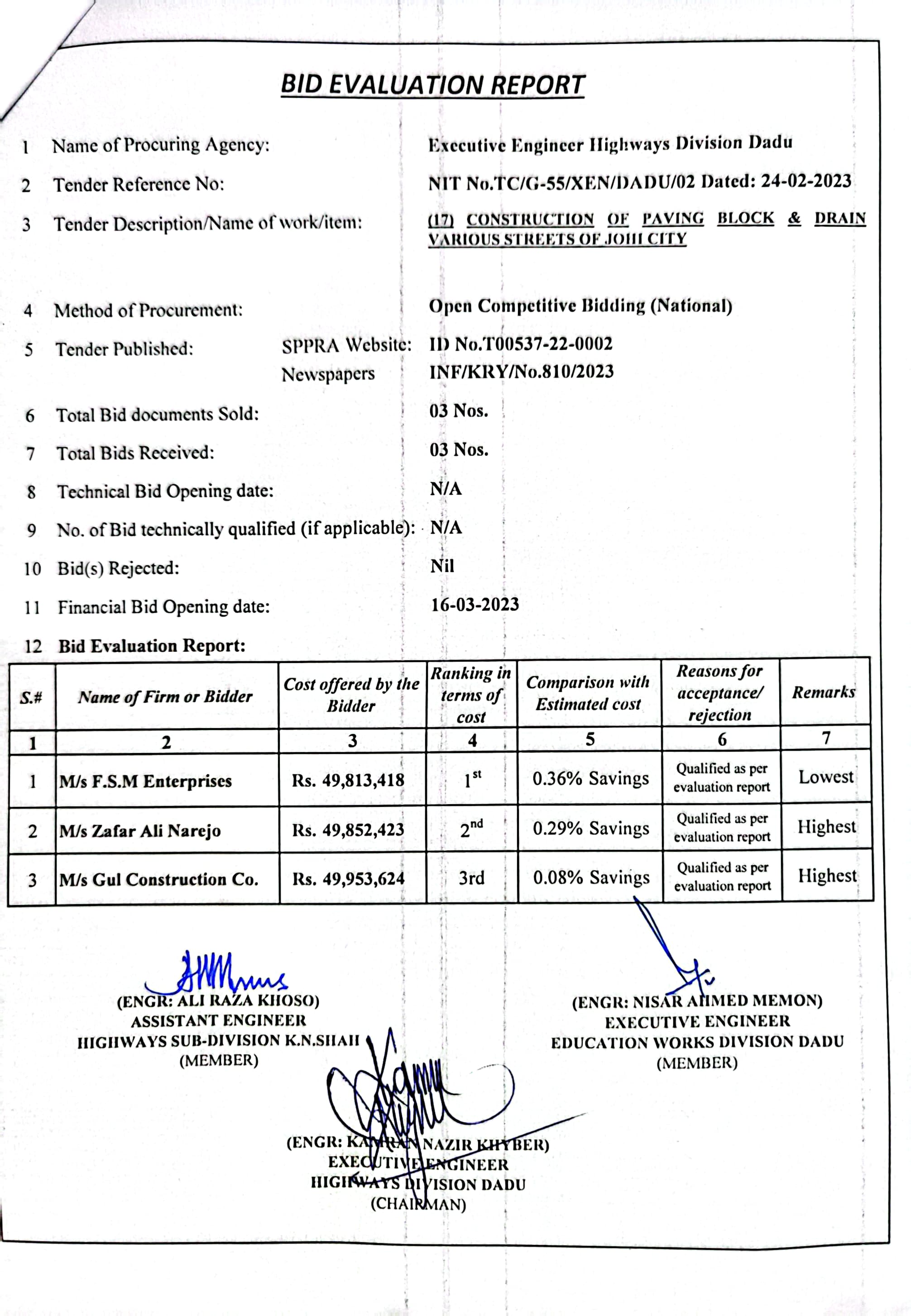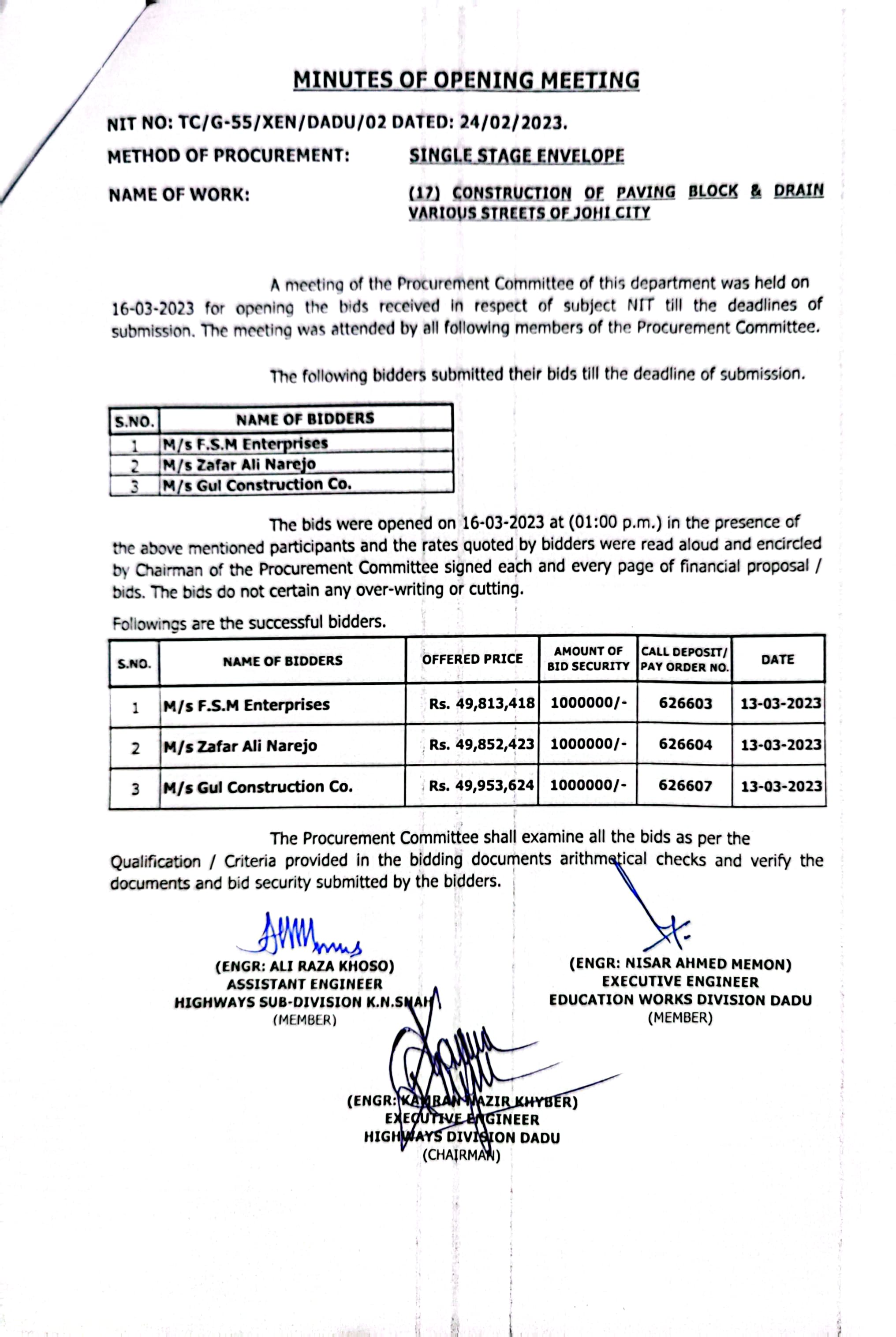 | T00537-22-0002 | BE00537-22-0017 | 17.Construction of Paving Block & Drain various Streets of Johi City | Executive Engineer Highway Division Dadu (51-Works and Services Department) | 20-03-2023 | Dadu | Active |