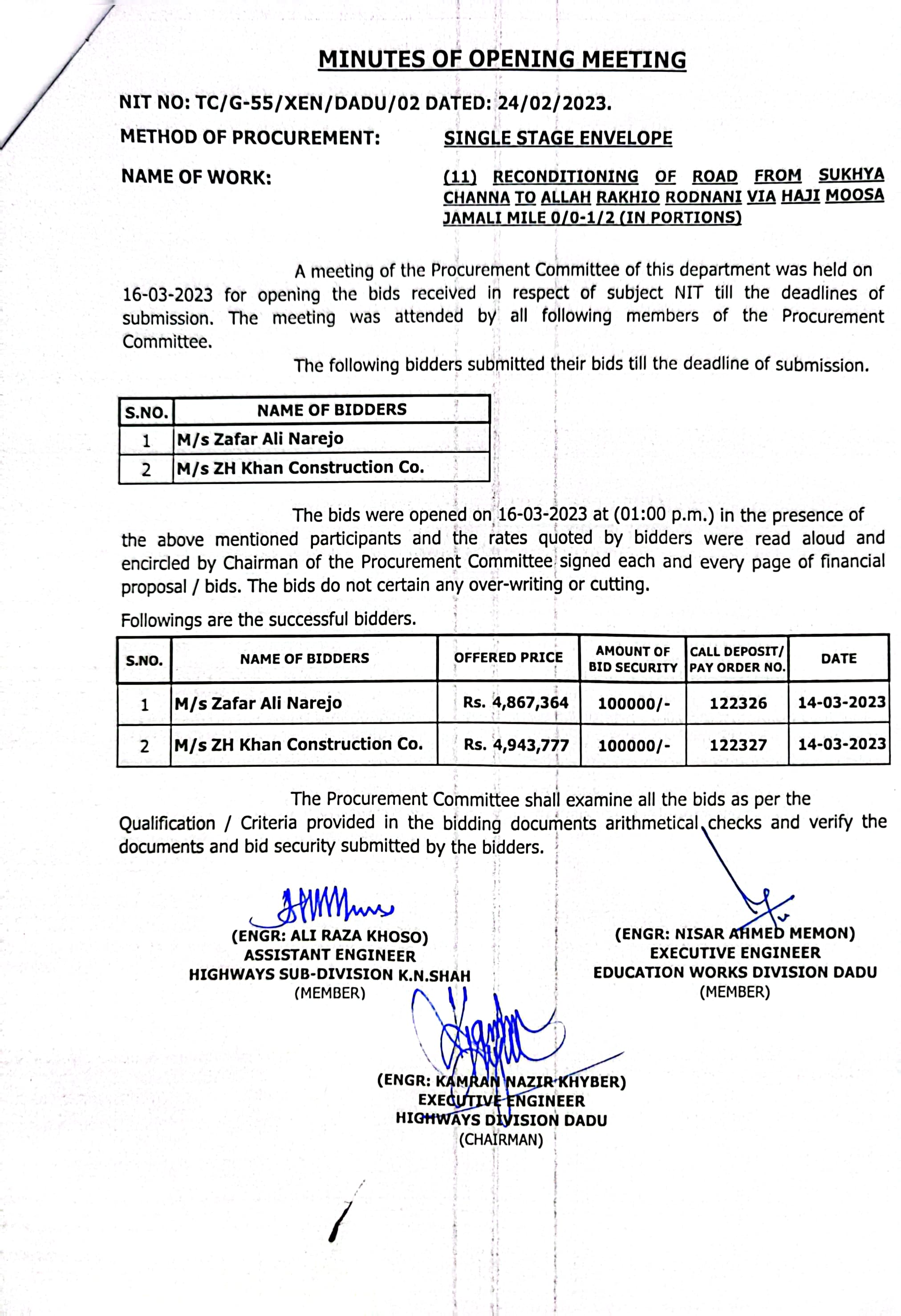 | T00537-22-0002 | BE00537-22-0011 | 11.Reconditioning of road from Sukhya Channa to Allah Rakhio Rodnani via Haji Moosa Jamali mile 0/0-1/2 (in portions) | Executive Engineer Highway Division Dadu (51-Works and Services Department) | 20-03-2023 | Dadu | Active |