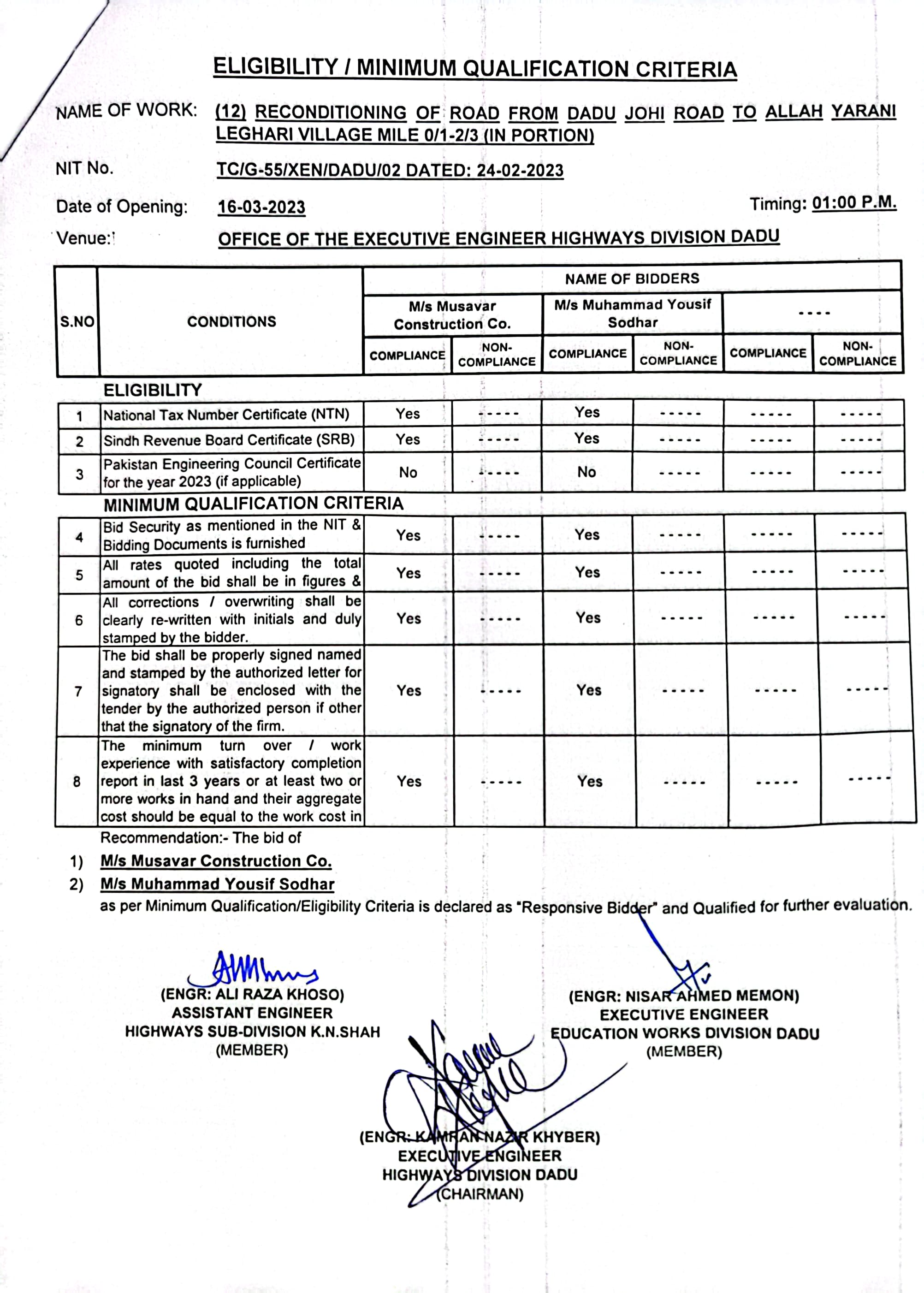 | T00537-22-0002 | BE00537-22-0012 | 12.Reconditioning of road from Dadu Johi road to Allah Yarani Leghari village mile 0/1-2/3 (in portion) | Executive Engineer Highway Division Dadu (51-Works and Services Department) | 20-03-2023 | Dadu | Active |