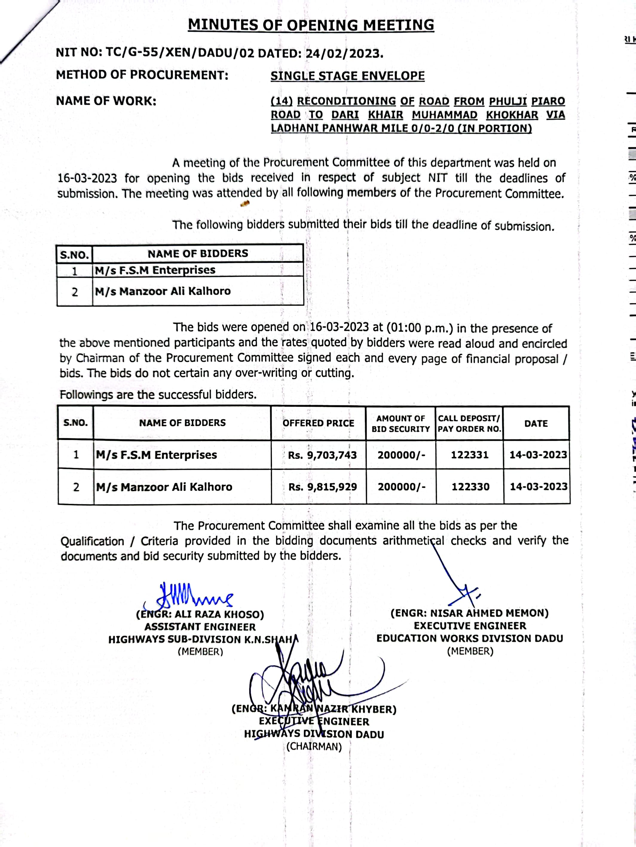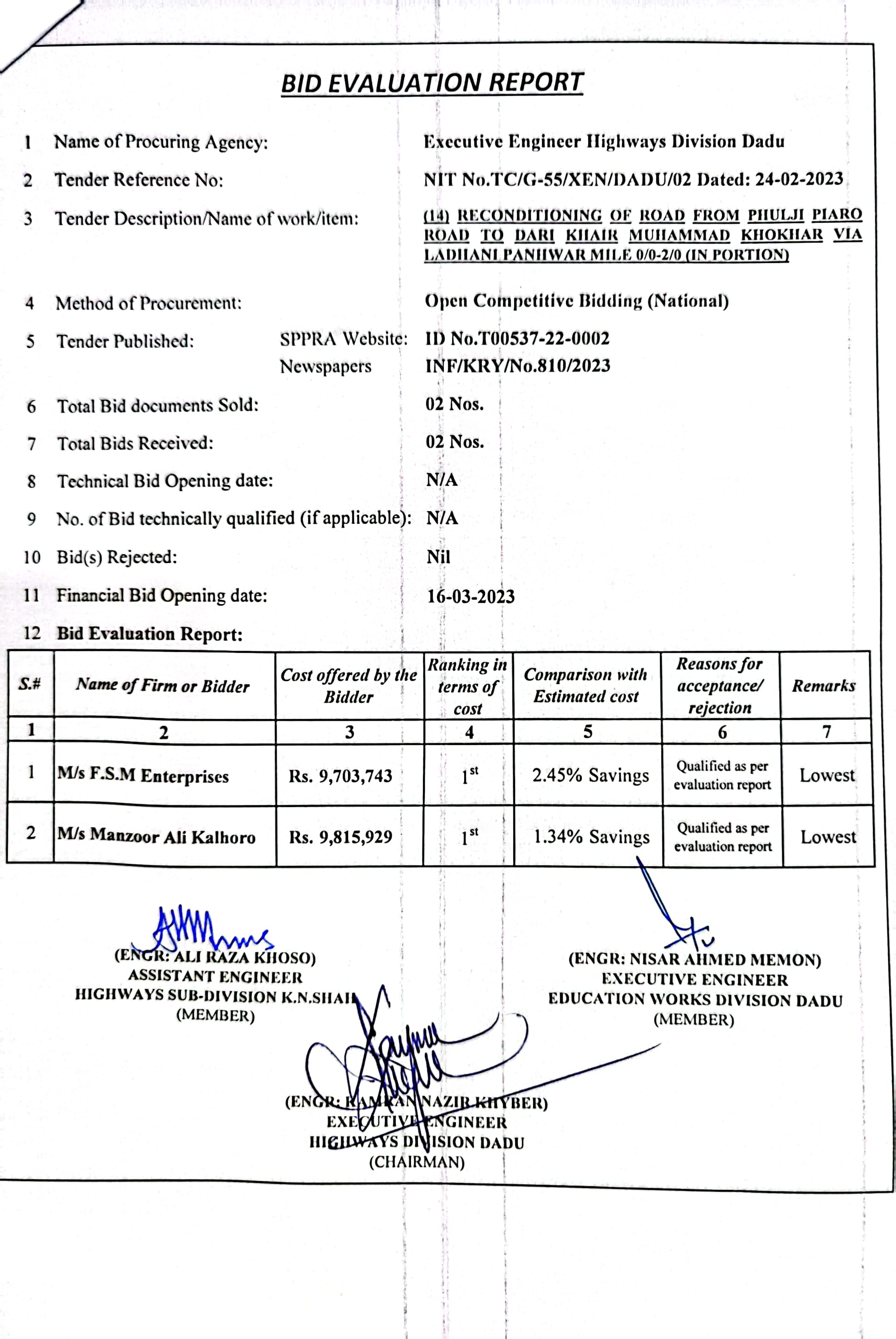 | T00537-22-0002 | BE00537-22-0014 | 14.Reconditioning of road from Phulji Piaro road to Dari Khair Muhammad Khokhar via Ladhani Panhwar mile 0/0-2/0 (in portion) | Executive Engineer Highway Division Dadu (51-Works and Services Department) | 20-03-2023 | Dadu | Active |