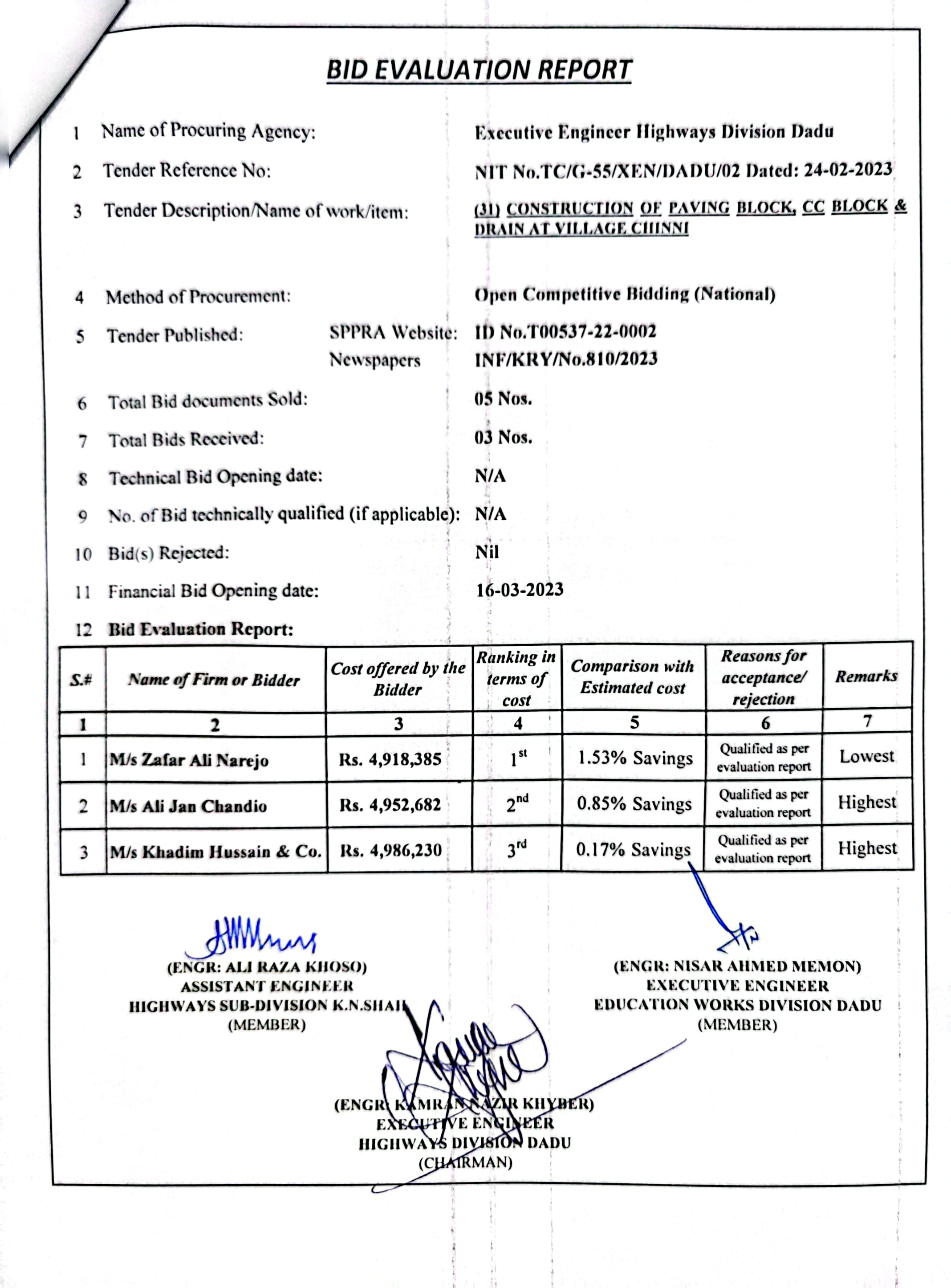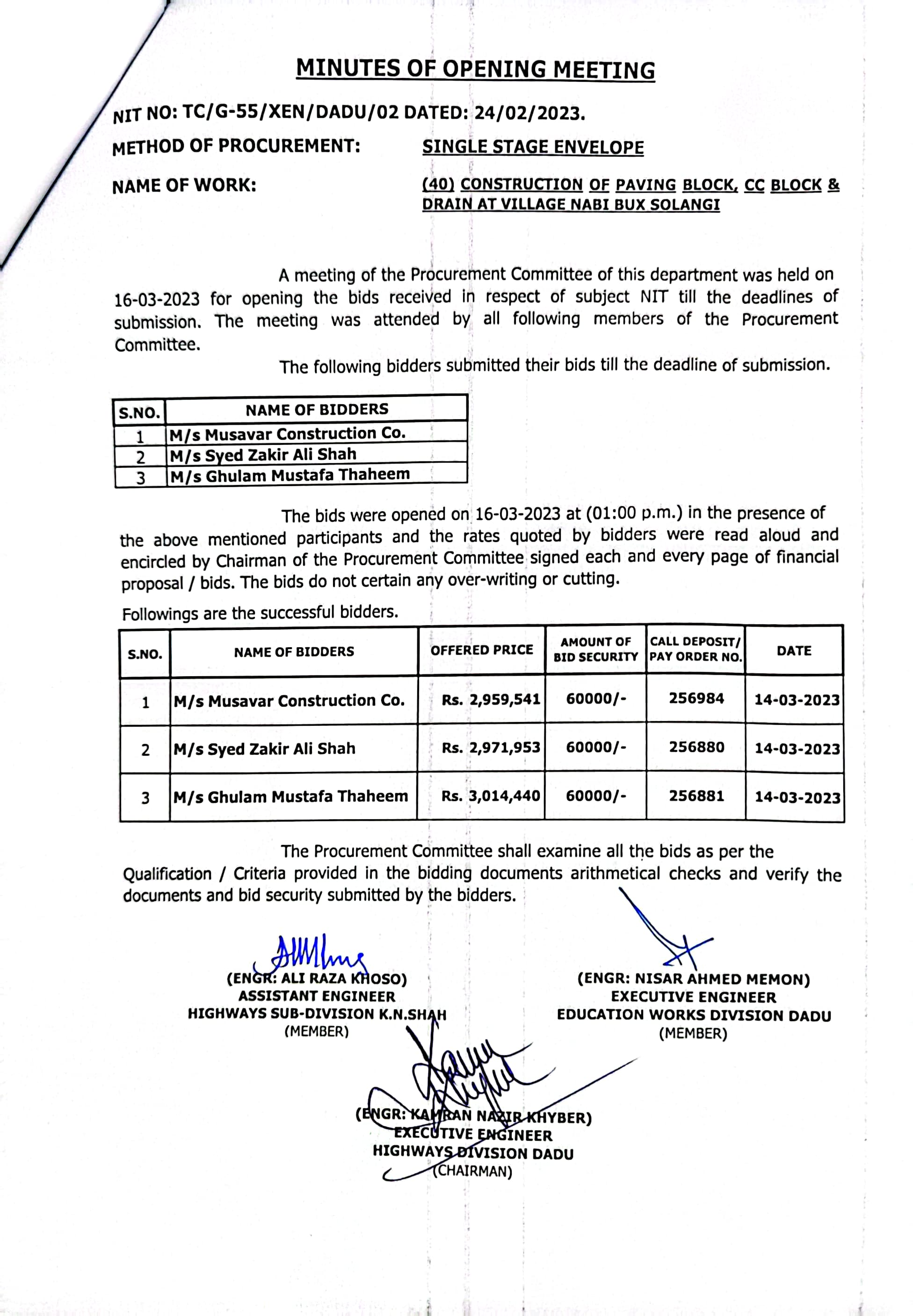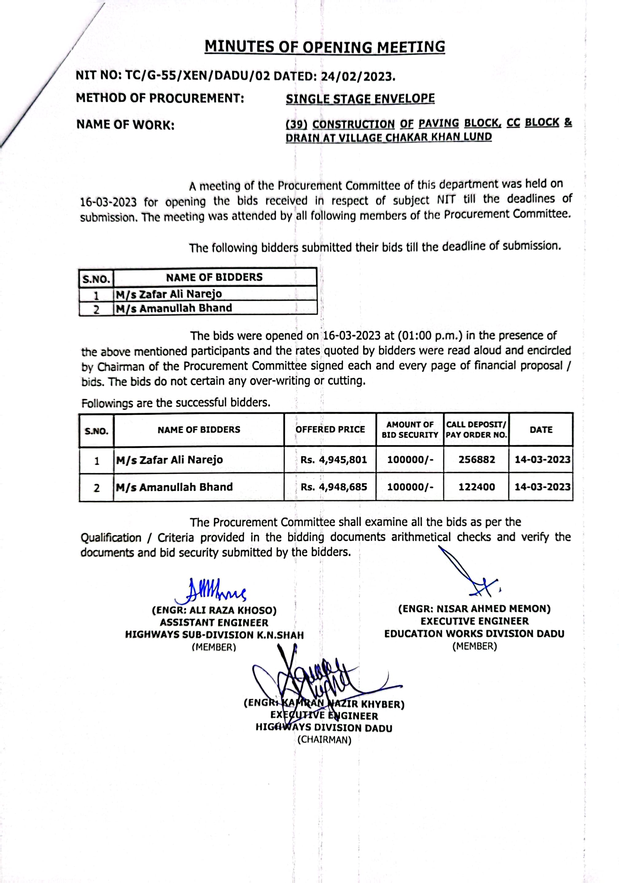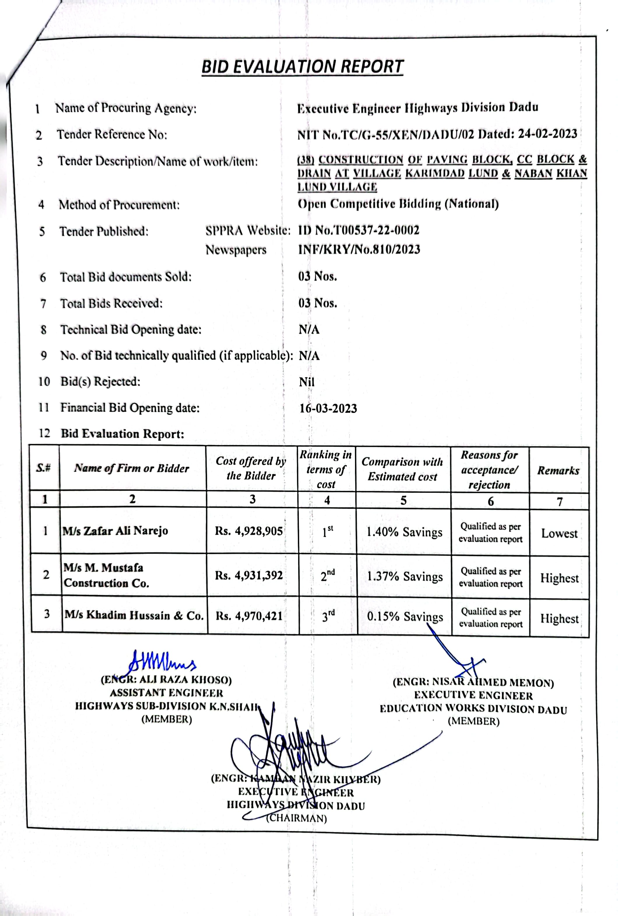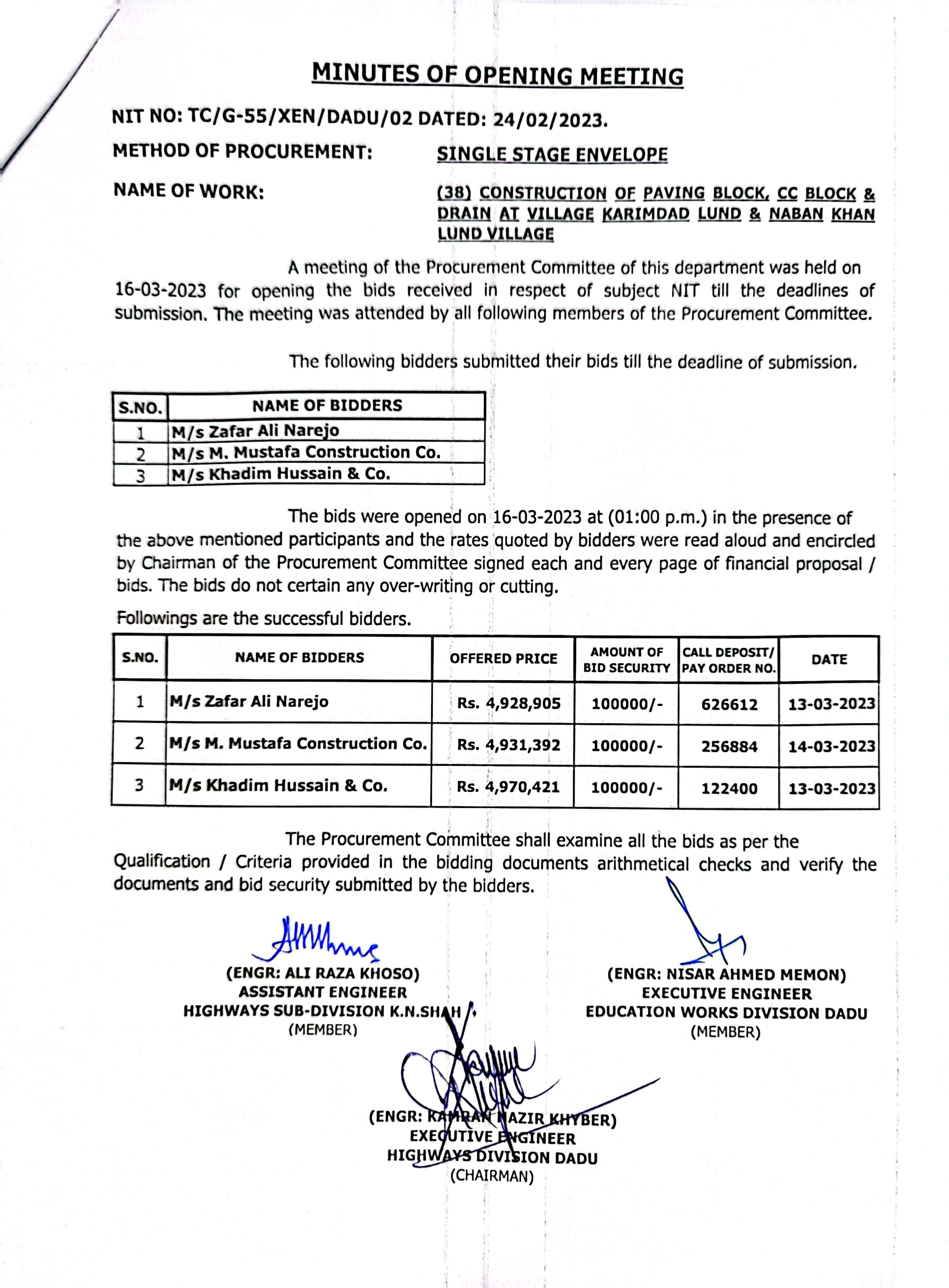 | T00537-22-0002 | BE00537-22-0038 | Construction of Paving Block, CC Block & Drain at village Karimdad Lund & Naban Khan Lund village | Executive Engineer Highway Division Dadu (51-Works and Services Department) | 20-03-2023 | Dadu | Active |
