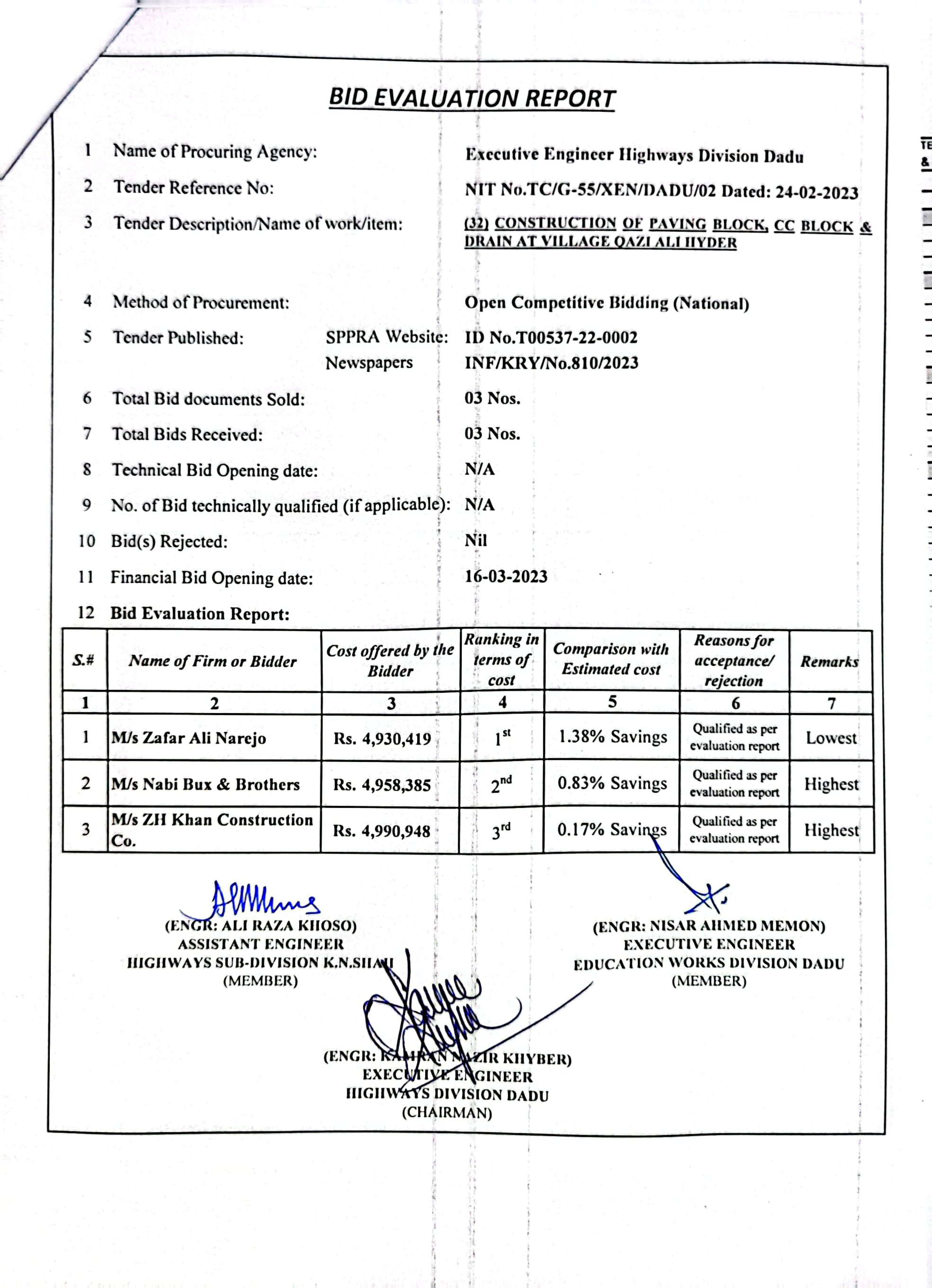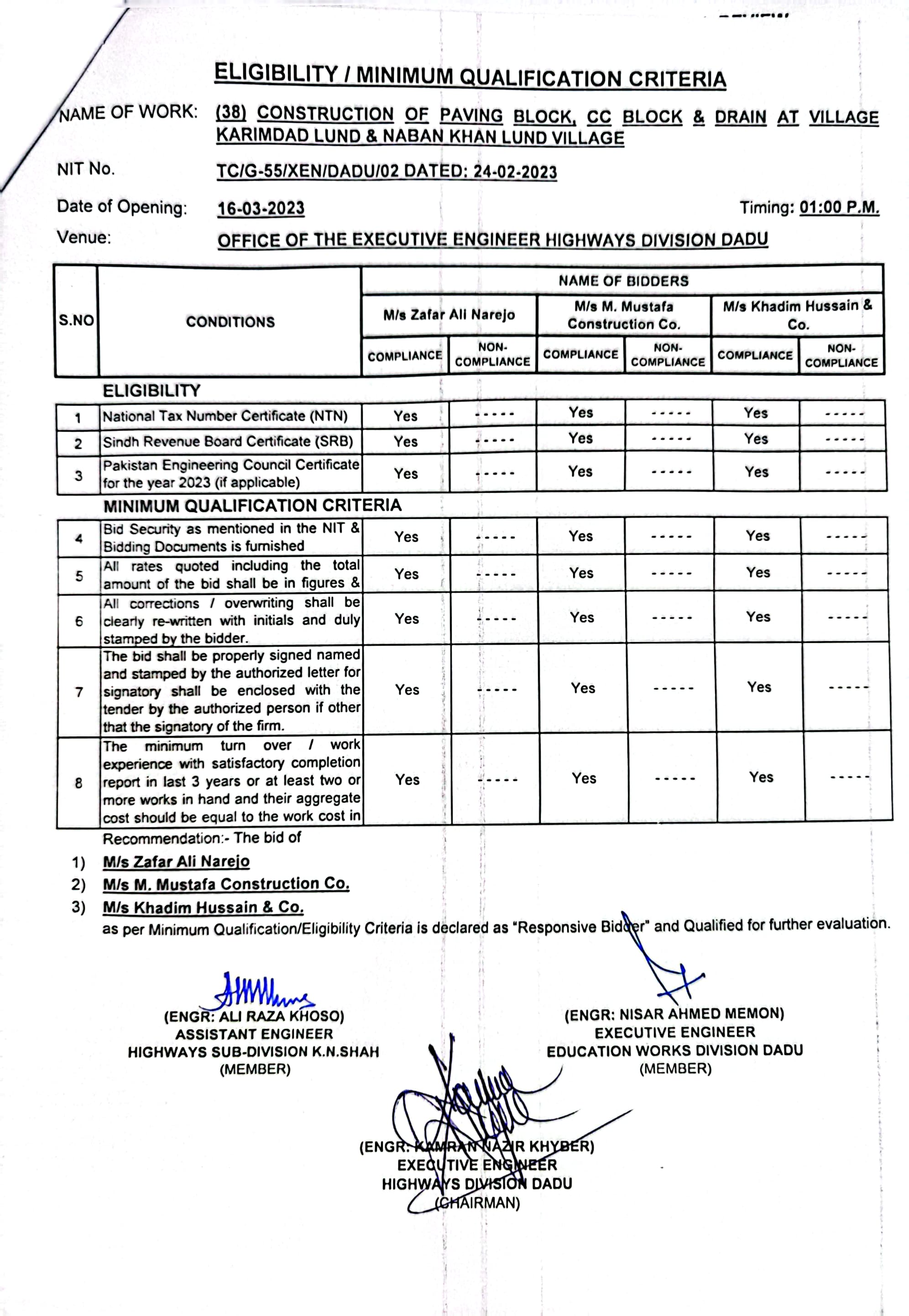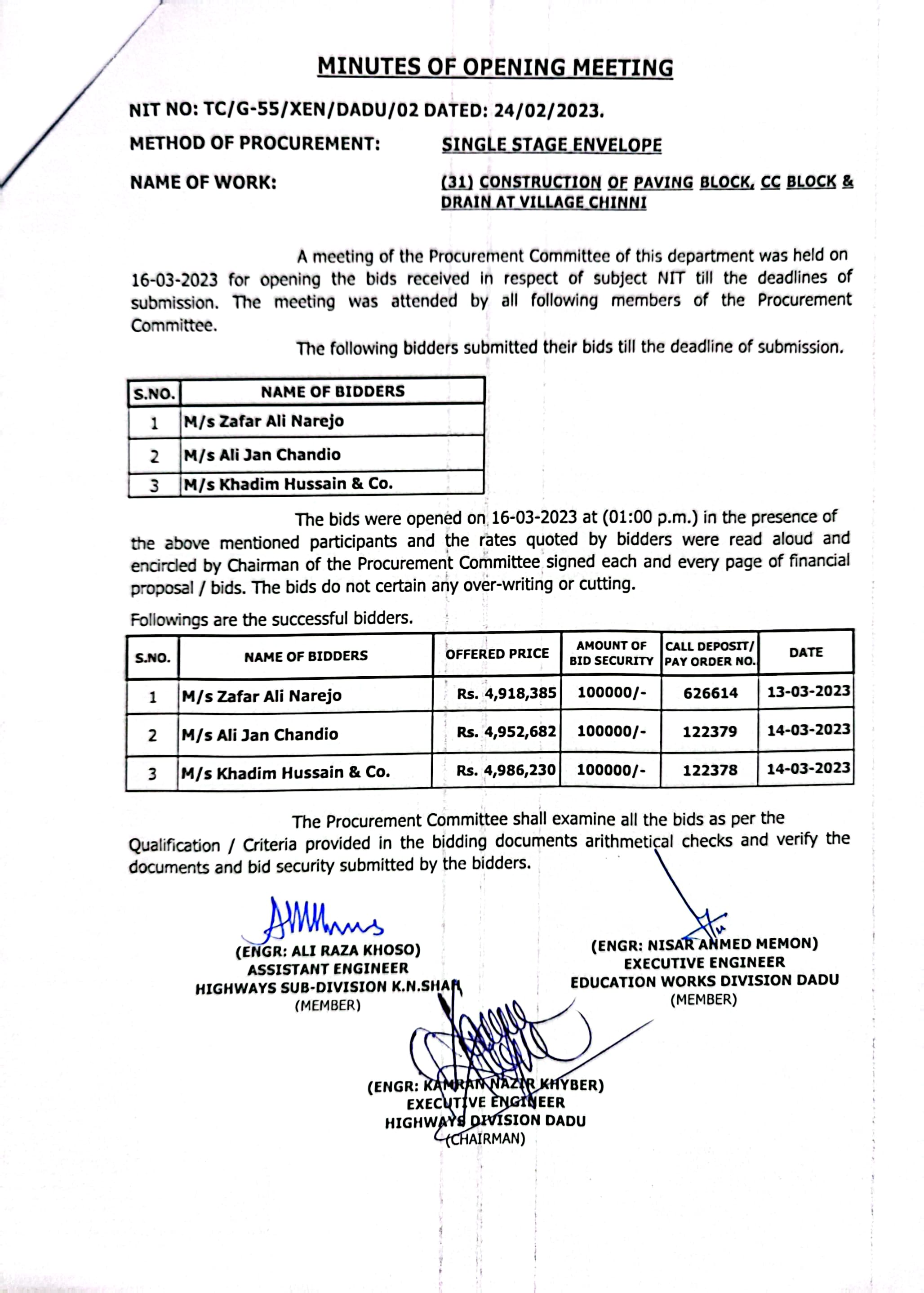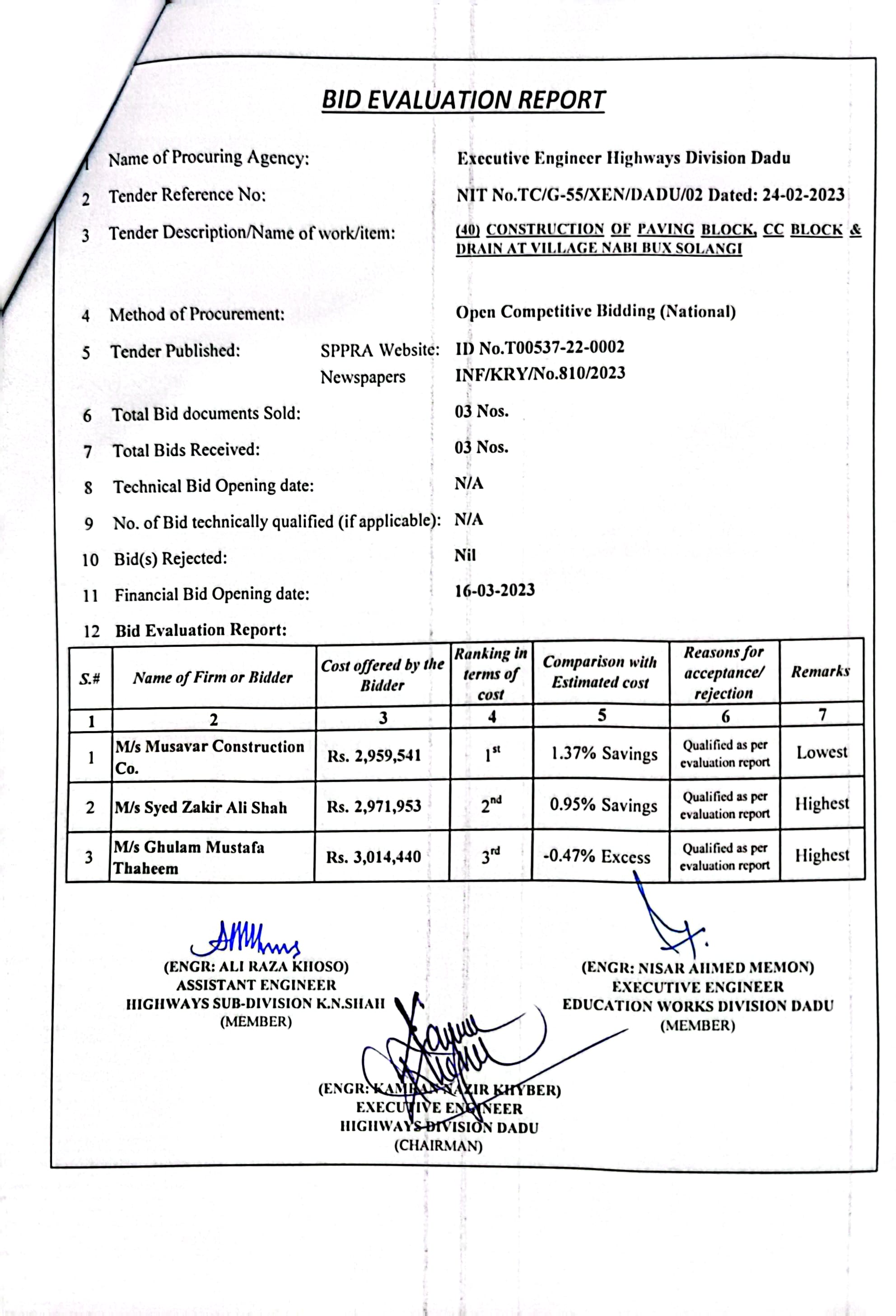 | T00537-22-0002 | BE00537-22-0038 | Construction of Paving Block, CC Block & Drain at village Karimdad Lund & Naban Khan Lund village | Executive Engineer Highway Division Dadu (51-Works and Services Department) | 20-03-2023 | Dadu | Active |