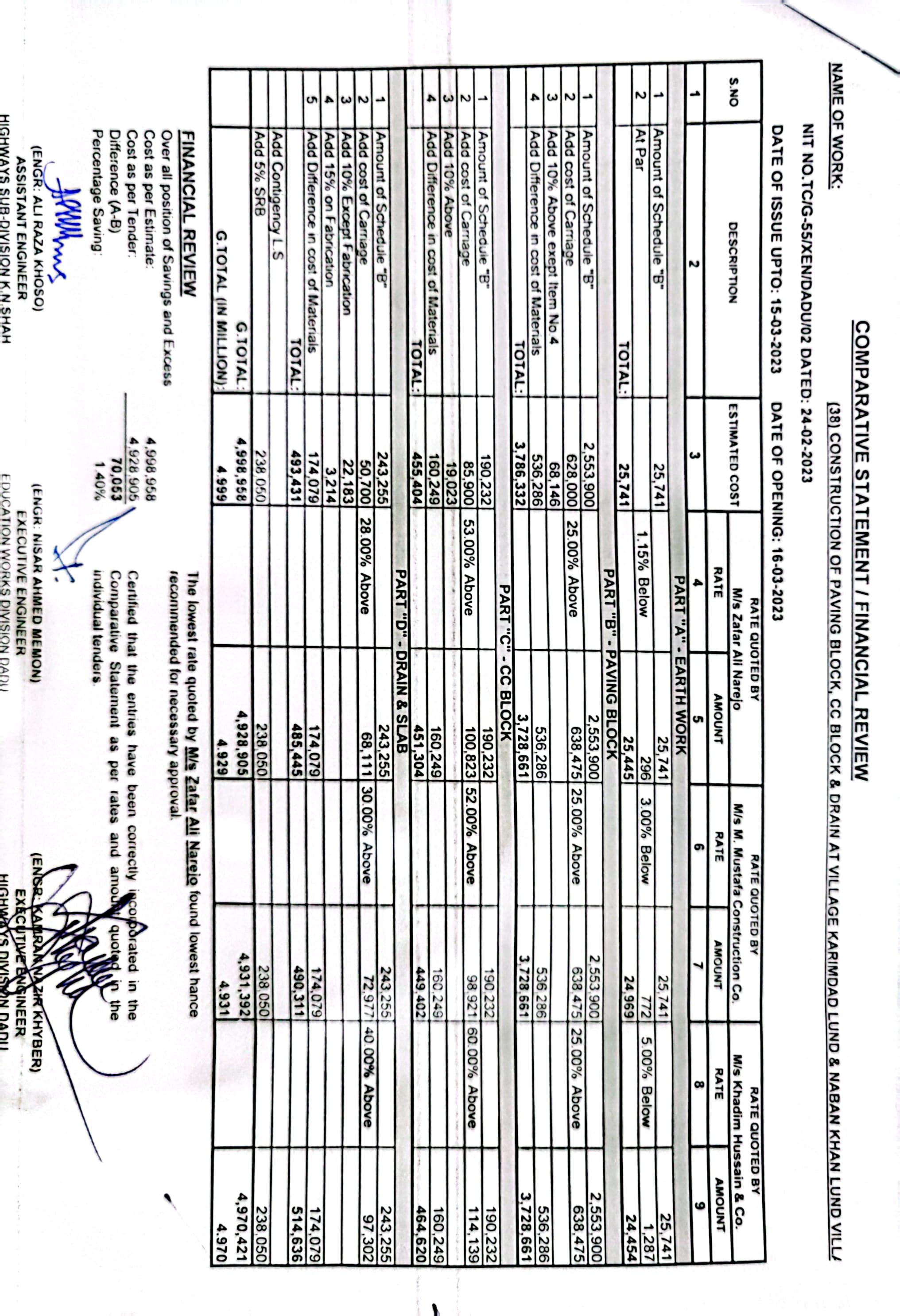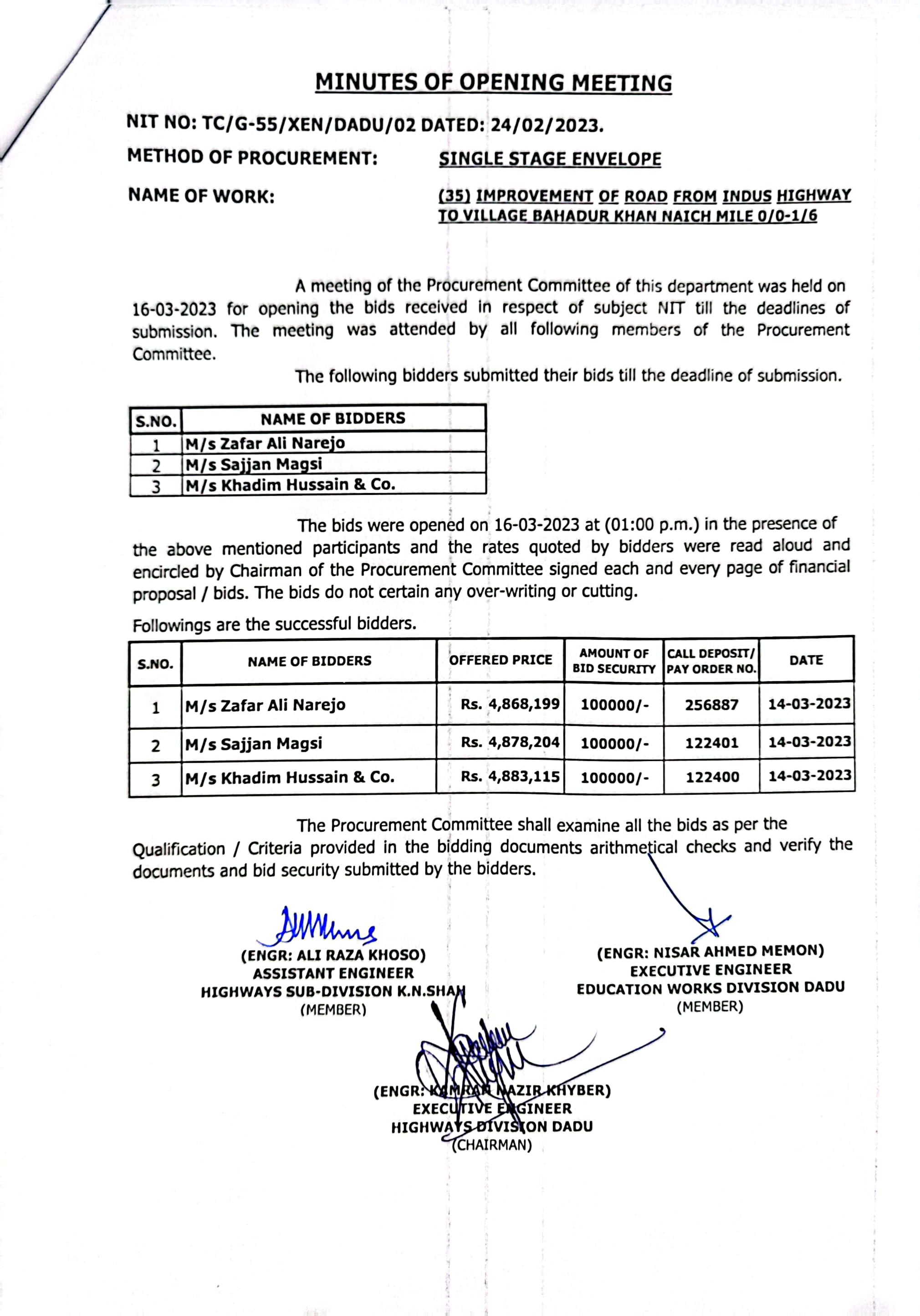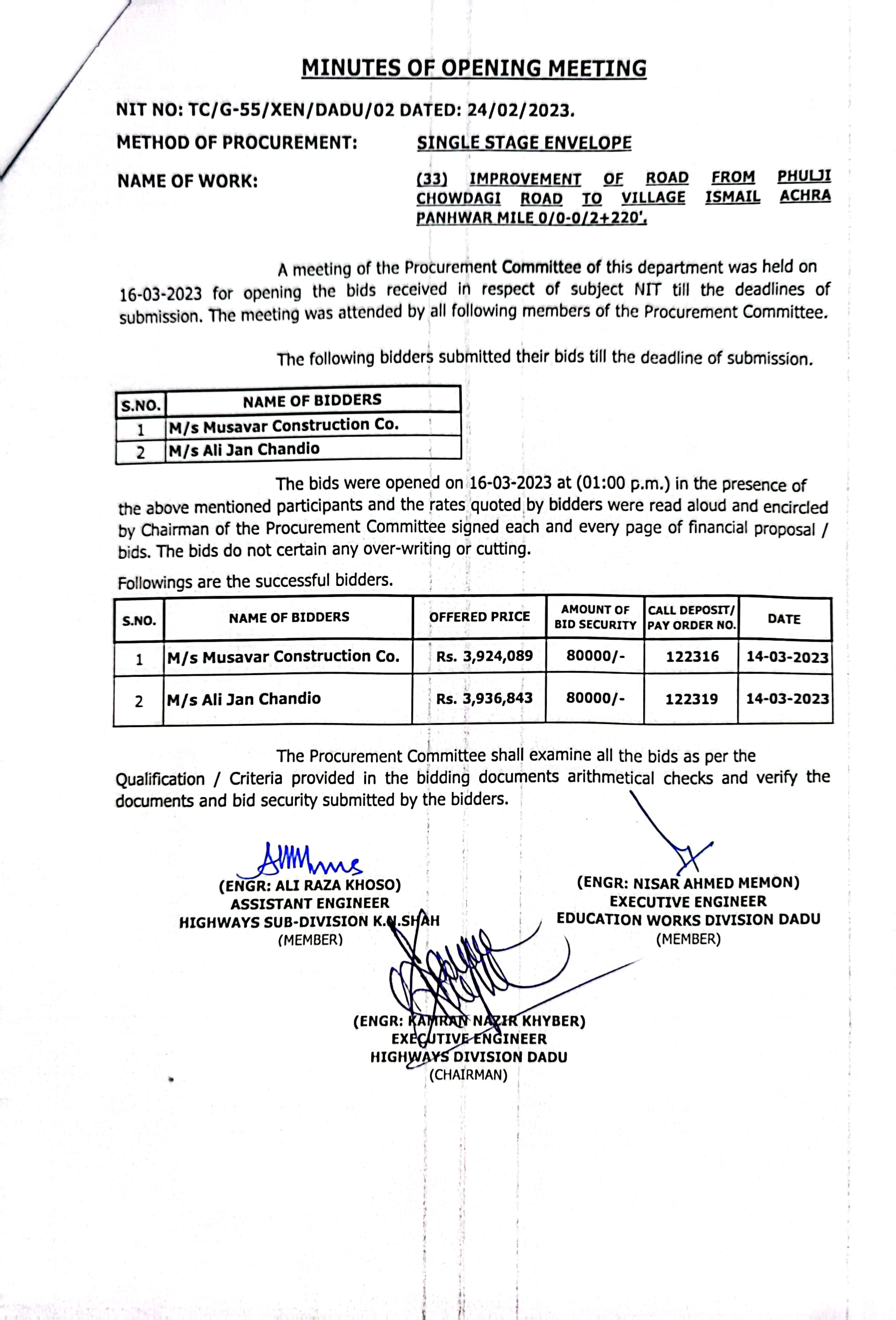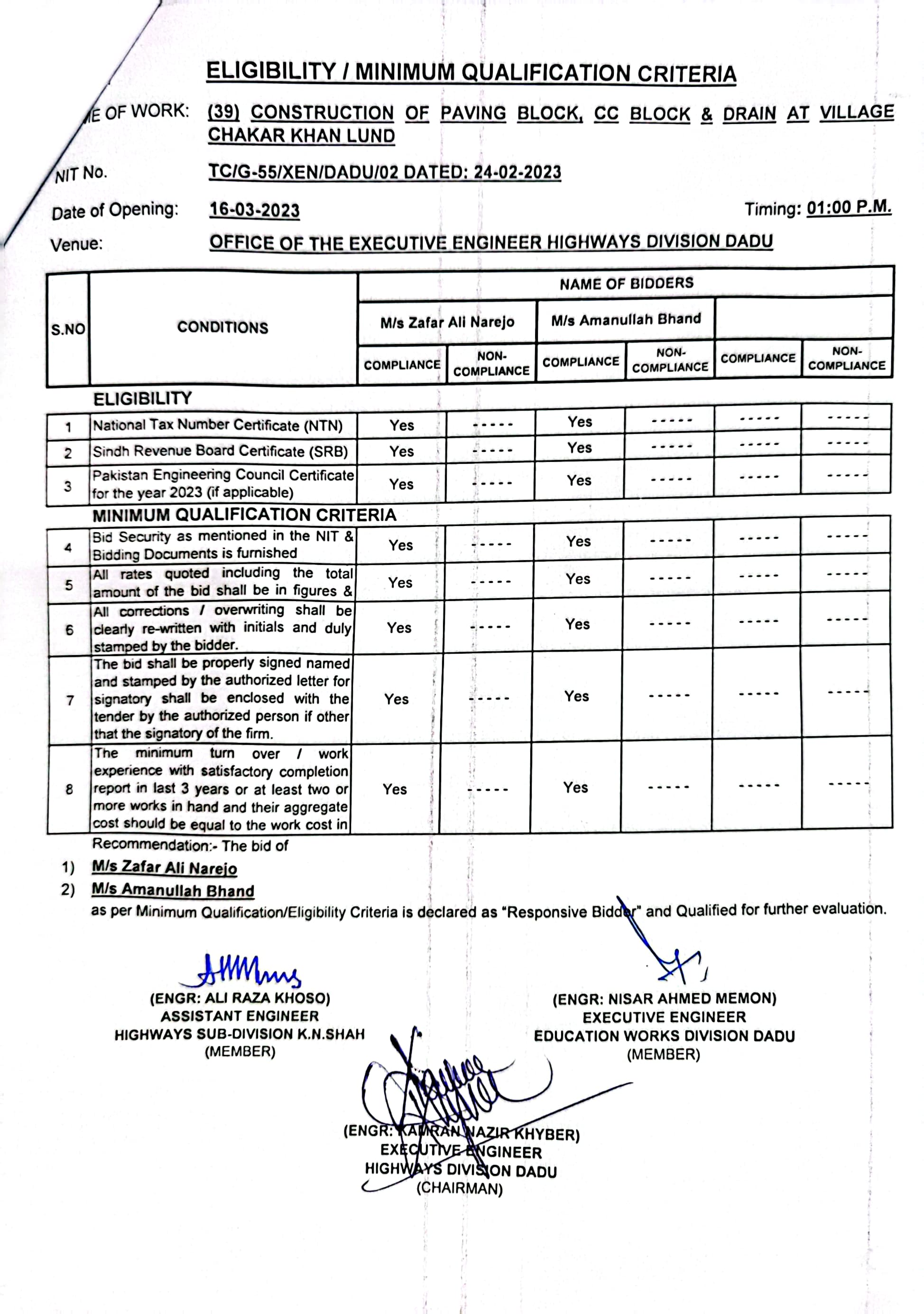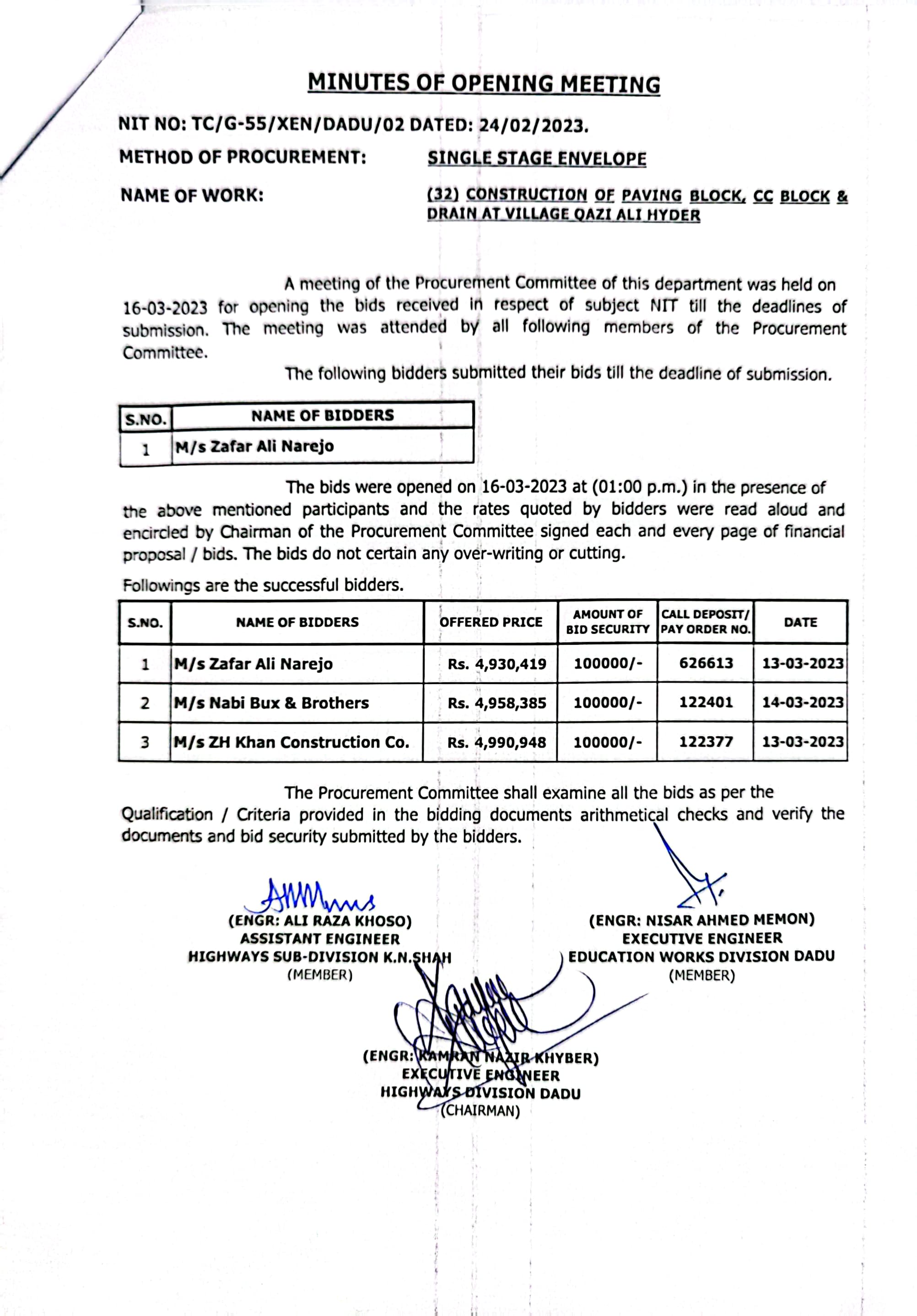 | T00537-22-0002 | BE00537-22-0038 | Construction of Paving Block, CC Block & Drain at village Karimdad Lund & Naban Khan Lund village | Executive Engineer Highway Division Dadu (51-Works and Services Department) | 20-03-2023 | Dadu | Active |