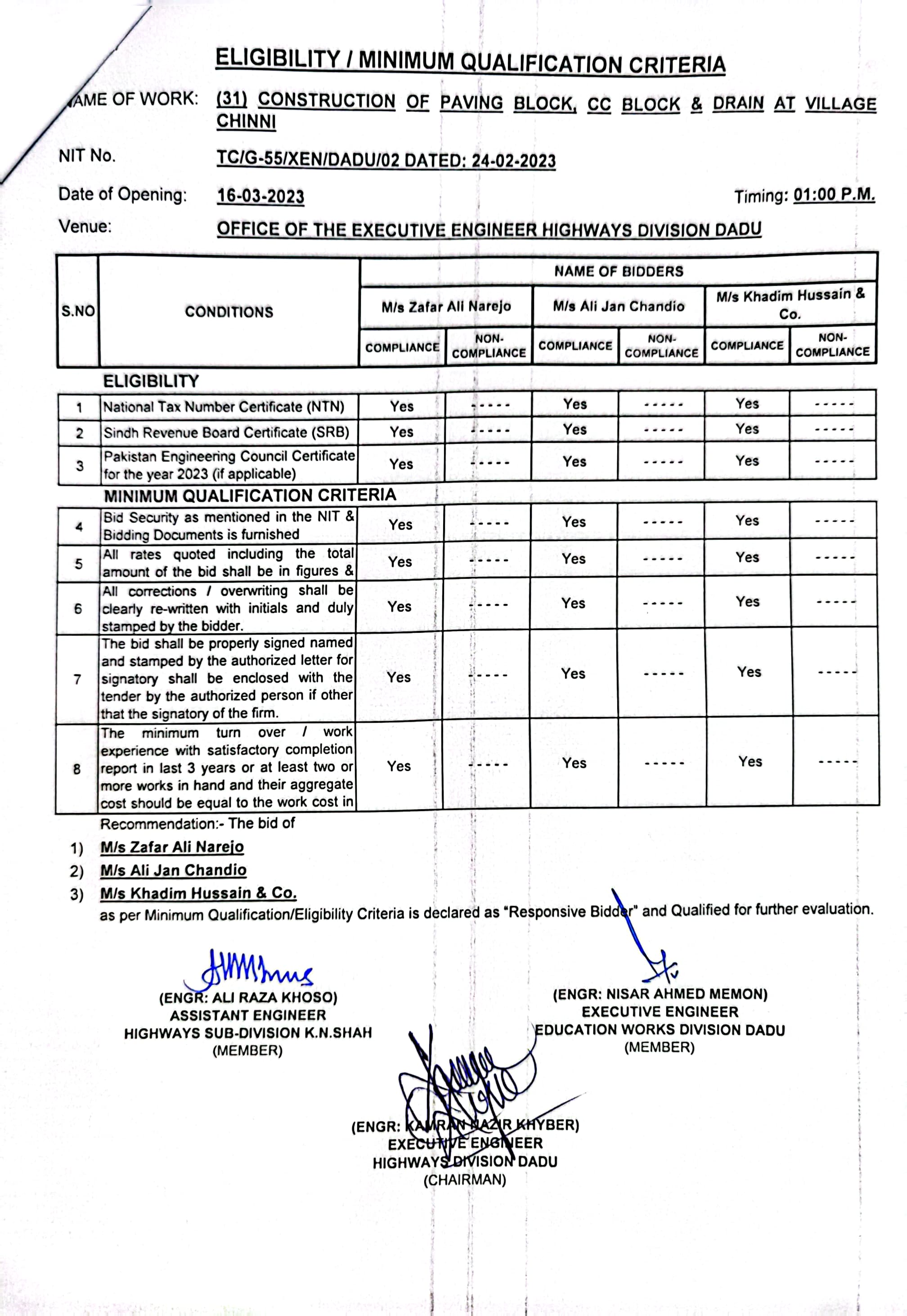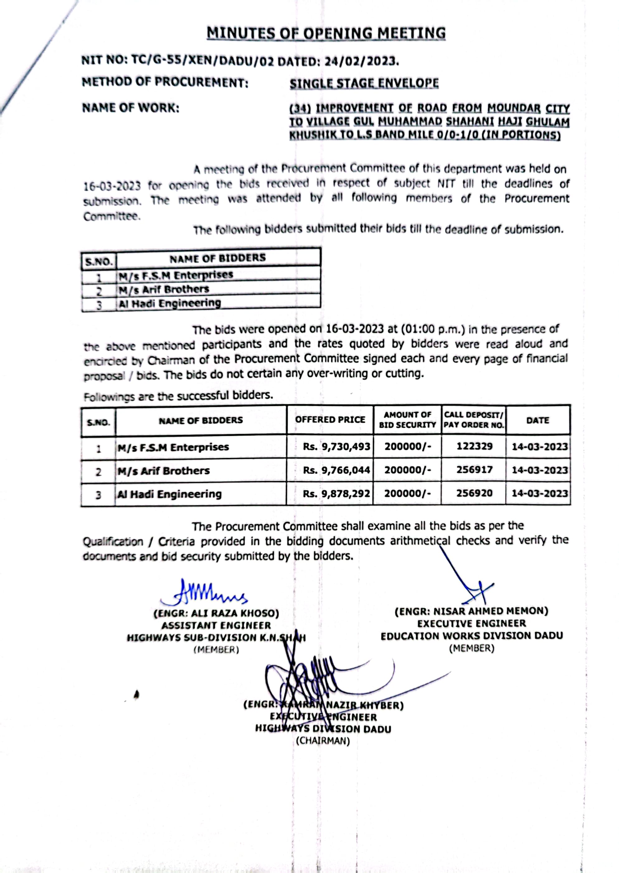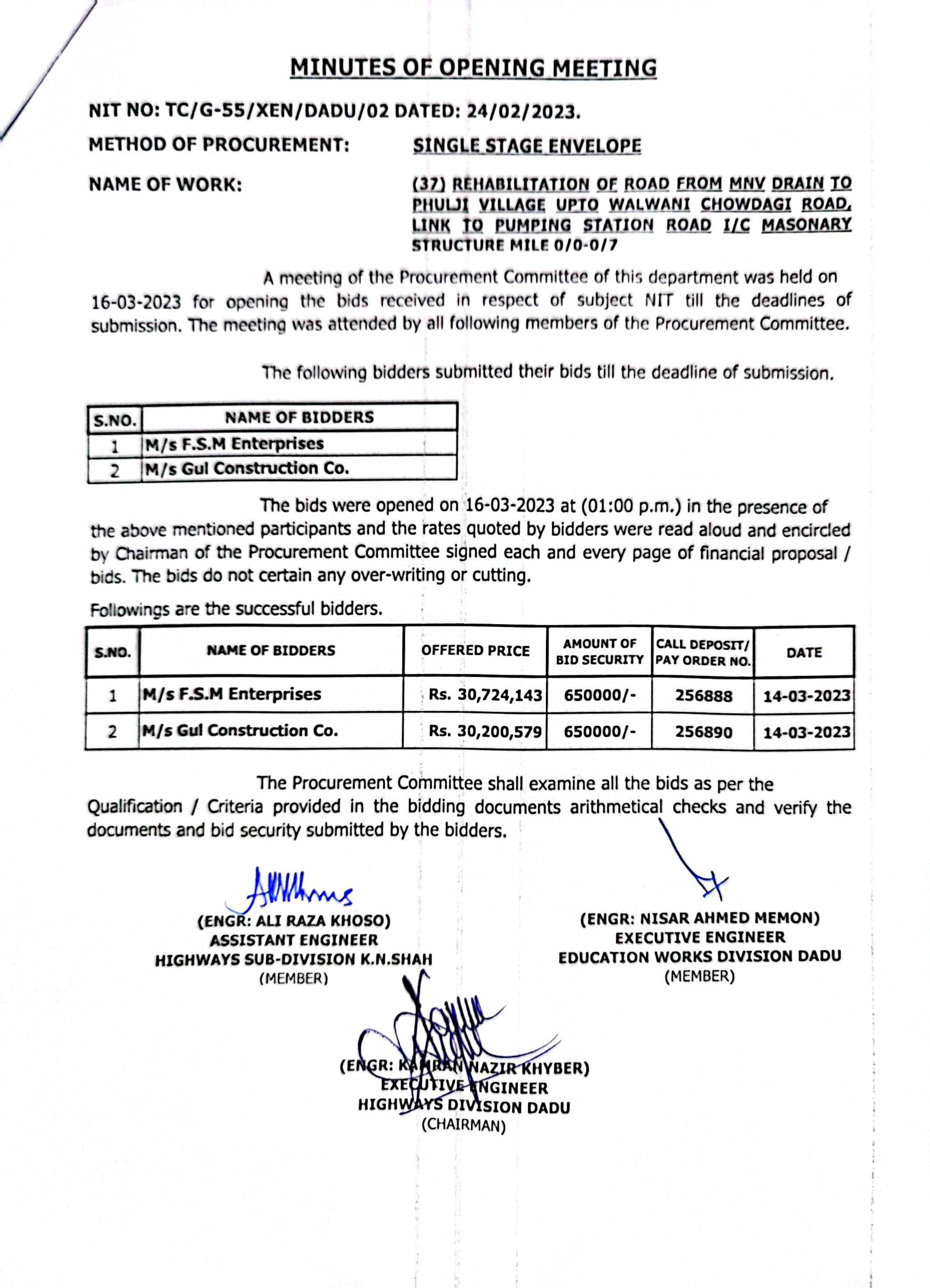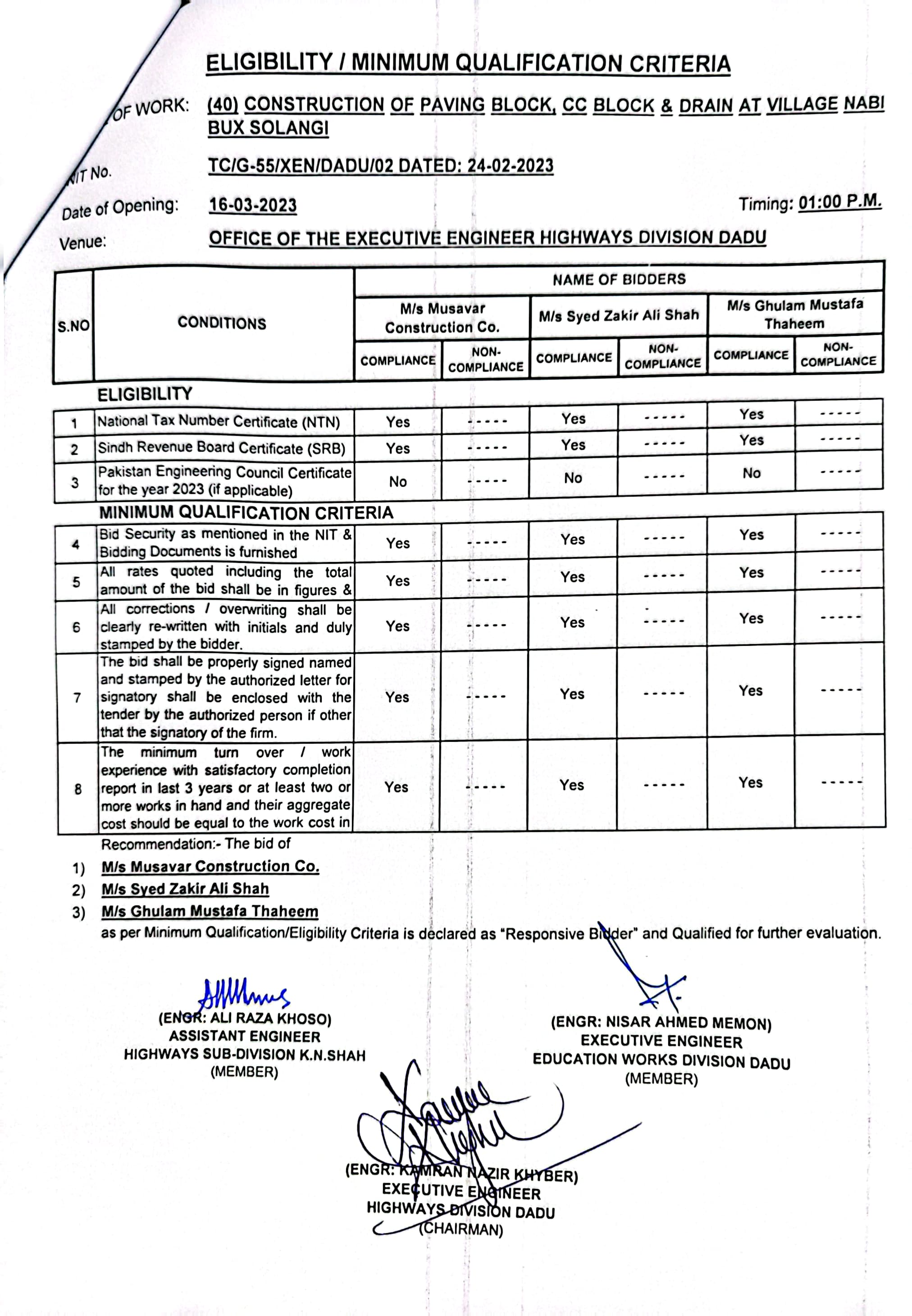 | T00537-22-0002 | BE00537-22-0038 | Construction of Paving Block, CC Block & Drain at village Karimdad Lund & Naban Khan Lund village | Executive Engineer Highway Division Dadu (51-Works and Services Department) | 20-03-2023 | Dadu | Active |