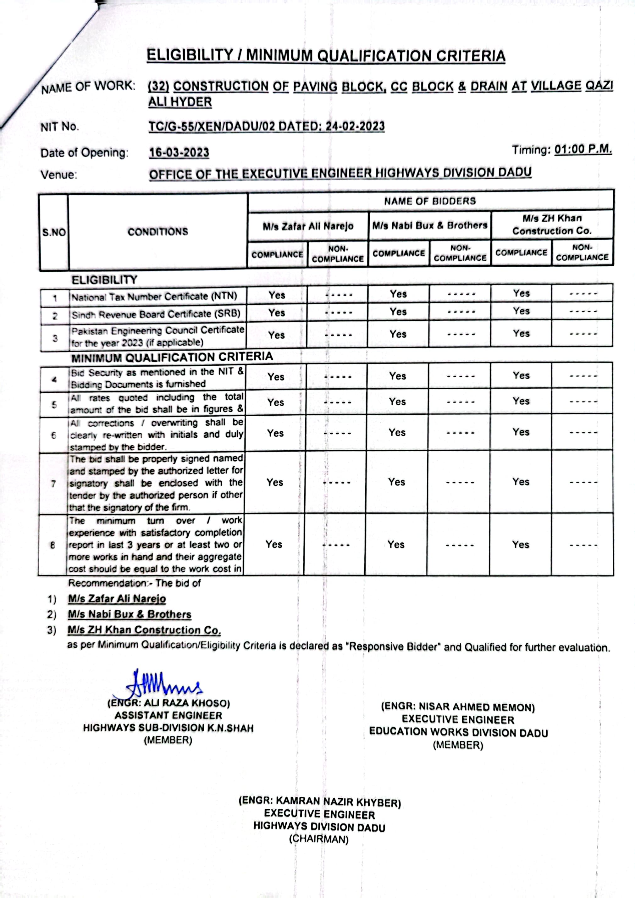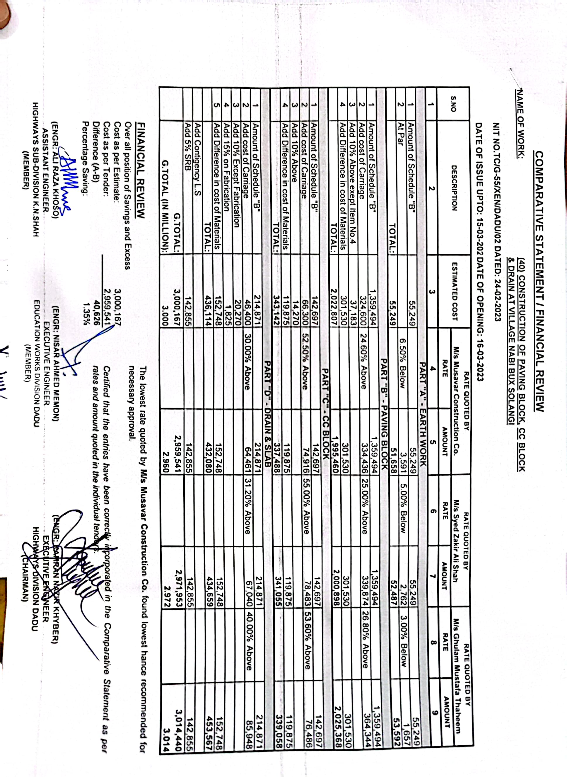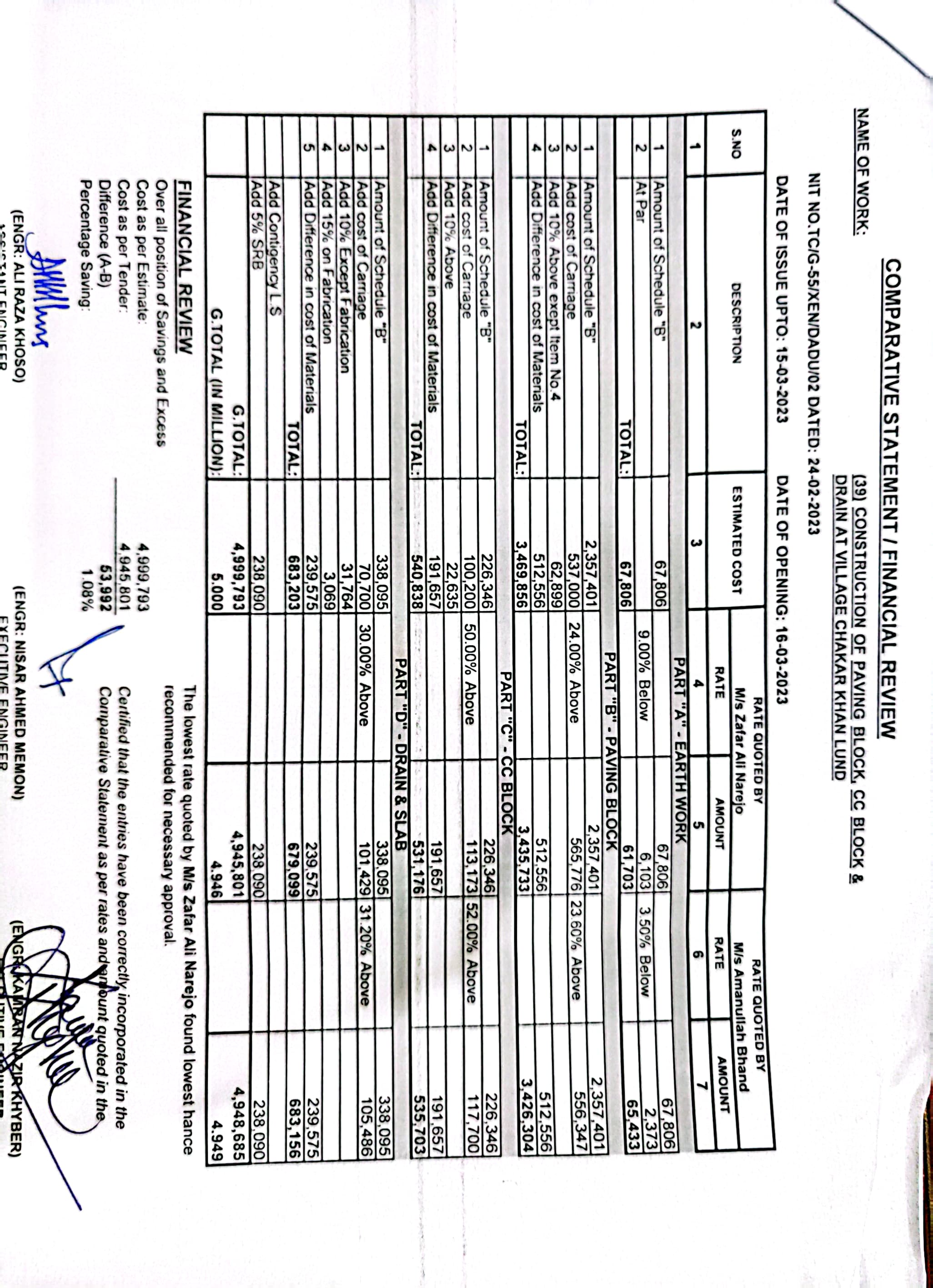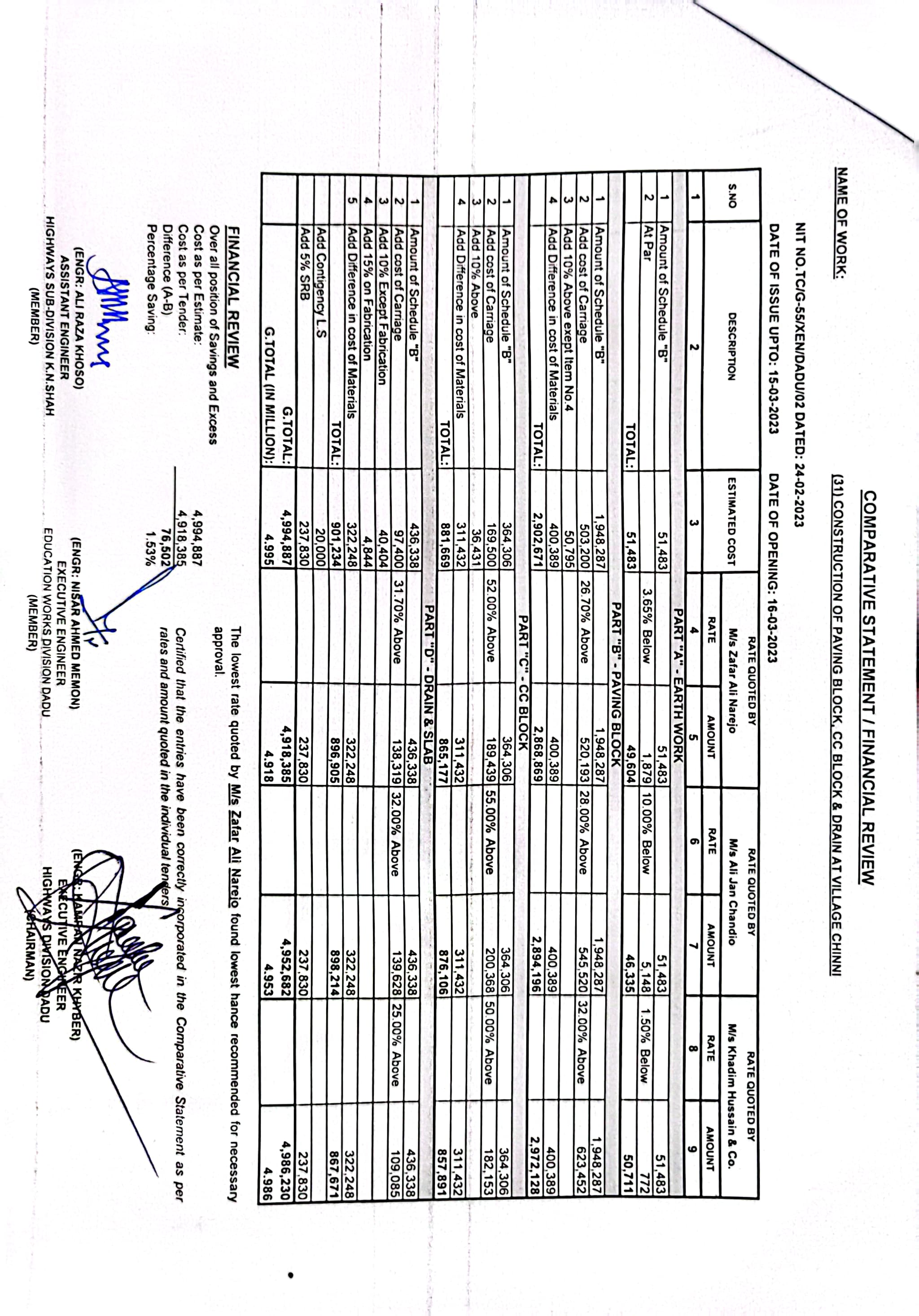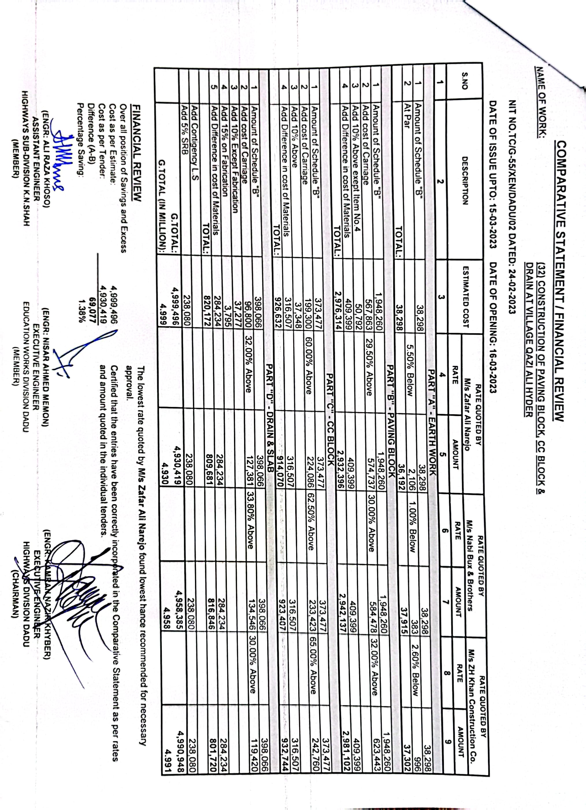 | T00537-22-0002 | BE00537-22-0038 | Construction of Paving Block, CC Block & Drain at village Karimdad Lund & Naban Khan Lund village | Executive Engineer Highway Division Dadu (51-Works and Services Department) | 20-03-2023 | Dadu | Active |