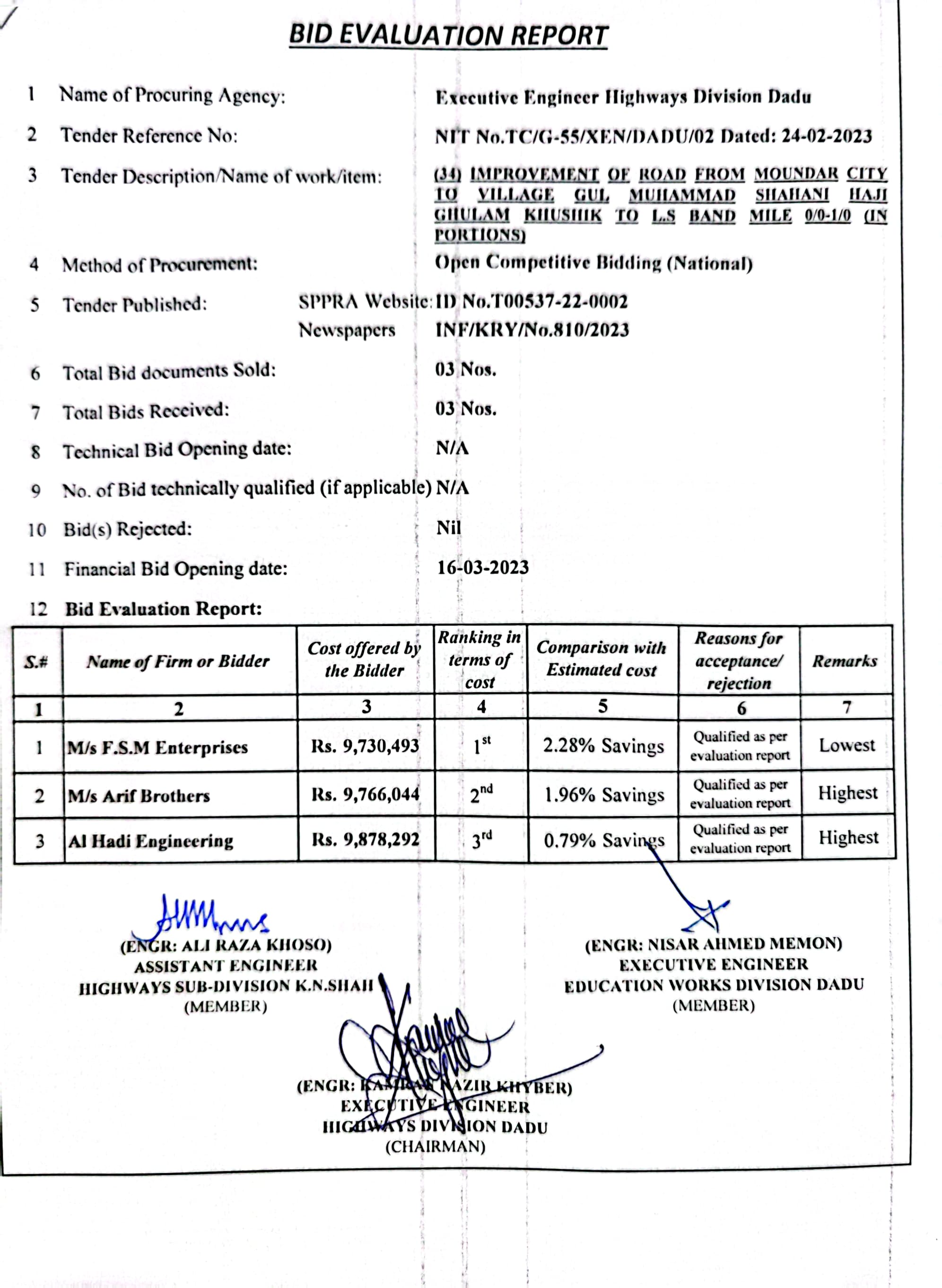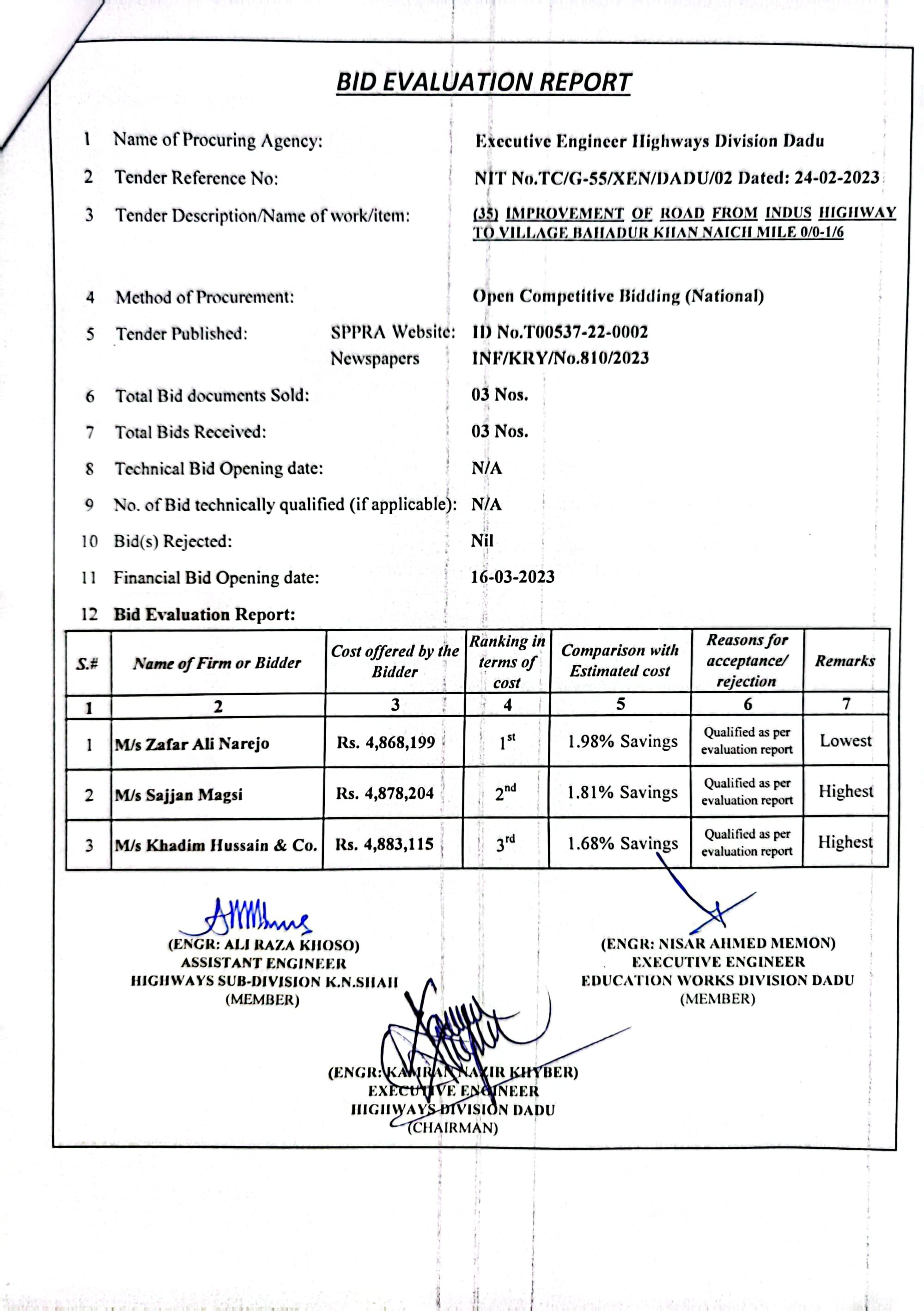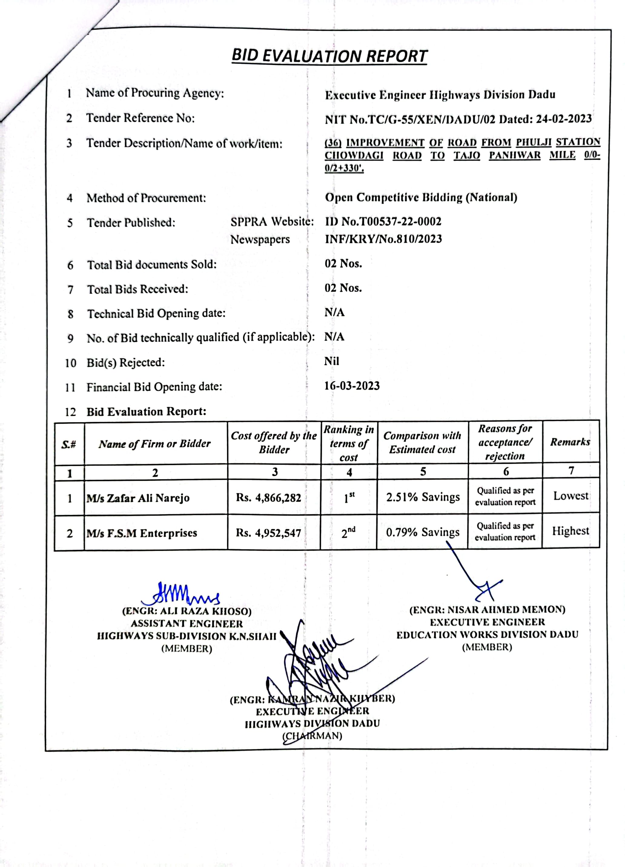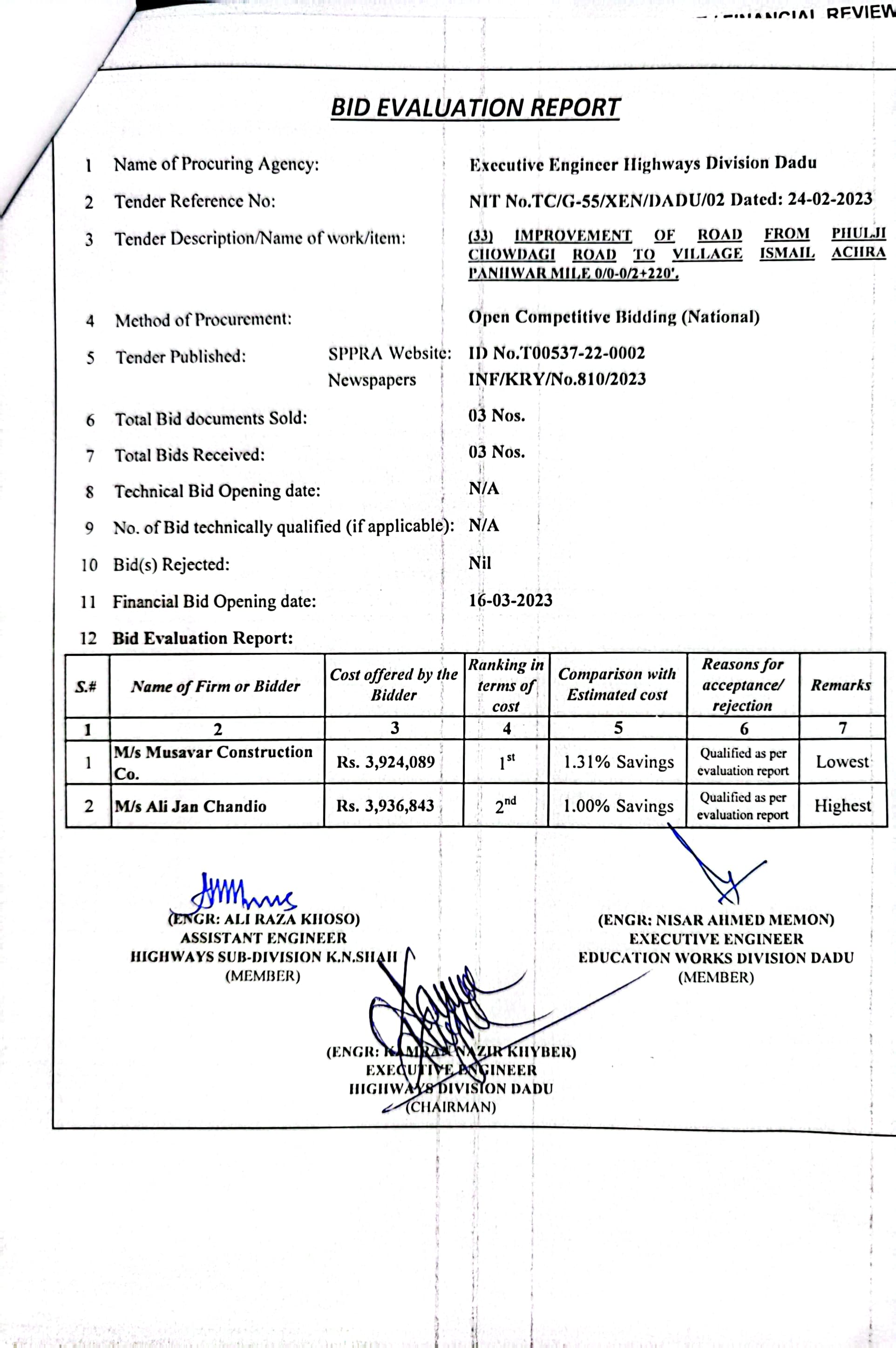| T00537-22-0002 | BE00537-22-0035 | 35.Improvement of road from Phulji Station Chowdagi road to Tajo Panhwar mile 0/0-0/2+330'. | Executive Engineer Highway Division Dadu (51-Works and Services Department) | 20-03-2023 | Dadu | Active |