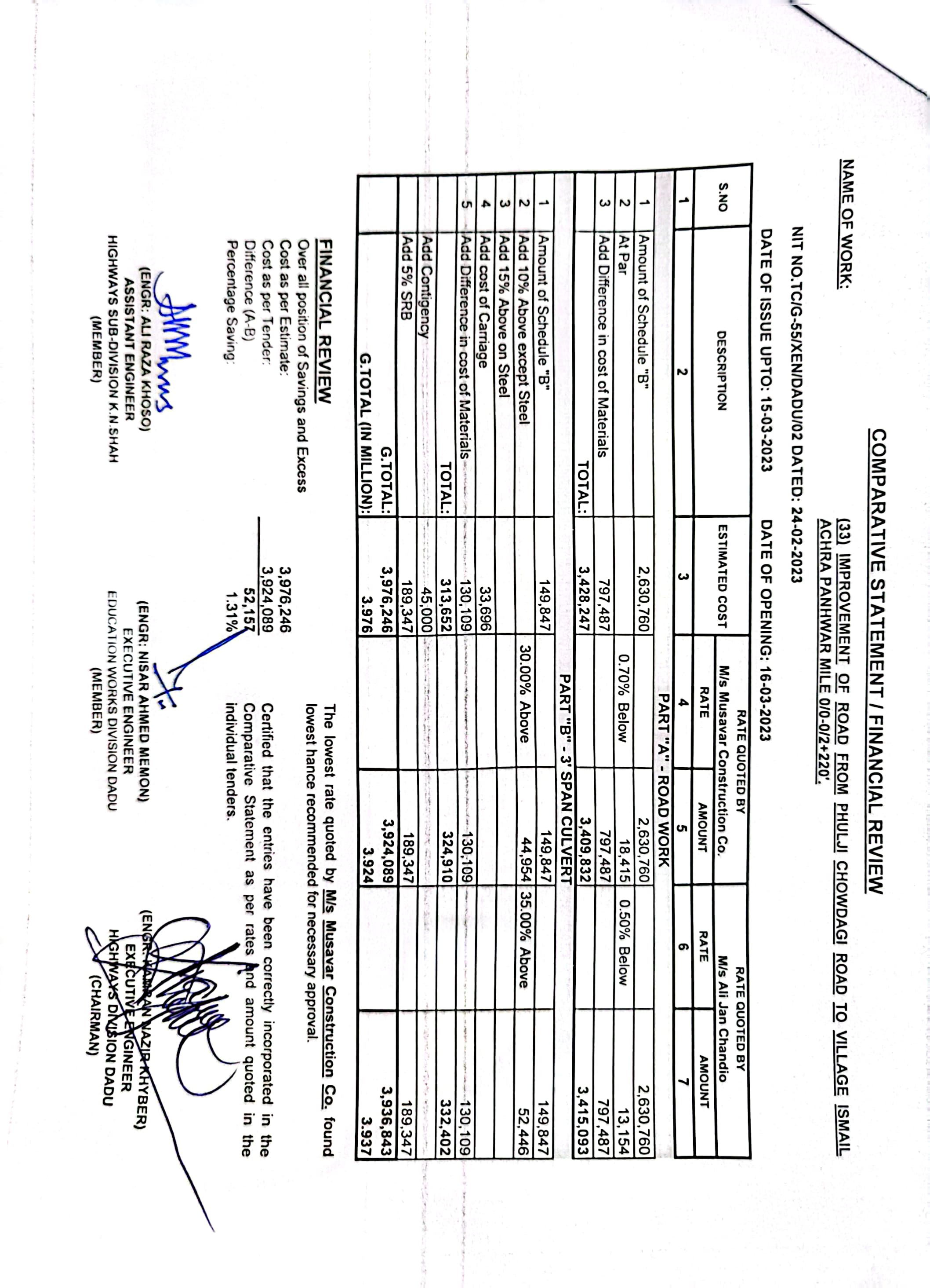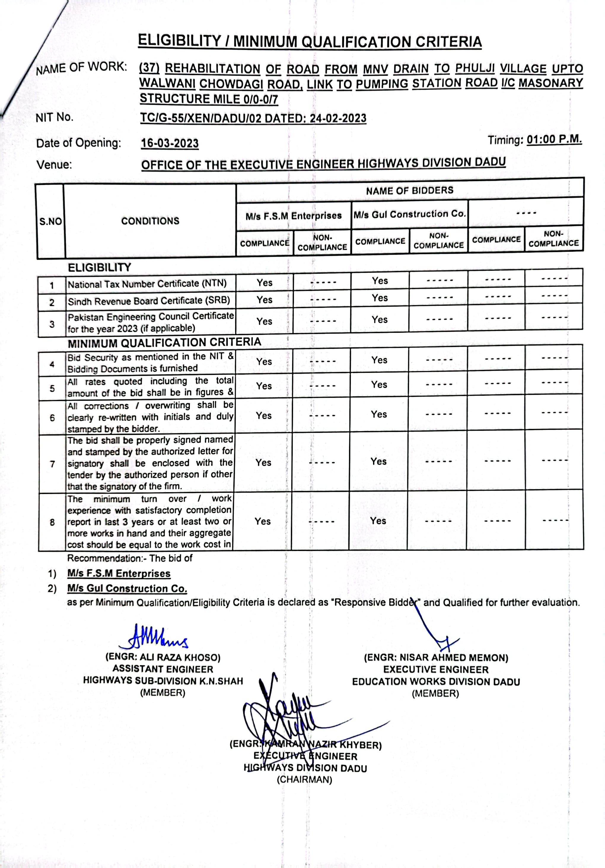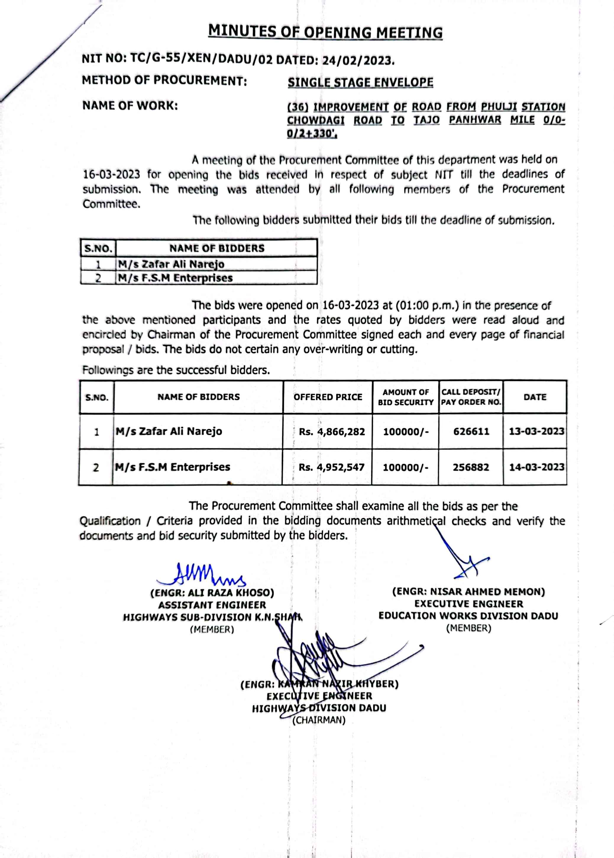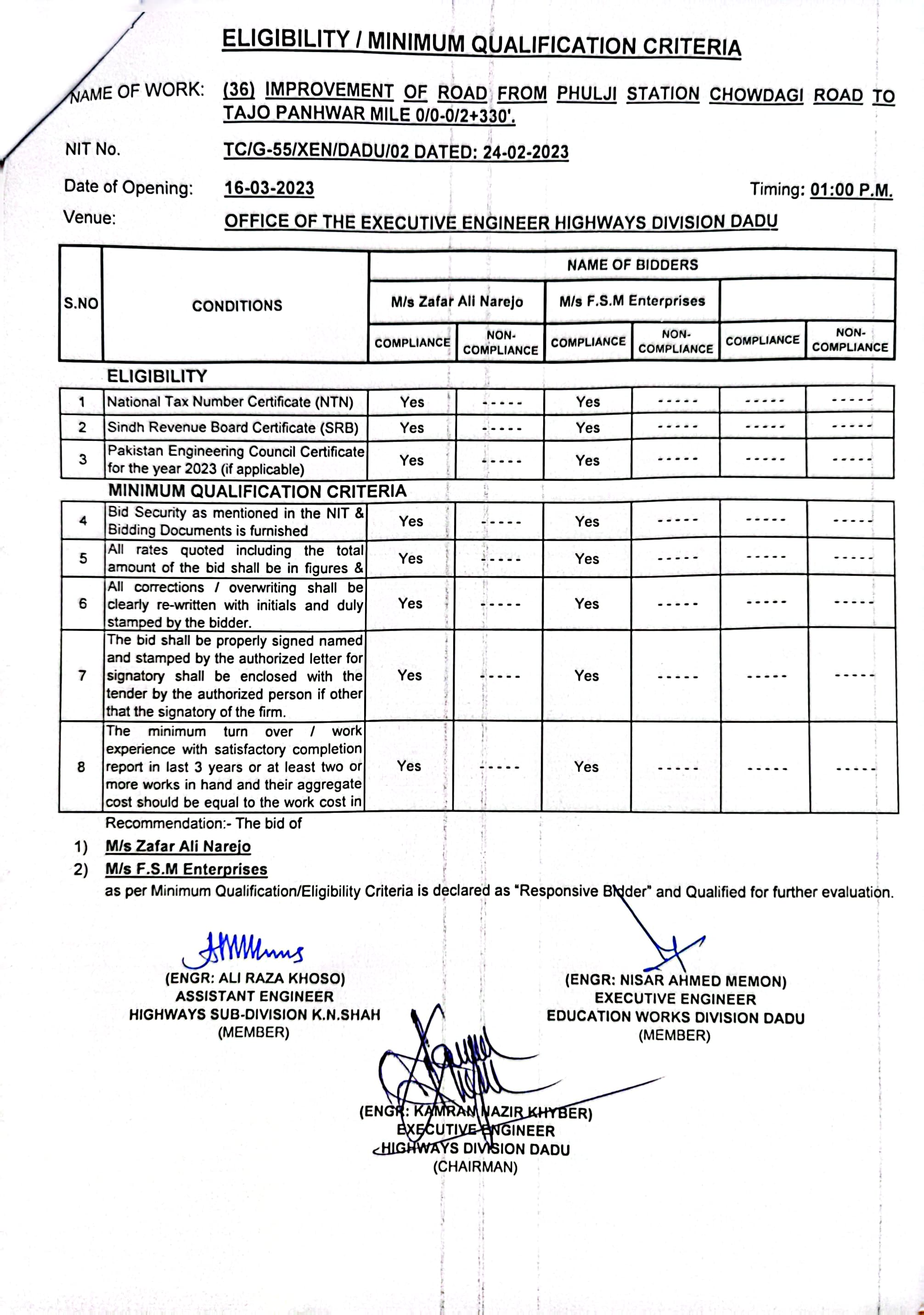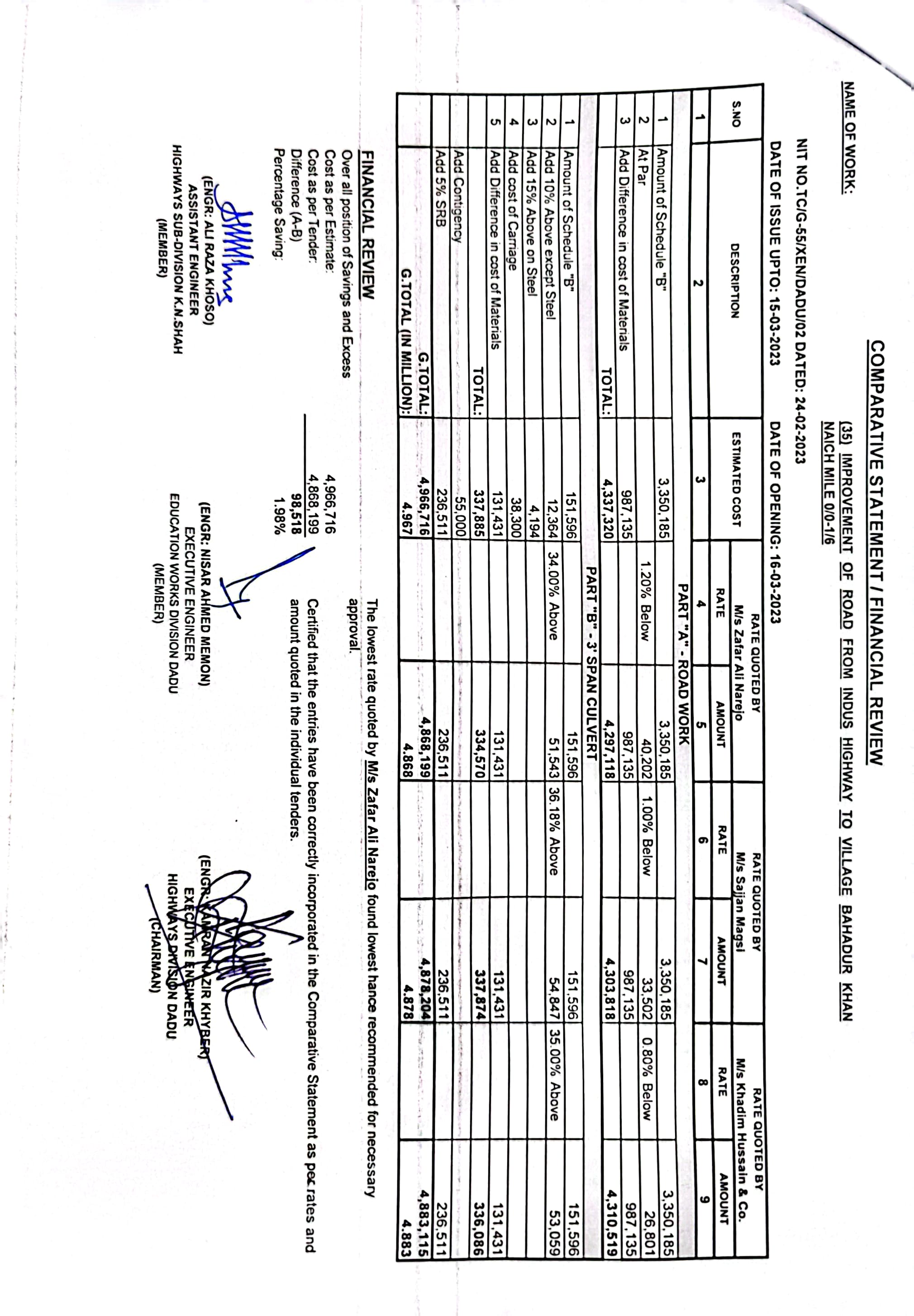 | T00537-22-0002 | BE00537-22-0035 | 35.Improvement of road from Phulji Station Chowdagi road to Tajo Panhwar mile 0/0-0/2+330'. | Executive Engineer Highway Division Dadu (51-Works and Services Department) | 20-03-2023 | Dadu | Active |