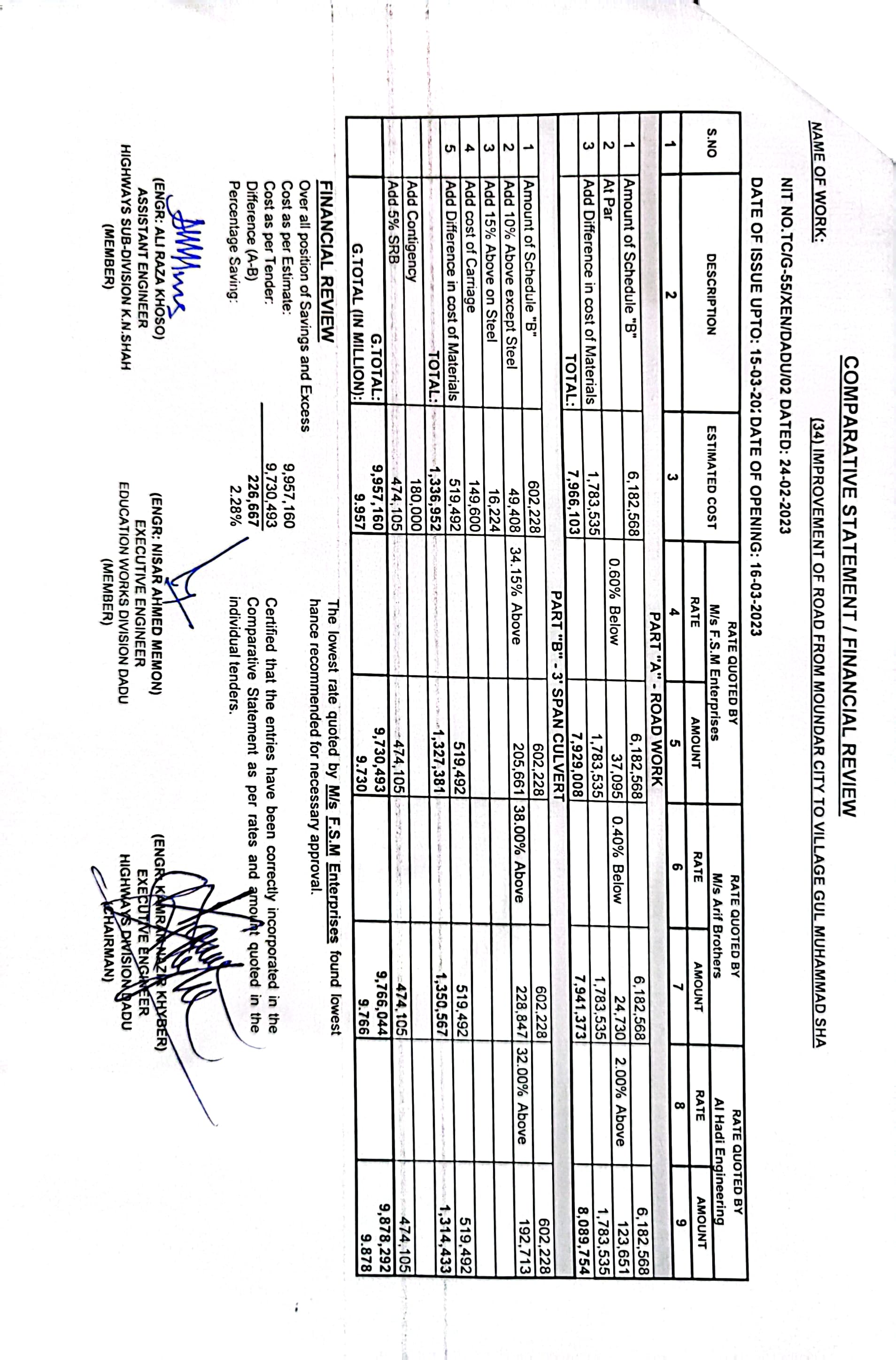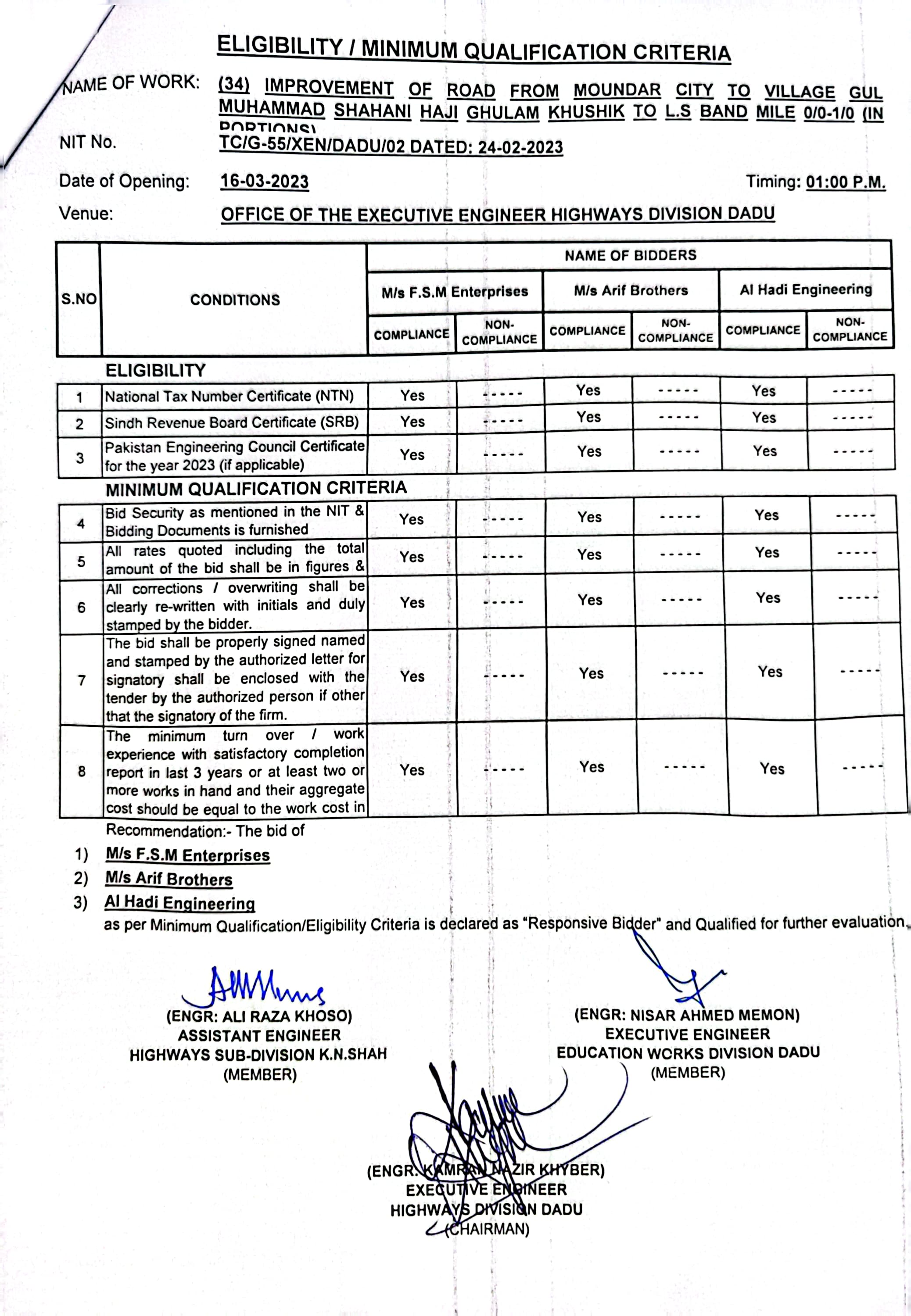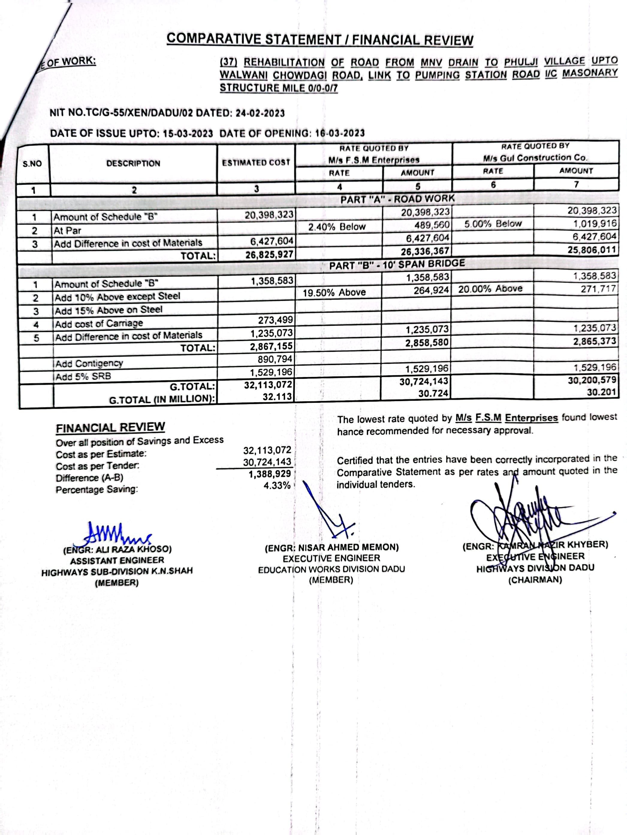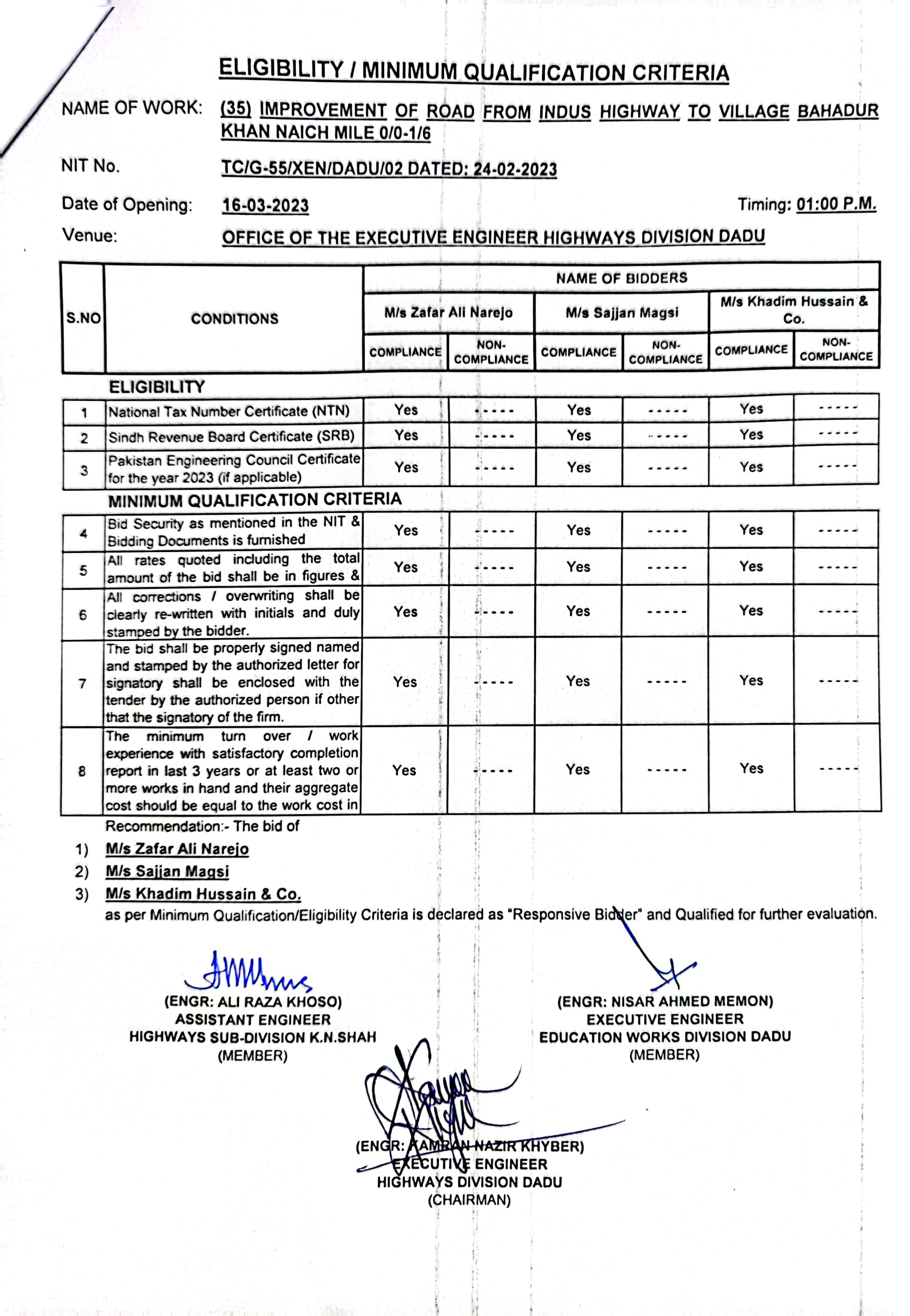 | T00537-22-0002 | BE00537-22-0035 | 35.Improvement of road from Phulji Station Chowdagi road to Tajo Panhwar mile 0/0-0/2+330'. | Executive Engineer Highway Division Dadu (51-Works and Services Department) | 20-03-2023 | Dadu | Active |
