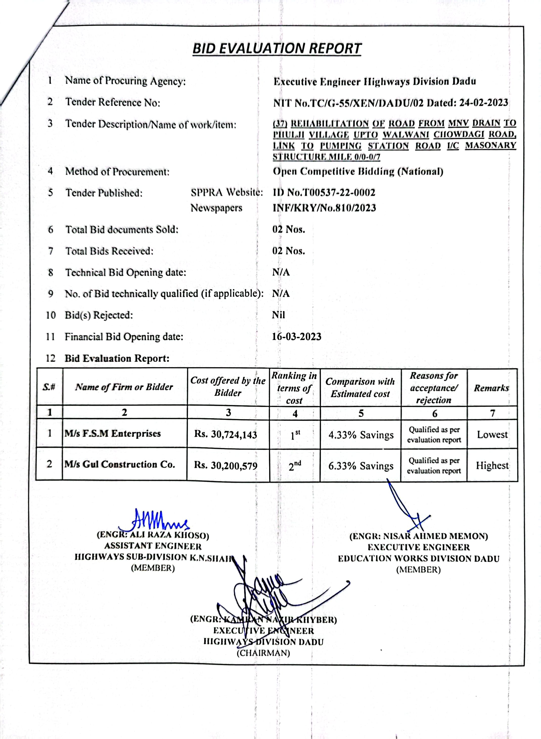 | T00537-22-0002 | BE00537-22-0037 | 37.Rehabilitation of road from MNV Drain to Phulji village upto Walwani Chowdagi road, link to Pumping Station Road i/c Masonary Structure mile 0/0-0/7 | Executive Engineer Highway Division Dadu (51-Works and Services Department) | 20-03-2023 | Dadu | Active |