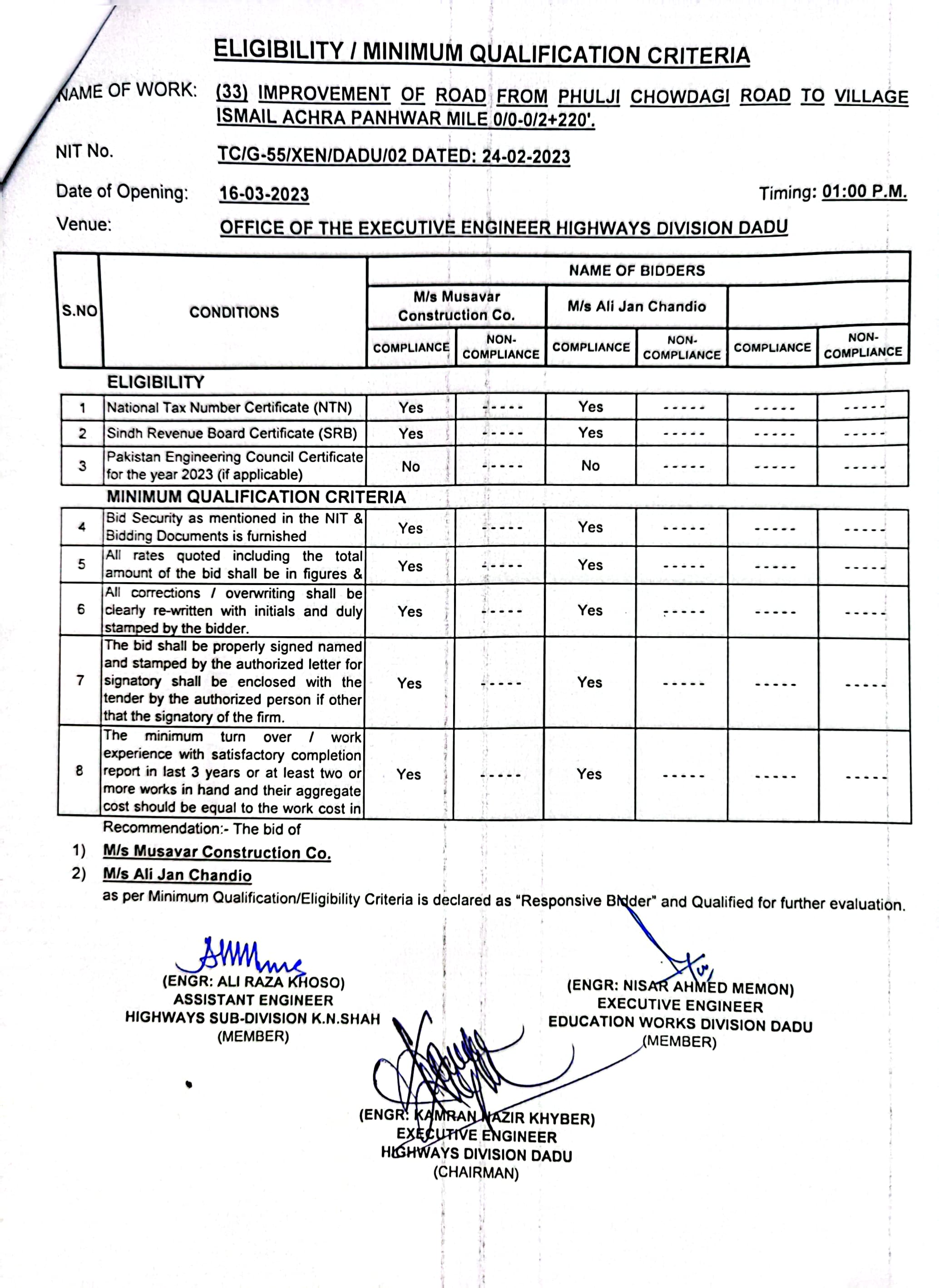 | T00537-22-0002 | BE00537-22-0033 | 33.Improvement of road from Phulji Chowdagi road to village Ismail Achra Panhwar mile 0/0-0/2+220'. | Executive Engineer Highway Division Dadu (51-Works and Services Department) | 20-03-2023 | Dadu | Active |